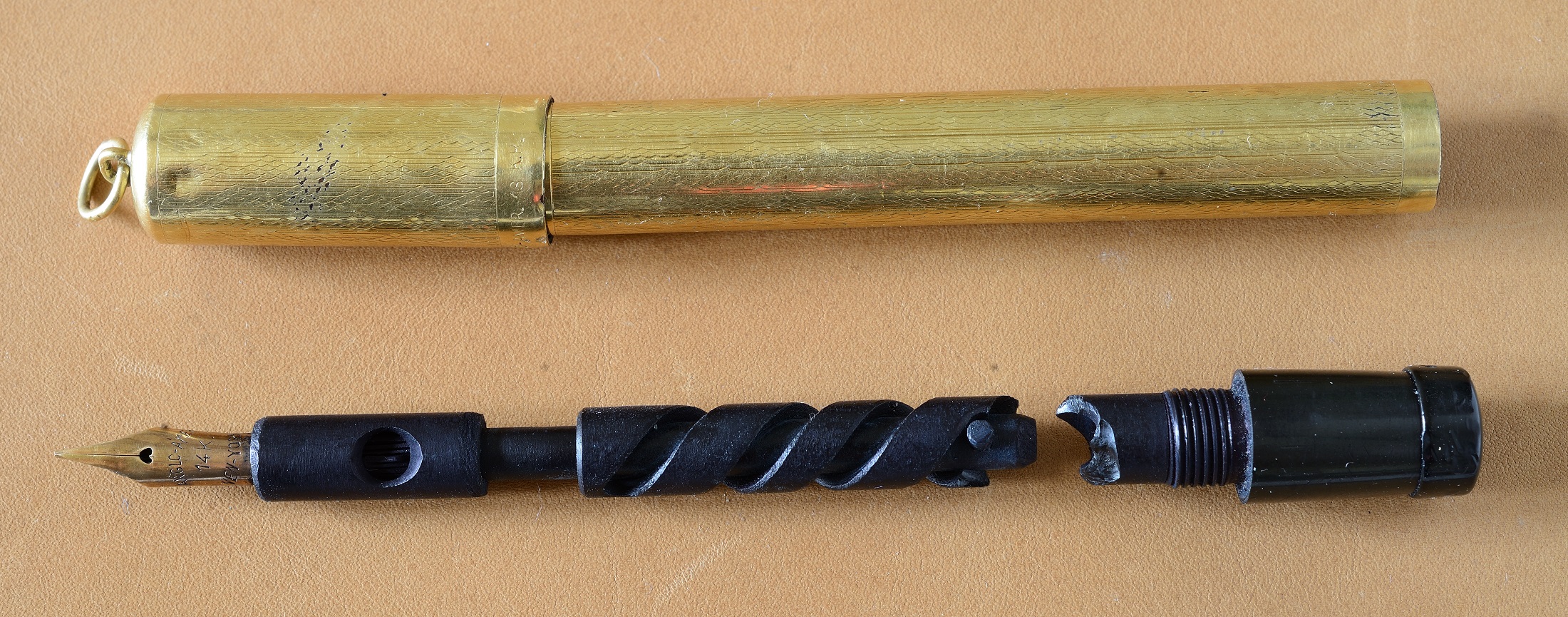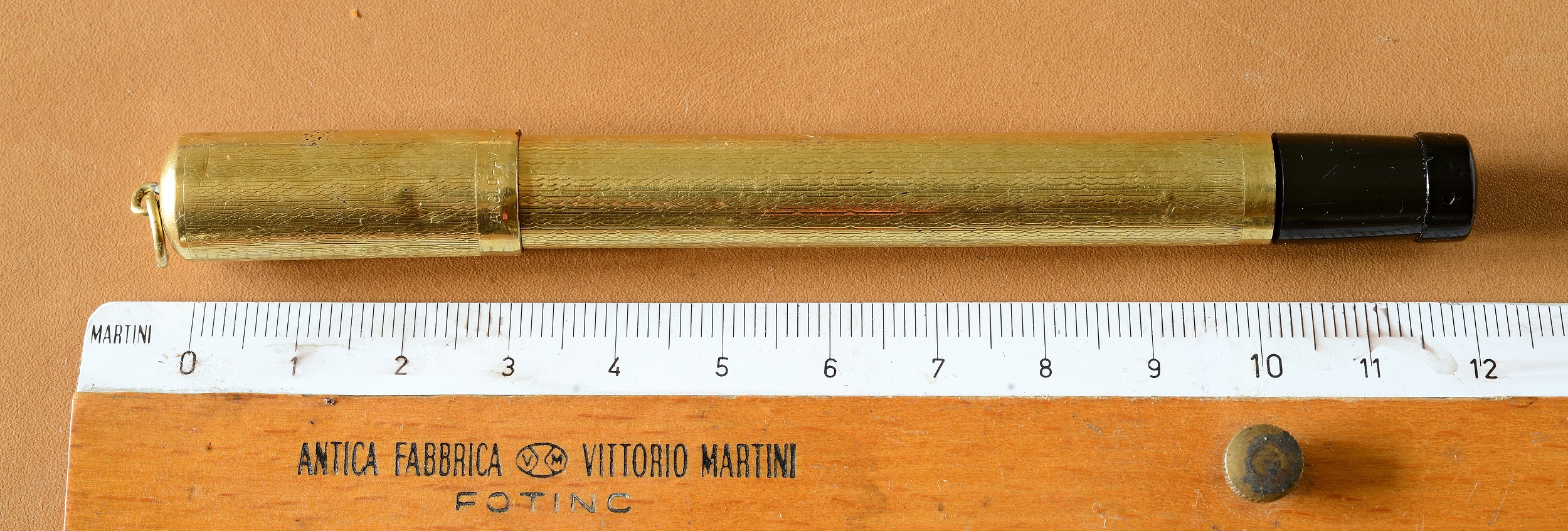ANGLO-AMER produzione FRATELLI CAVALIERE, rientrante misura grande (senior), in ebanite con rivestimento laminato oro 18 K.R., pennino mancante, primi anni 1930, Milano - Italia. L'iscrizione