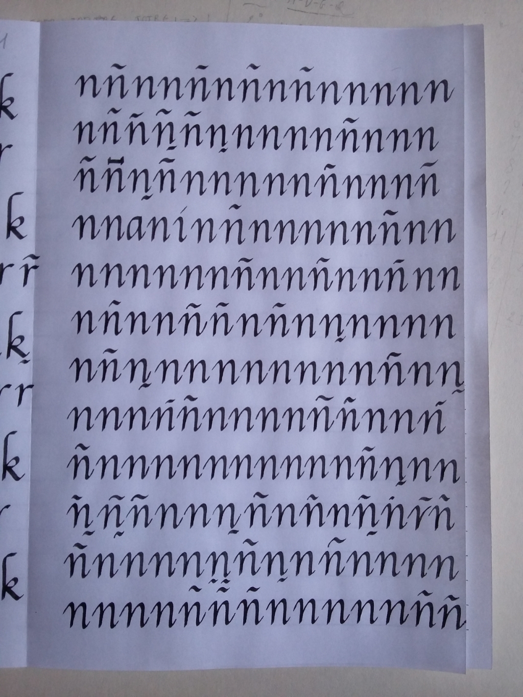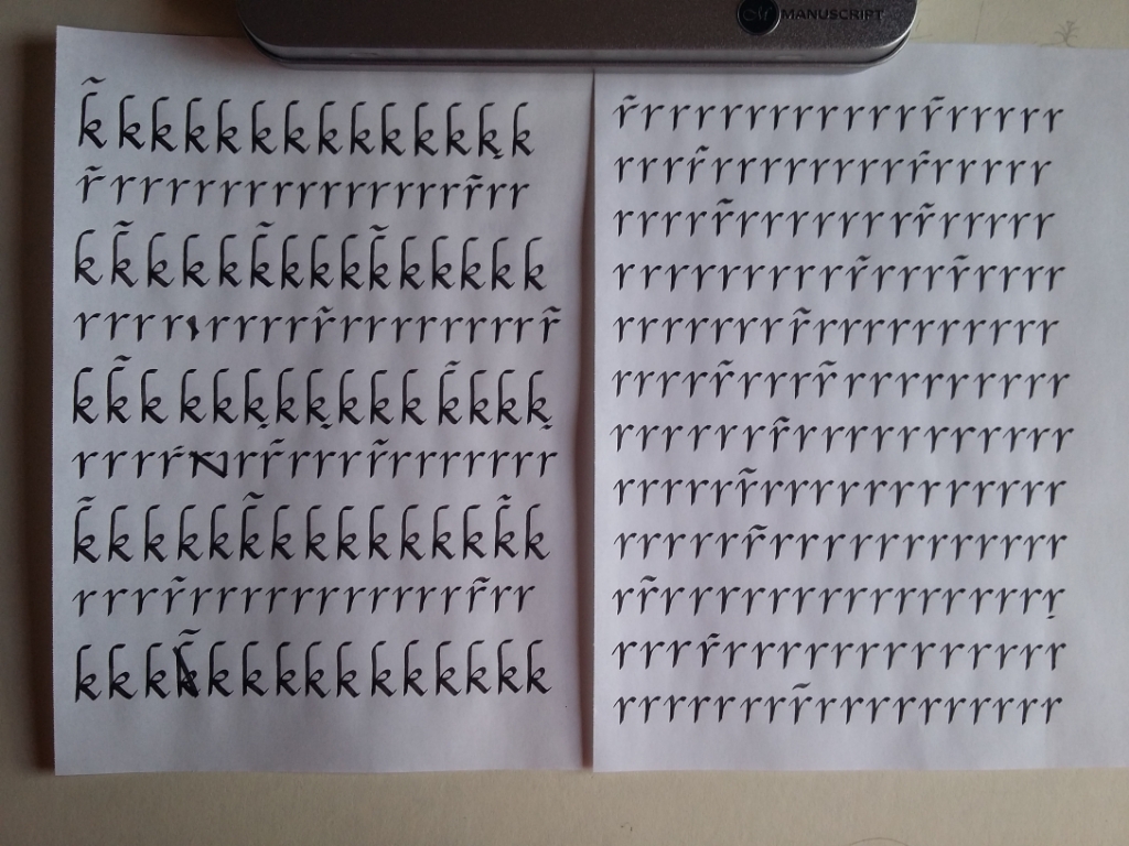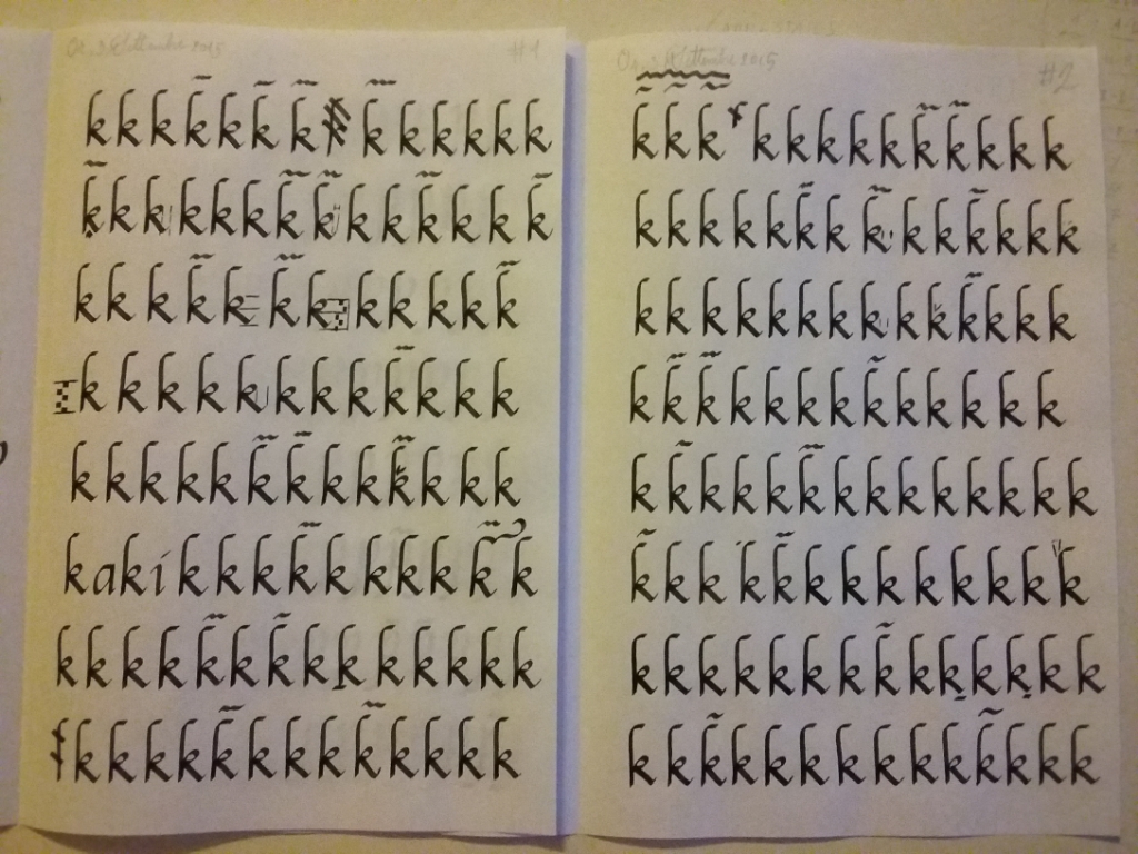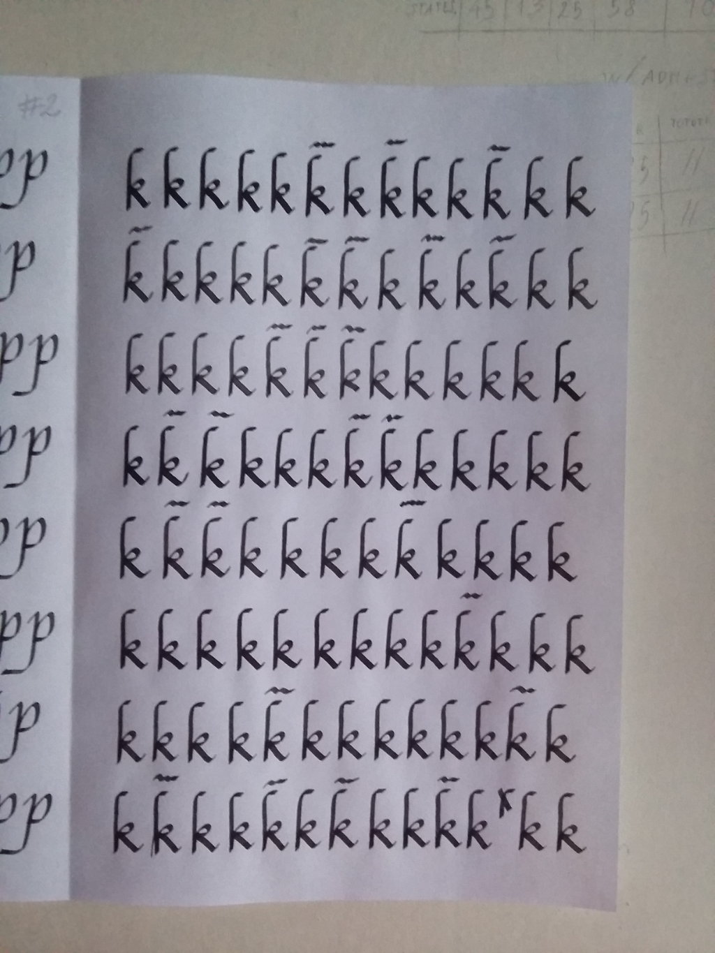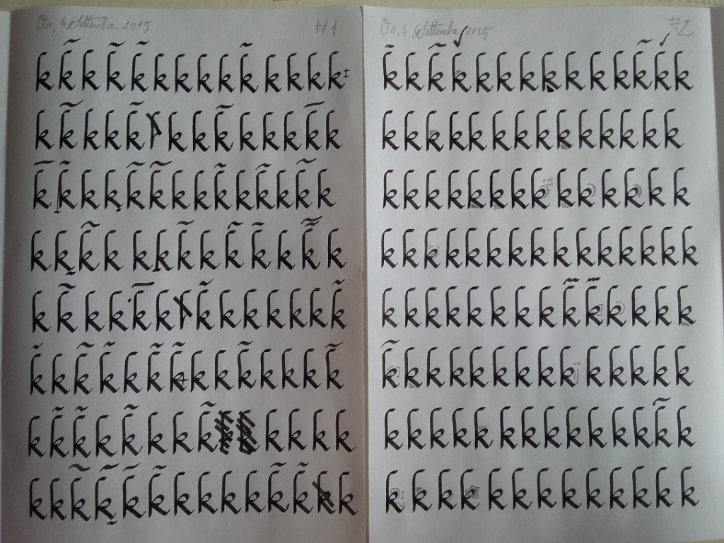 Ancora dubito sulle dimensioni degli occhielli delle k, che trovo migliori dopo le prime righe, e devo lavorare sul bilanciamento tra occhiello e gamba.