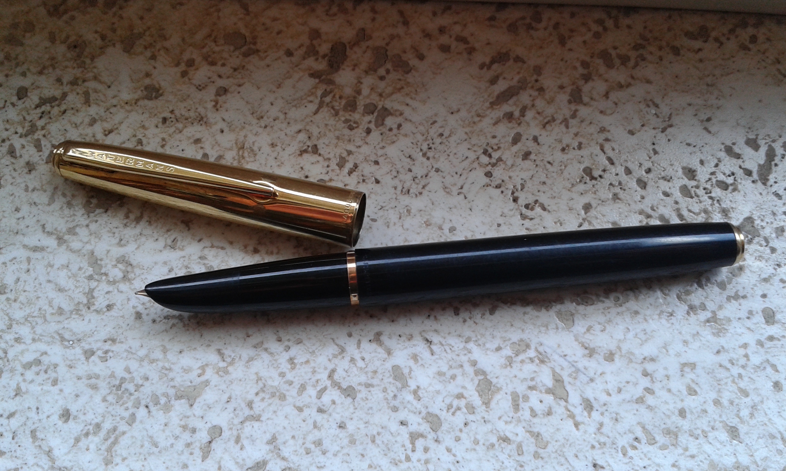 Alcune domande su una Waterman che non riesco ad identificare, pennino oro, caricamento cartuccia(?); e su una penna per stiloforo Sheaffer, pennino oro 585 bicolore marchiato Sheaffer, di cui ignoro il sistema di caricamento inchiostro; stilo Ero caricamento a stantuffo pennino laminato oro marchiato Ero; intramontabile Aurora 88P con cappuccio nichelato; Minerva 60 produzione Omas pennino oro 585 nuova con scatola, contro scatola e istruzione per l'uso; Omas extra nuova con scatola e garanzia pennino laminato oro e marchiato Omas; parure Pelikan con penna biro e stilo mai usata, M205 con pennino Pelikan oro 585 e biro K200. Ed infine nuova mai inchiostrata con scatola d'epoca (anche se mancante la matita meccanica in abbinamento) una Eversharp Doric adjustable nib, pennino oro 14k.
