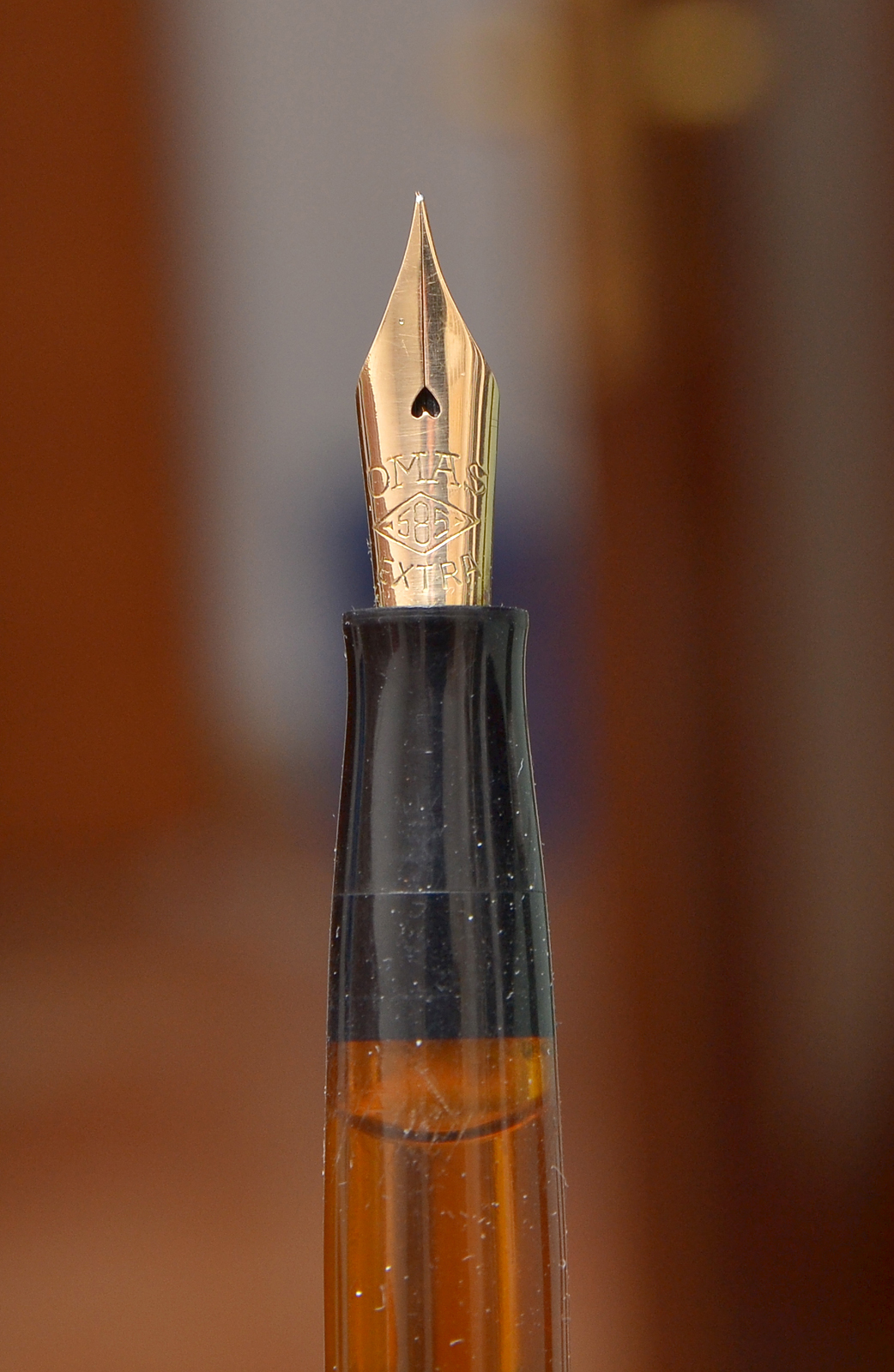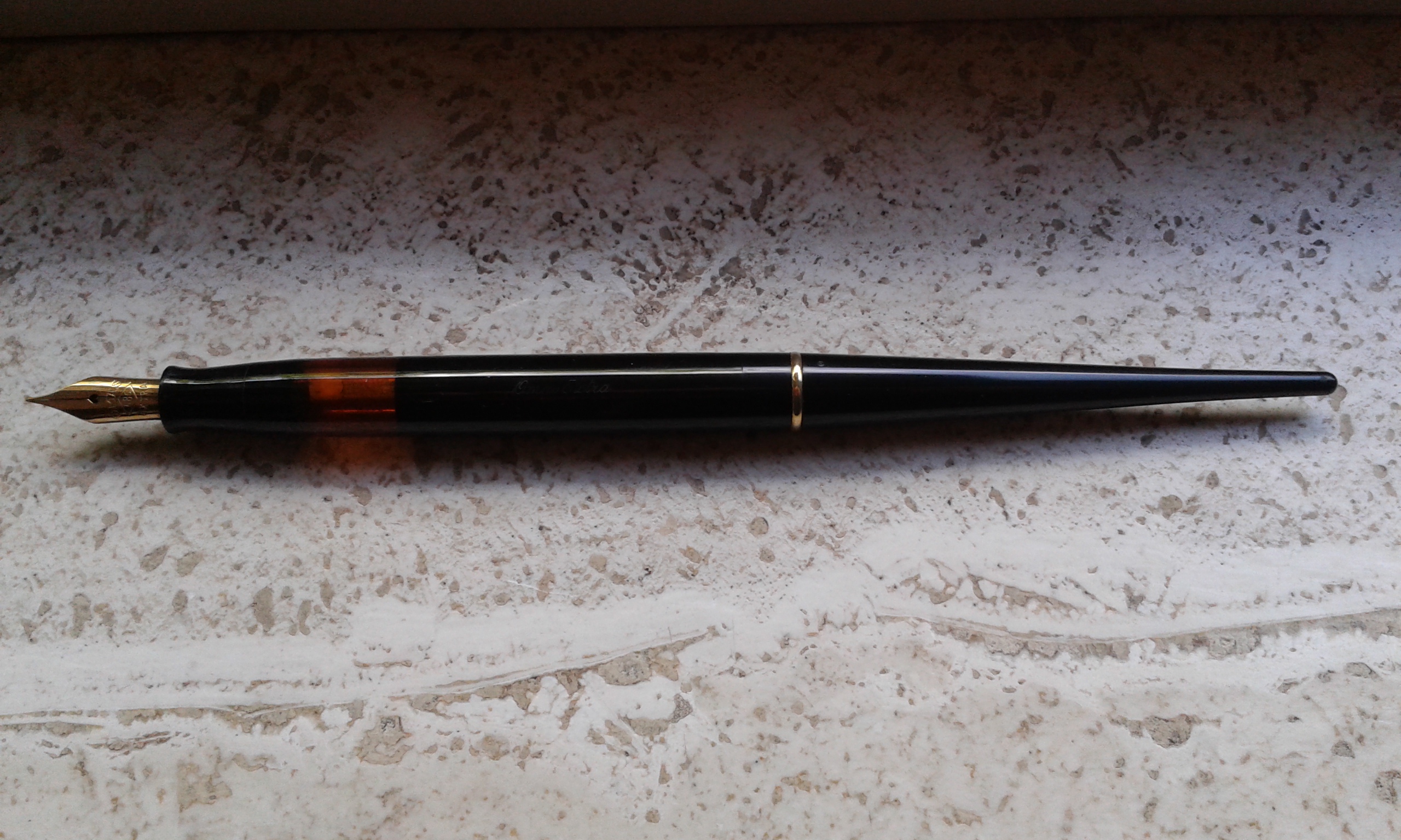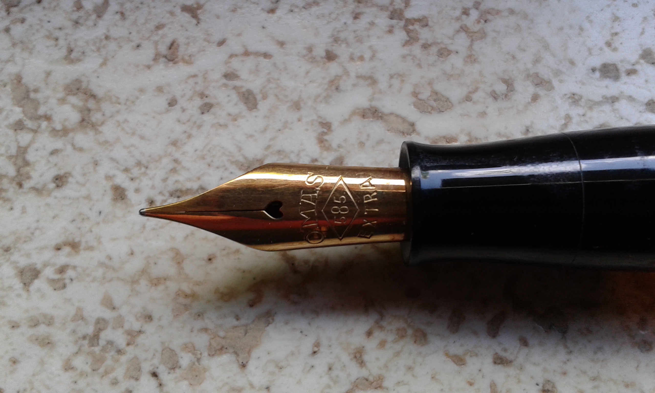 Lo stiloforo Omas Extra è di una serie abbastanza recente credo anni '80/'90 quello anni '50 è con pennino in oro con il foro a cuore ed è in celluloide con le finestra per l'inchiostro completamente trasparente e l' anello superiore placcato oro.