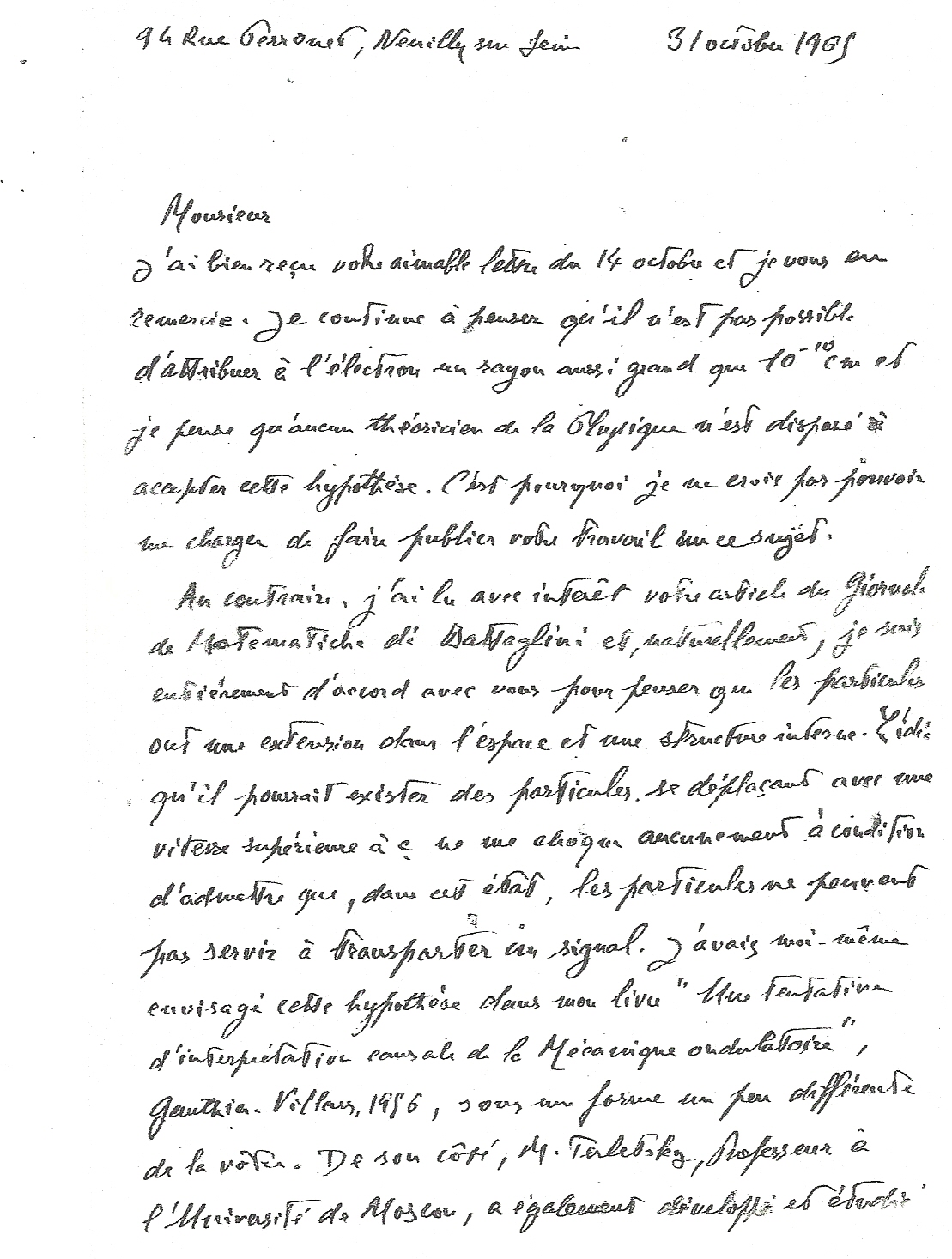 Se vi interessa, se non sono fuori tema e se mi spiegate come aggiungere un pdf alla mail, vorrei inviarvi una lettera autografa del grande Louis de Broglie. La curiosità è che uno dei più grandi fisici moderni, in un periodo di stilografiche e biro trionfanti, scriveva le lettere ... con la cannuccia