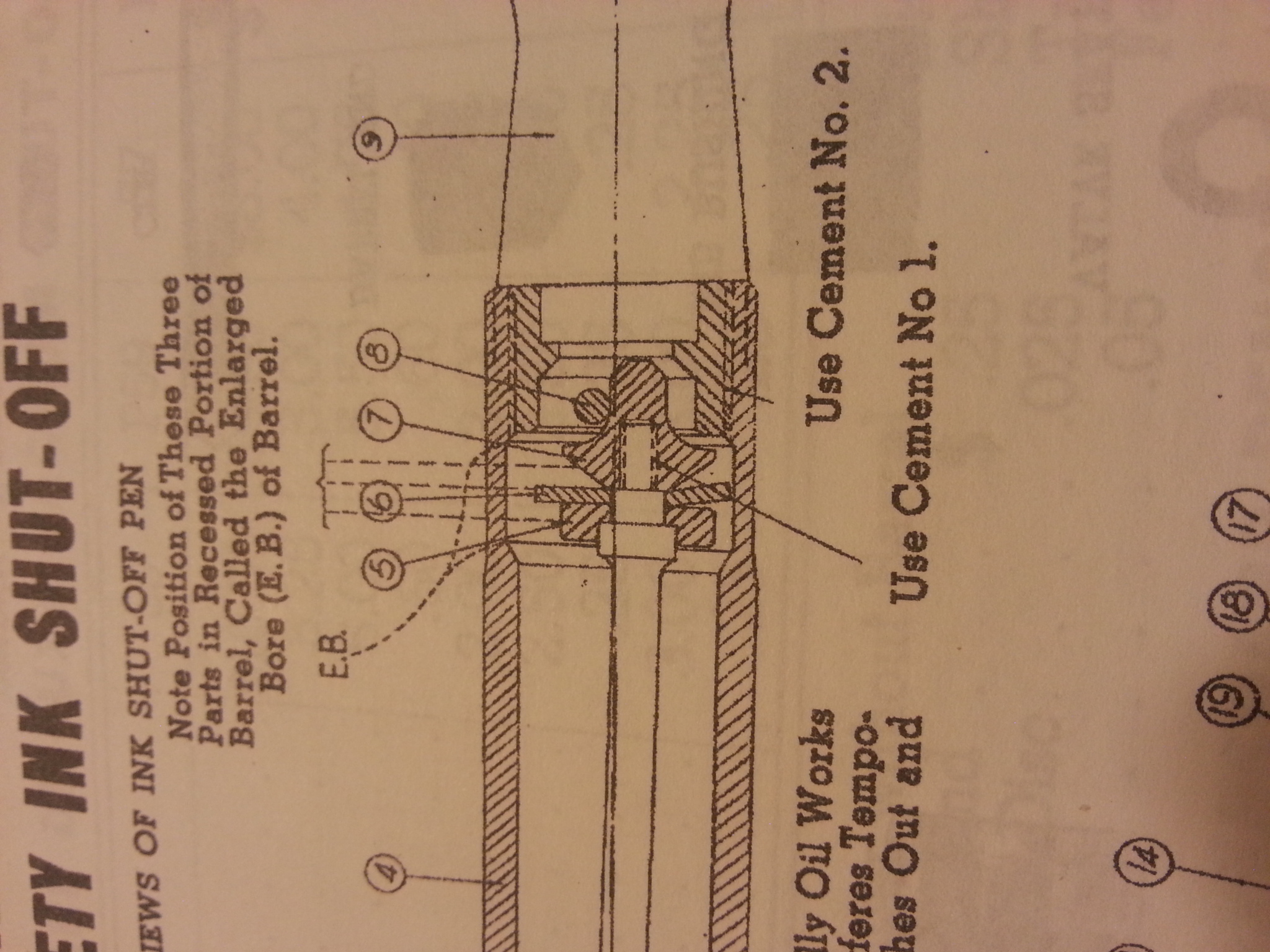 E vedo cose interessanti, che denotano uno sforzo da parte della casa americana di migliorare alcune criticità di questo sistema di caricamento tanto affascinante quanto rognoso. Mi riferisco al perno 8, che ha la funzione di "deviare" lateralmente l'astina ed il diaframma in modo da lasciare un maggiore spazio alla risalita dell'inchiostro richiamato del vuoto d'aria generato alle spalle del diaframma nella suo azionamento ed al contempo favorire la discesa dell'inchiostro durante l'uso. Gli analoghi meccanismi di Sheaffer, Ancora, Aurora, Columbus, ecc. non hanno questa raffinatezza.