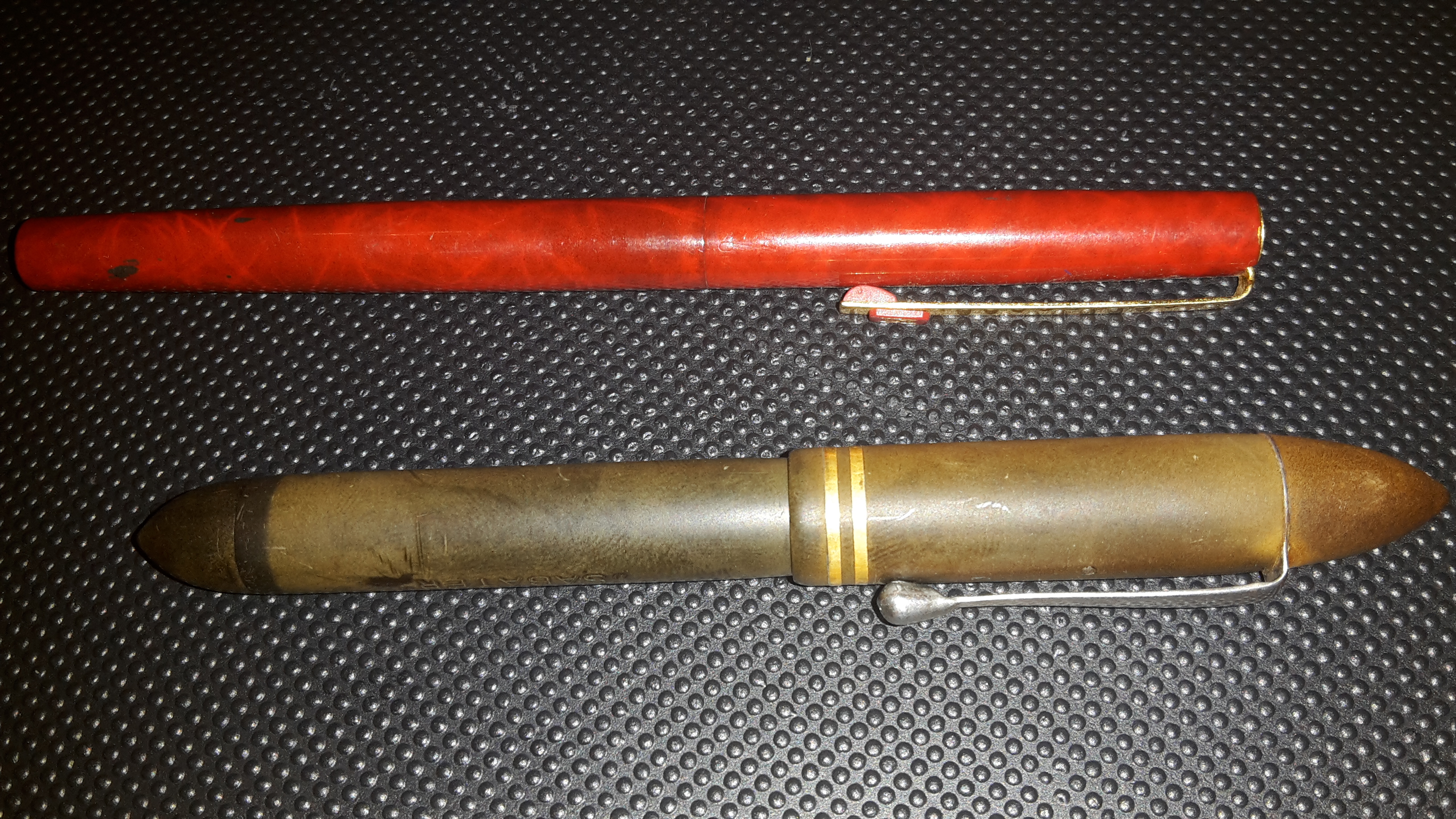 La penna rossa sembra essere relativamente modernaa(anni '70-'80), potrebbe essere una Senator. Quella in ebanite (che a rima vista mi piace molto) invece dovrebbe essere molto più vecchia, purtroppo però non io non so dirti nulla sulla marca; usando il fornet (cerca sul forum) dovresti riuscire a restituirgli almeno in parte l'originario colore nero.