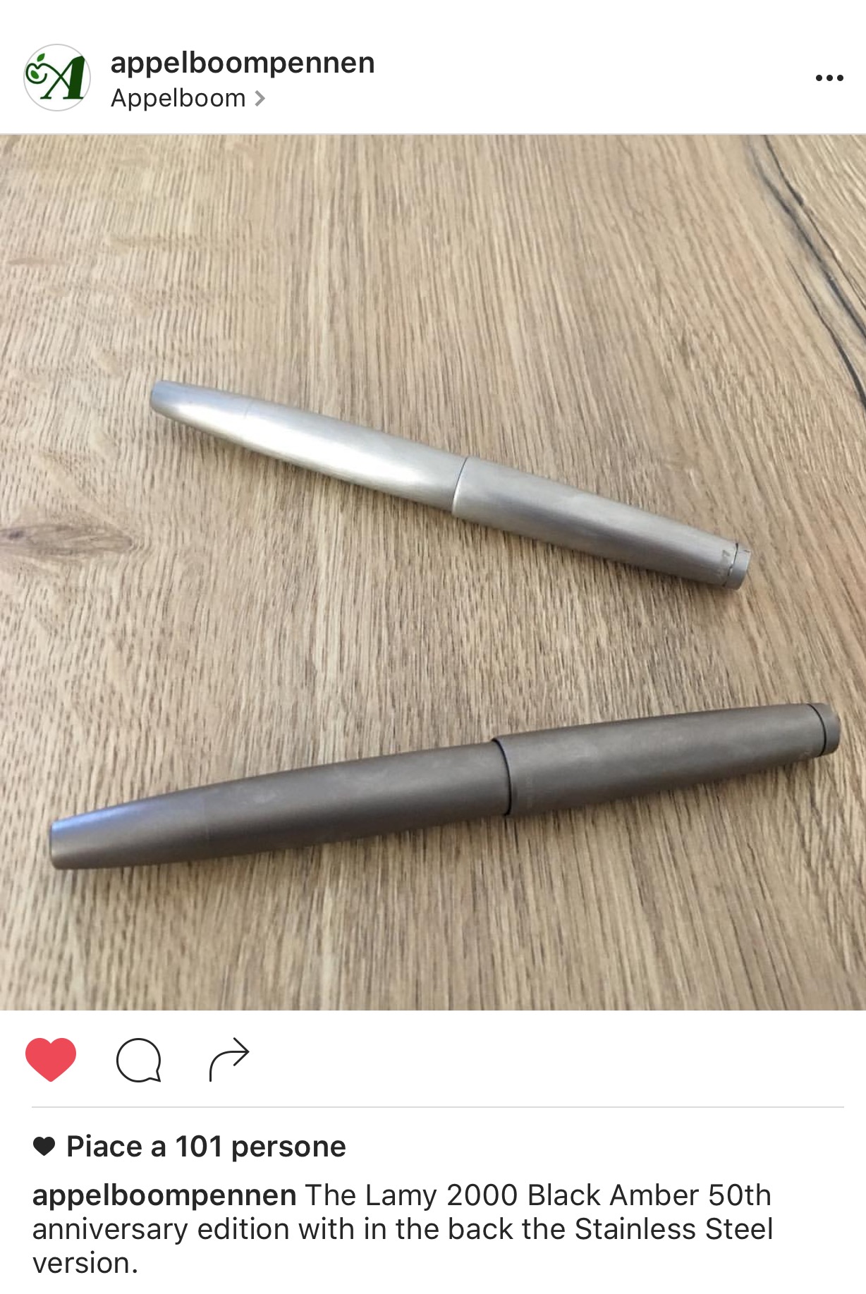Dunque, l'edizione limitata per il 50esimo anniversario della Lamy è stata ufficialmente presentata, anche se il video non è stato pubblicato direttamente da Lamy ma da un suo noto distributore. Non vi nascondo la mia delusione. Anche se in edizione limitata (e comunque 5000 pezzi non sono pochissimi), per €500 mi aspettavo almeno nuovi materiali, qualche extra interessante, eccetera. Invece pare sarà effettivamente una Lamy 2000 Stainless Steel, con una particolare placcatura superficiale. >Qui< il link al video, e qui sotto un'immagine tratta dallo stesso, più la descrizione in lingua inglese.