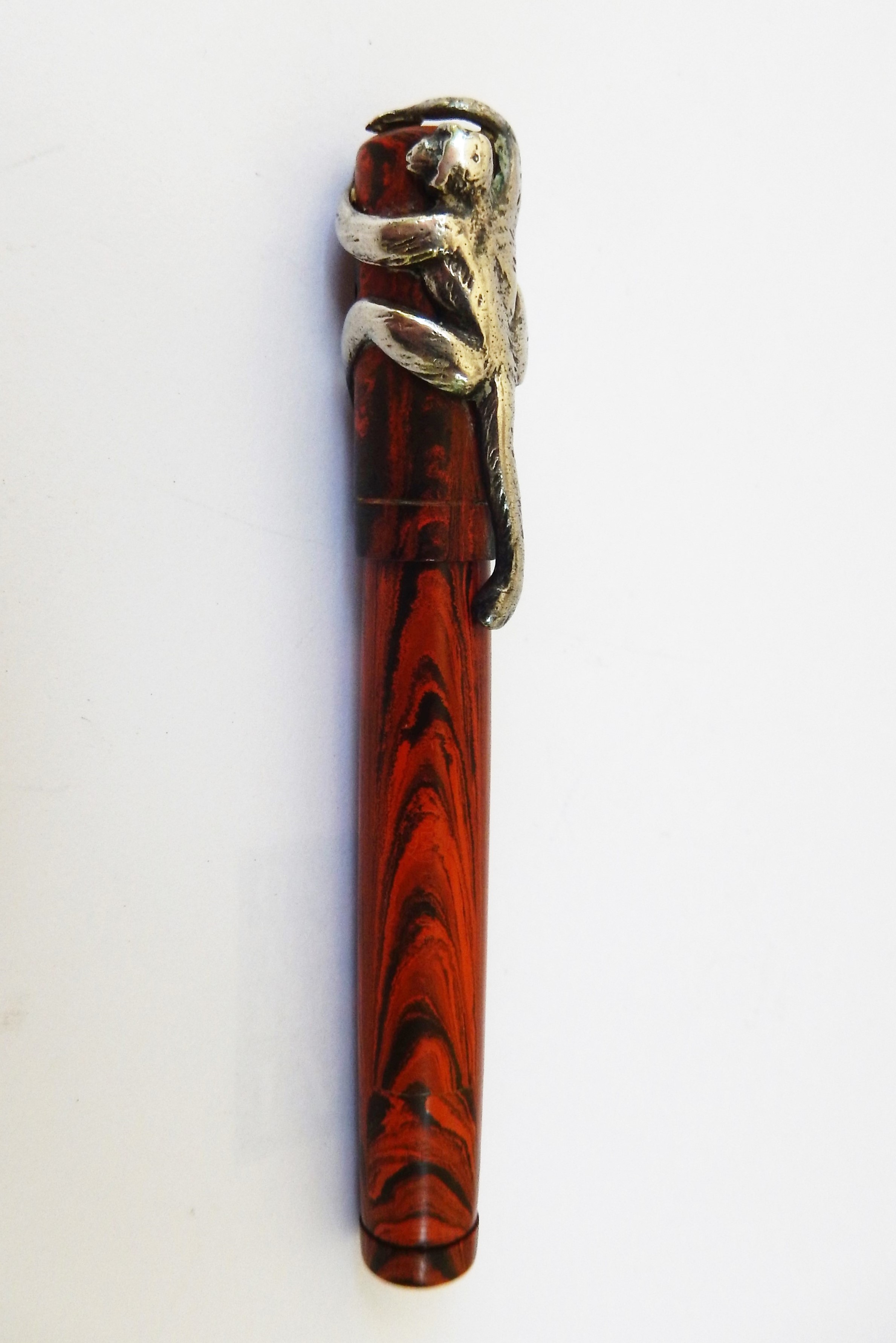 lo zodiaco, fra la capra ed il gallo, e come gli altri segni si ripropone ogni dodici anni ( sono stati anni della scimmia il 1920, il 1932, il 1944 e così via fino al 2016). Da questo vorrei prendere lo spunto giocoso per presentare questa Waterman 42 1/2 V in ebanite fiammata e con la curiosa particolarità di una coeva clip in argento, di probabile produzione francese, rappresentante proprio una scimmia avvinghiata al cappuccio della penna quasi fosse
