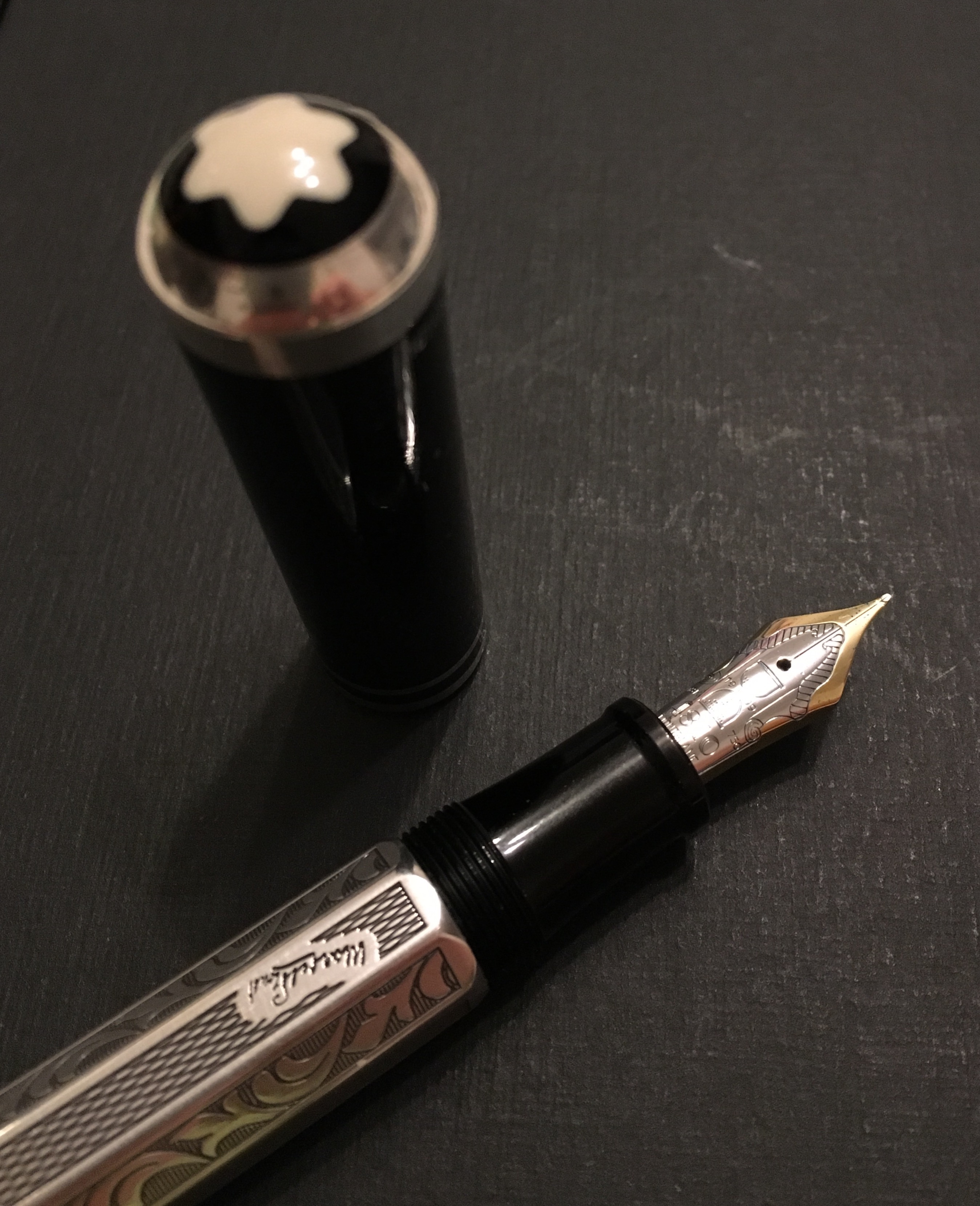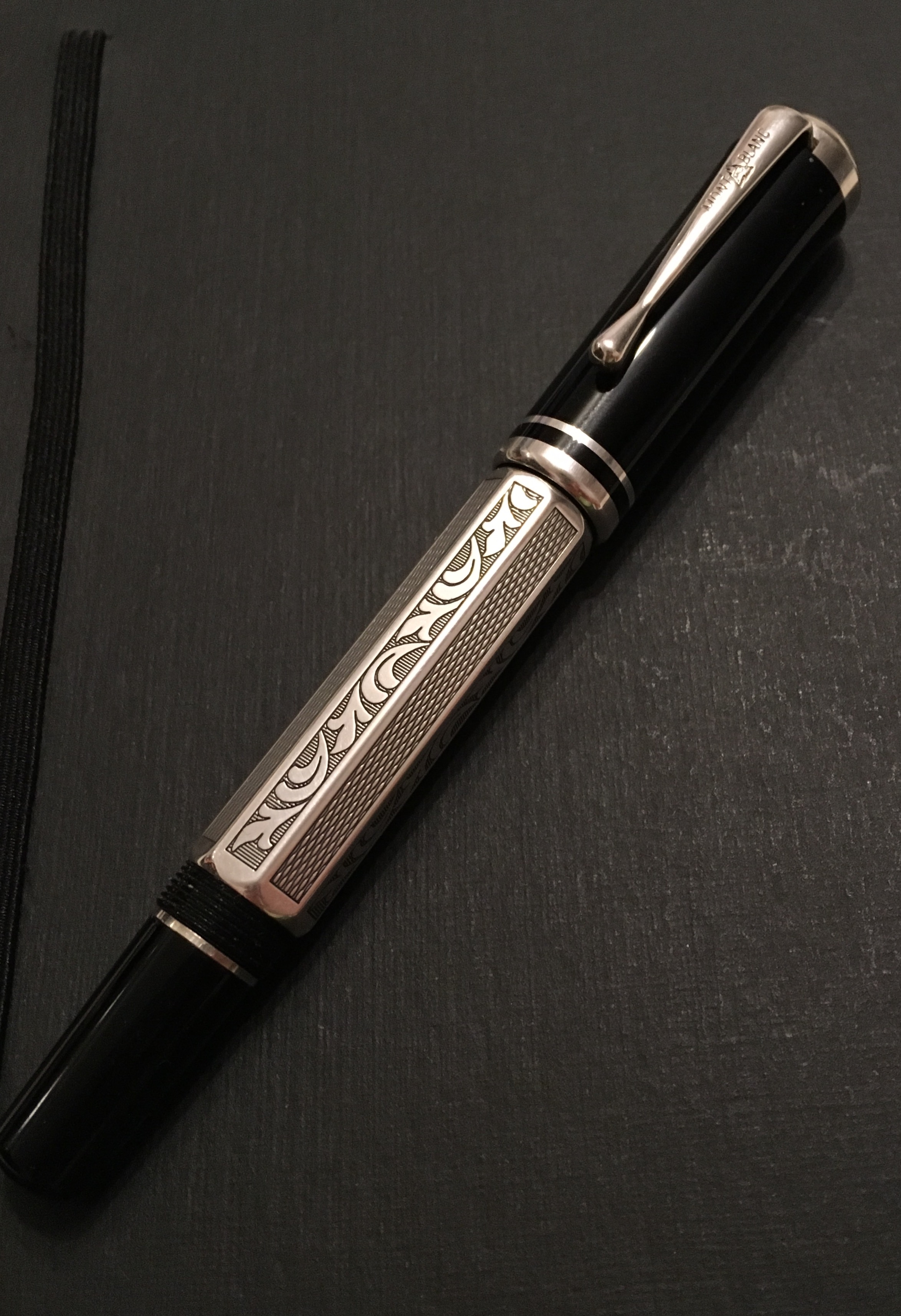 anche il tappo è nero con due verette in metallo e la clip con la scritta montblanc in stile vintage.