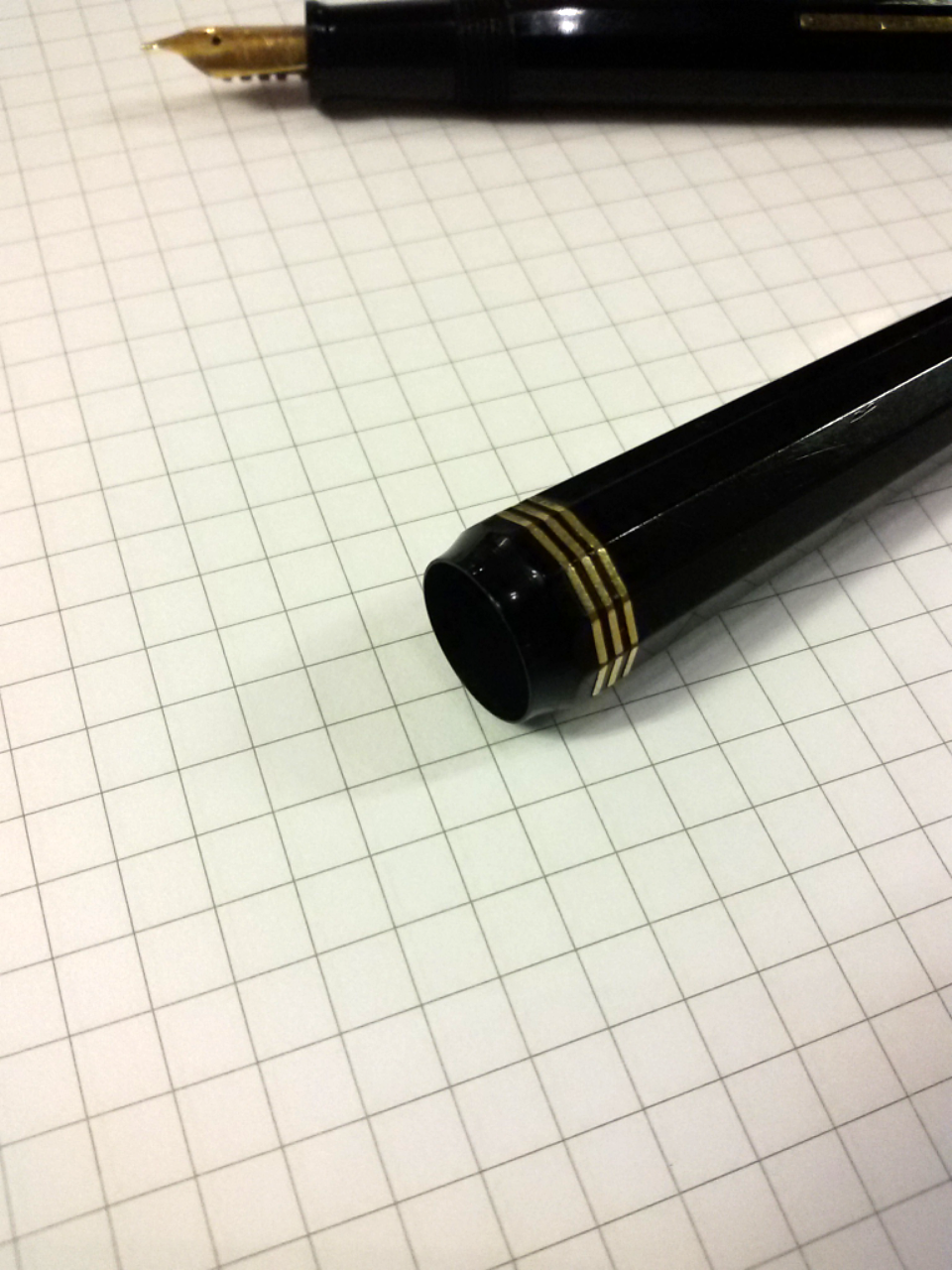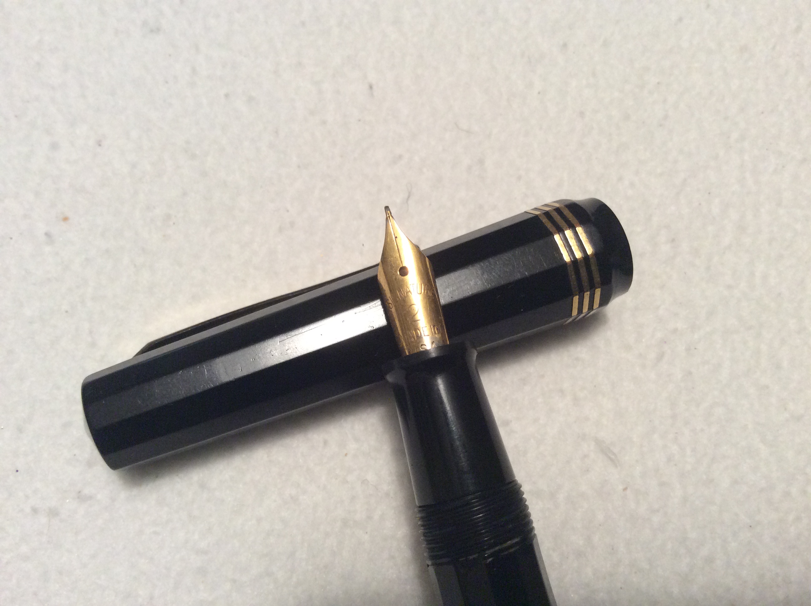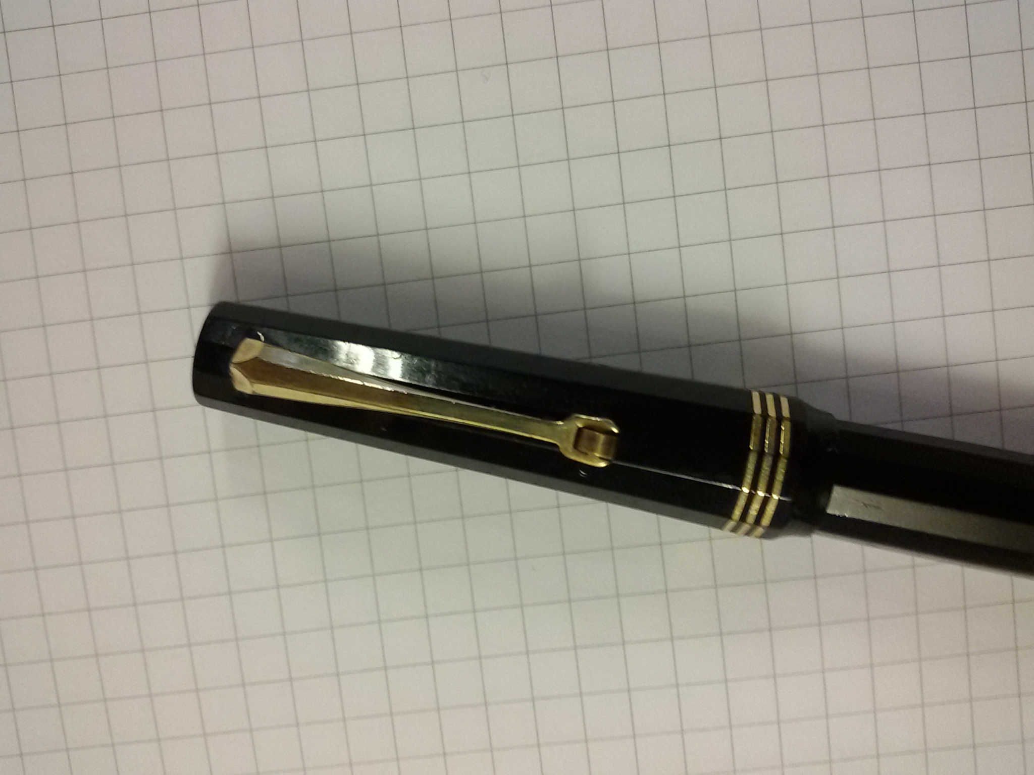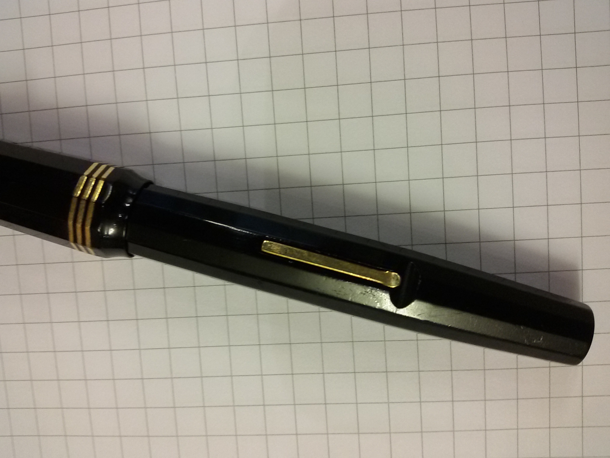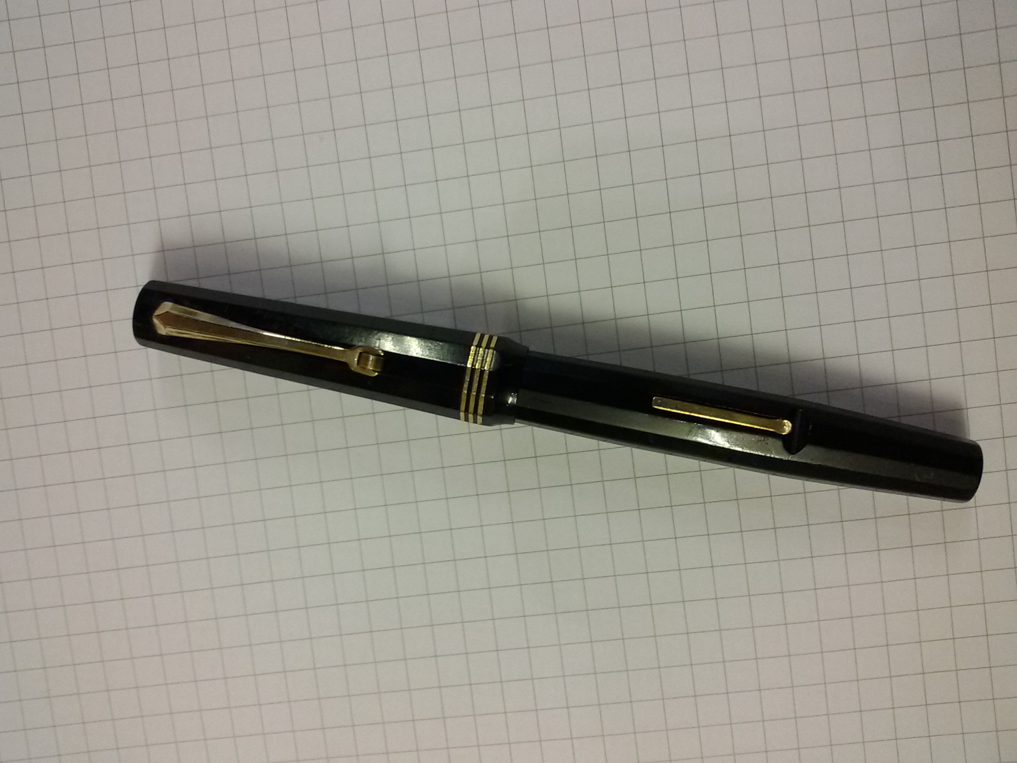 Ho da parecchio tempo questa penna, presa per la bella clip a ruzzolina. Non riporta alcuna icisione, il pennino è un anonimo "made in USA" SIGNATURE 2, mi ha sempre incuriosito perchè ha l' aspetto di essere una penna di sostanza. Dopo alcune ricerche sono incappato nell' Ancora Da-Ma, pare essere lei tranne per il fatto che il fusto non riporti alcuna iscrizone. Misura 13 cm da chiusa, 11,3 senza cappuccio e 14,8 con cappuccio calzato.