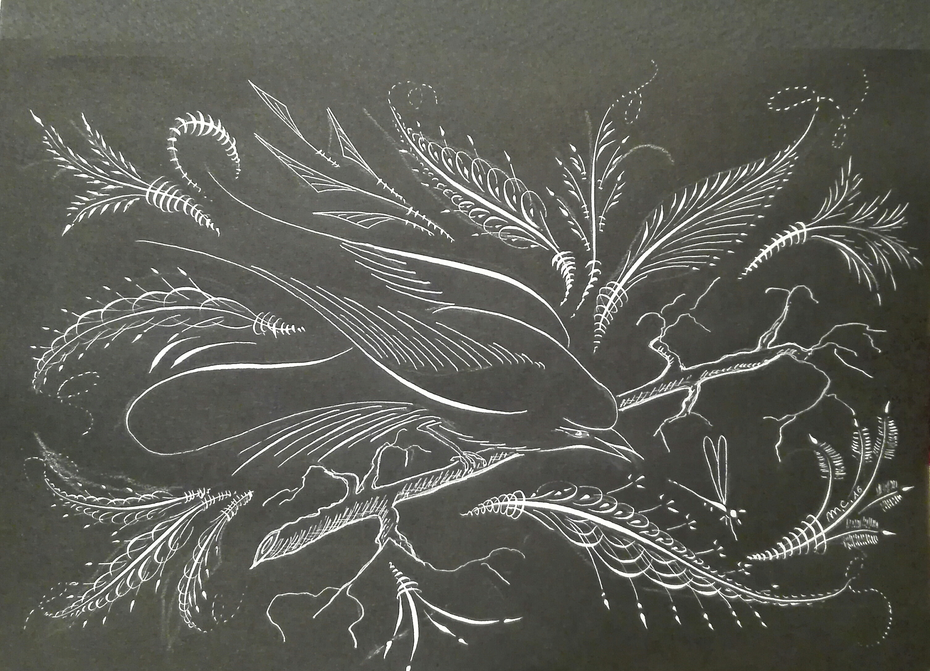 Si esegue con il pennino a punta fine ed è essenzialmente composta degli stessi tratti che si usano per la calligrafia. I soggetti principali sono fiori e uccellini...