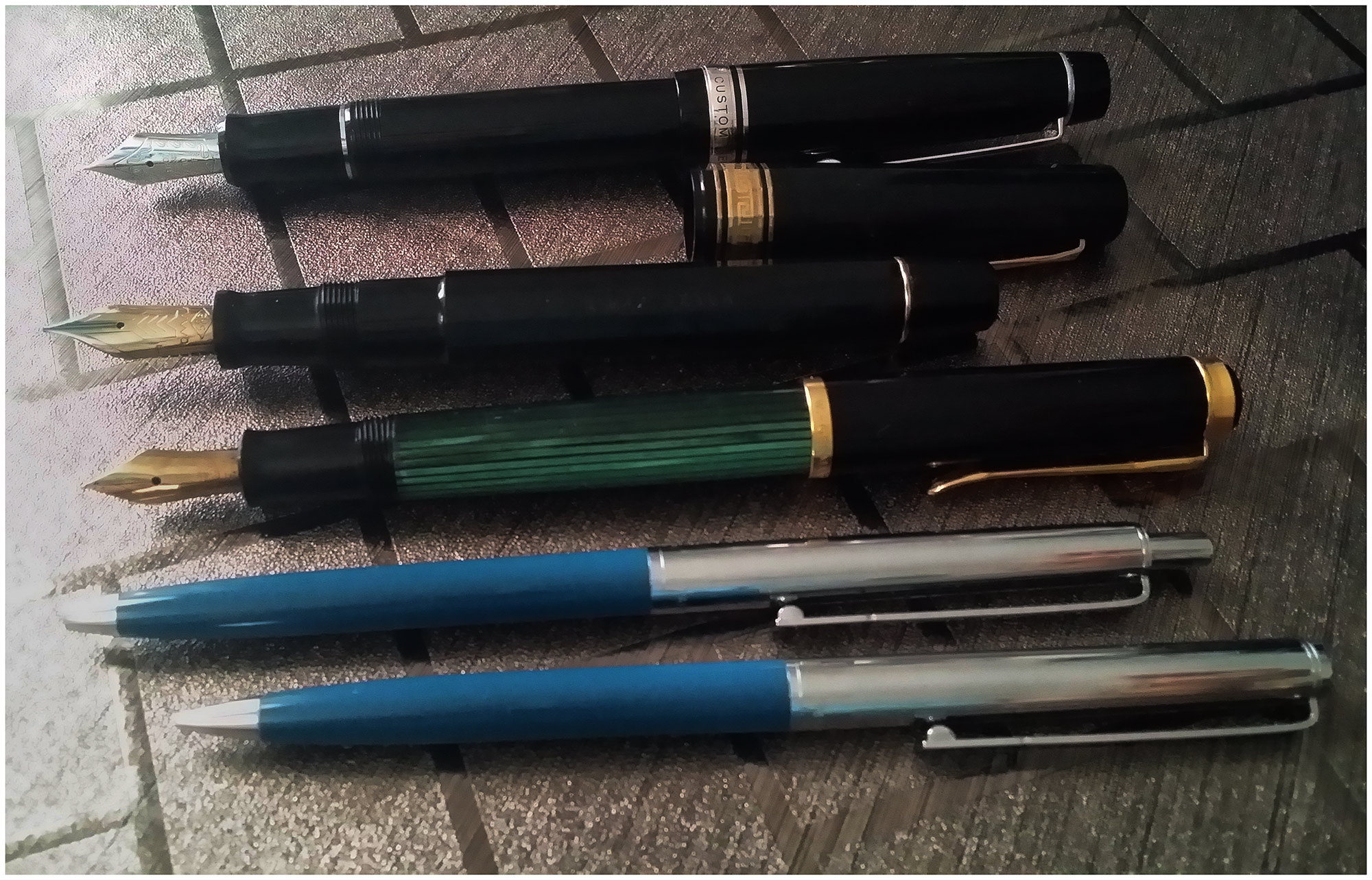 E poi la Pelikan M400 che mi fu regalata ai tempi del liceo. Con pennino f in oro , che trovo morbido e anche appena appena, leggermente stub. Le altre sono acquisti del 2016 ( troppi....una rovina..)
