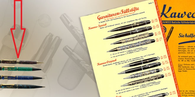 Io avevo trovato questa matita meccanica con la nuova scritta (come sulla penna di Alfredo, che ha terminali conici) che mi sembra corrispondere a quella mostrata dalla Kaweco sul suo sito e datata 1935: