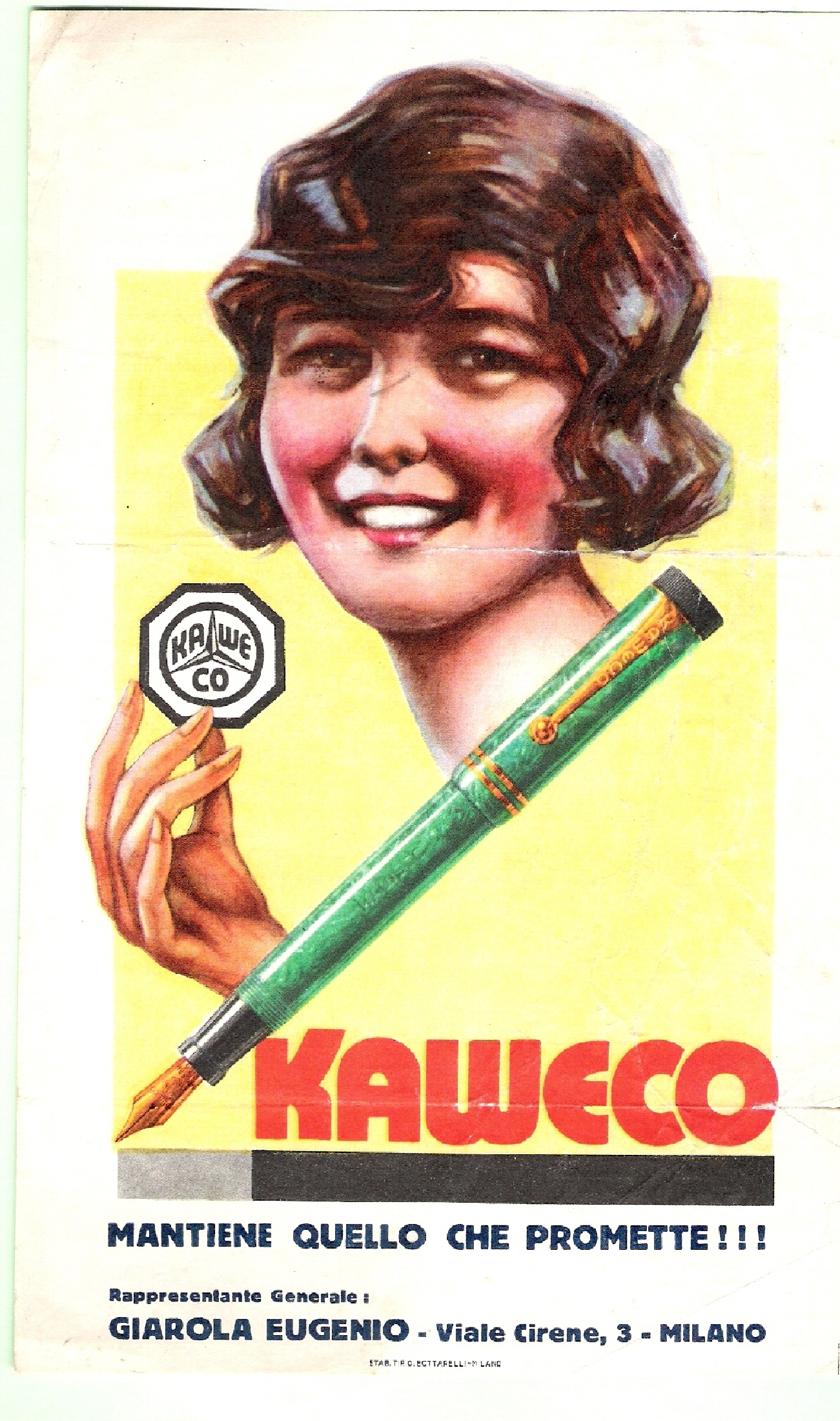 Sono d'accordo con la datazione anche per motivi stilistici: essendo una "copia" della Parker Duofold Streamline (della quale imita anche la clip con scritta in verticale e terminazione a pallina, oltre alla nuova sezione portapennino) non può essere stata prodotta prima della metà dell'anno 1930.piccardi ha scritto:Penna molto interessante, senz'altro precedente a quella di Alfredo. Databile a dopo il 1929, perché il logo è quello della KWG, che acquisì la Kaweco quell'anno, ma "storpiato" sostituendo la G con un Co. Poi vennero sostituite anche la K con Ka e la W con We, ma a quanto pare fecero le cose un po' alla volta.