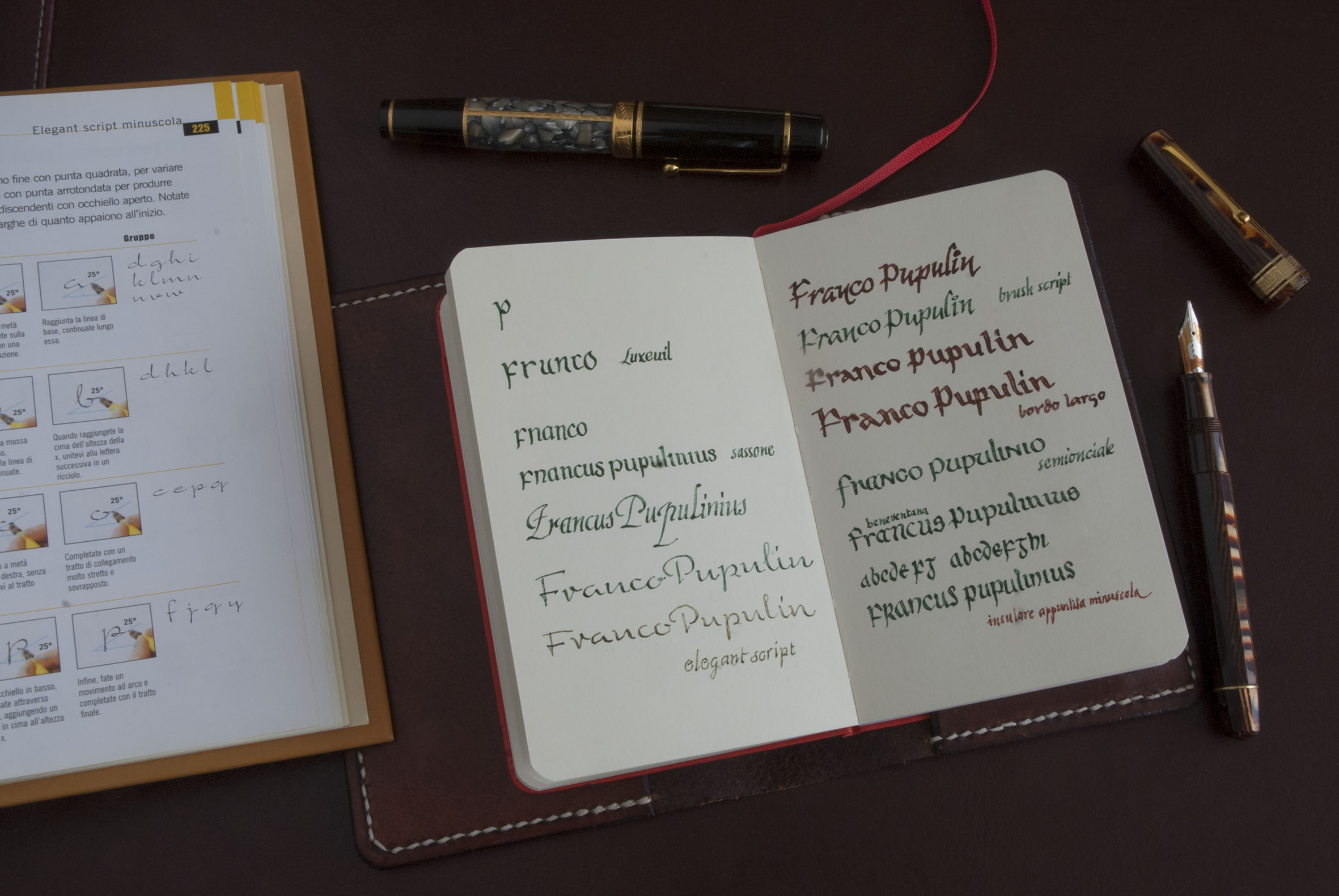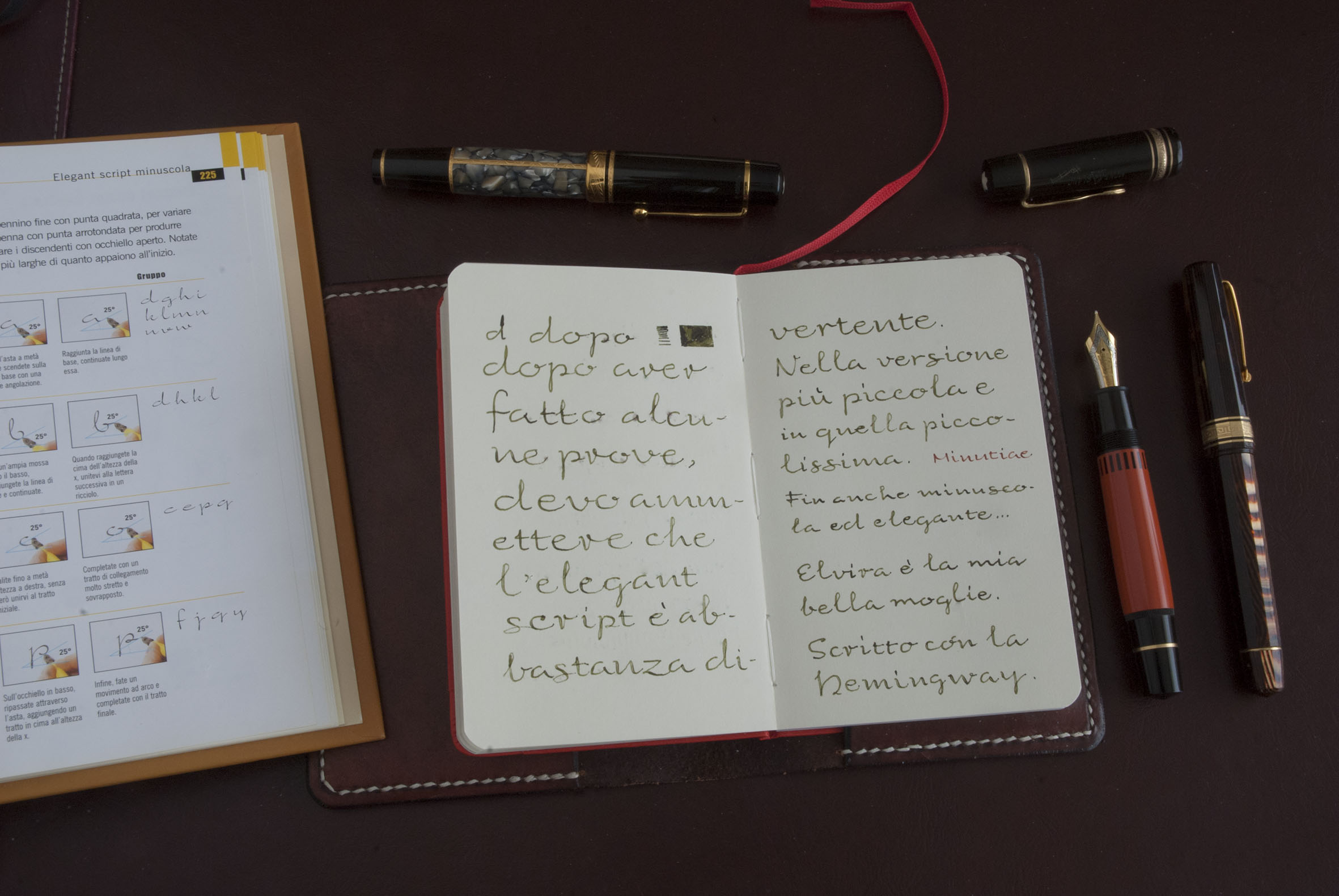 scripts antichi richiedono, per essere riprodotti con migliori risultati, un pennino “tagliato”, o italico, con i bordi sottili per imitare la forma della classica “penna d’oca” e ottenere una maggior distinzione tra le linee orizzontali (sottili) e le verticali (piú spesse). Per questi ho usato il pennino italico medio della mia Montblanc Dumas. Mi piacciono peró molto anche le grafie che possono essere realizzate con una penna stilografica “normale”, con punto di scrittura fine, medio o largo, perché ne prendo spunto per aggiungere elementi alla “scrittura di tutti i giorni”. Per il largo (in inchiostro marrone Omas) ho usato la Omas Paragon, dal cui pennino fuoriesce un fiume di tinta… Per il fine ho messo all’opera la Hemingway con l’inchiostro Diamine Safari, del quale ho accennato in un altro argomento di quest forum.