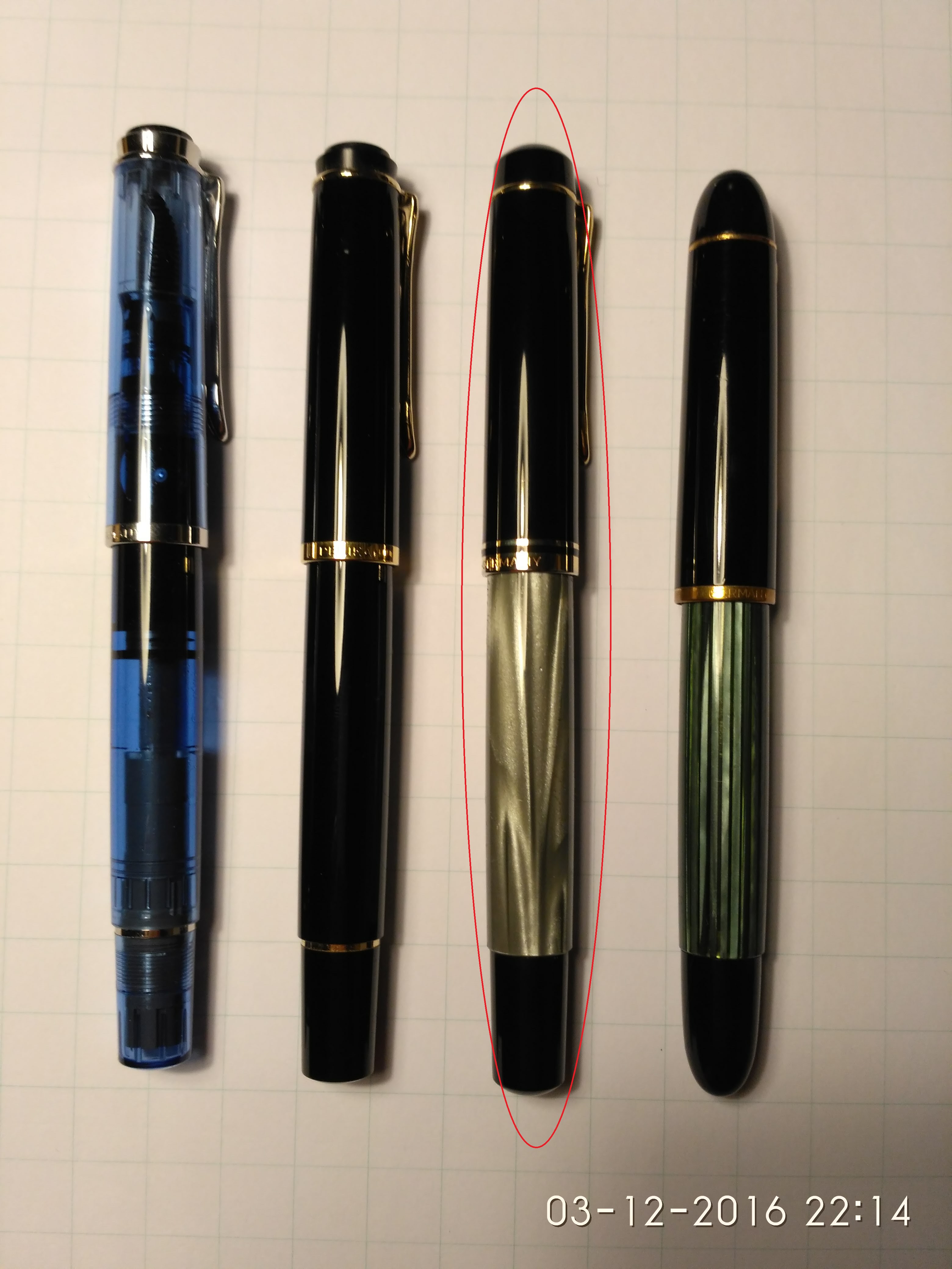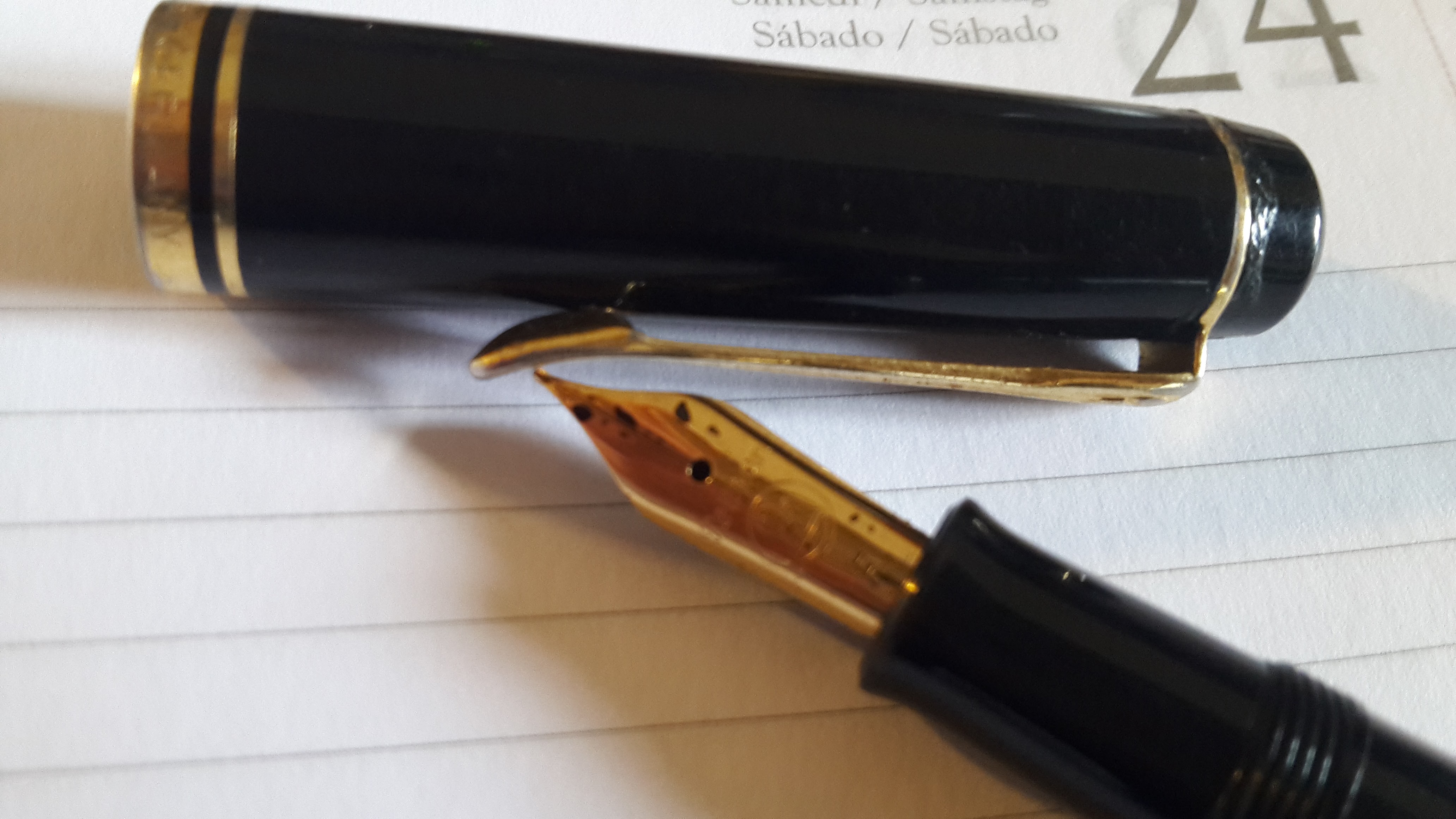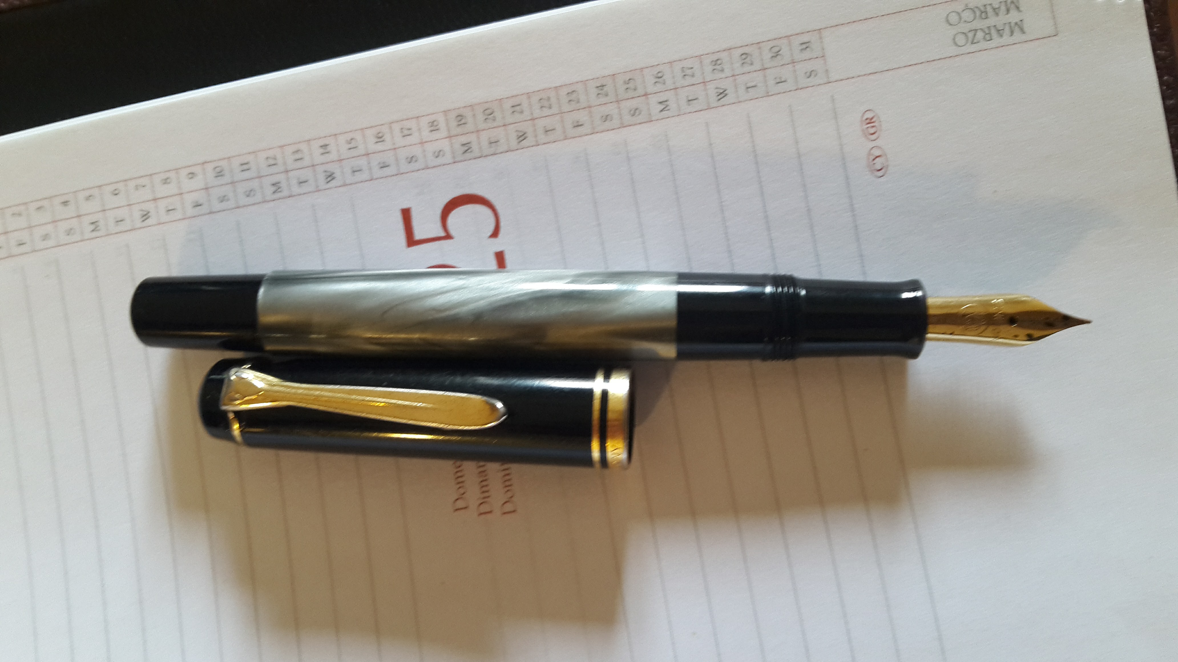 A parte il cappuccio rovinato nella parte superiore, la penna è praticamente perfetta, non mi ha dato mai alcun problema; il pennino F è di una flessibilità stupefacente che mi permette di scrivere che è un vero piacere; non perde una goccia di inchiostro; non ha mai avuto problemi di flusso irregolare, sbavature ecc..