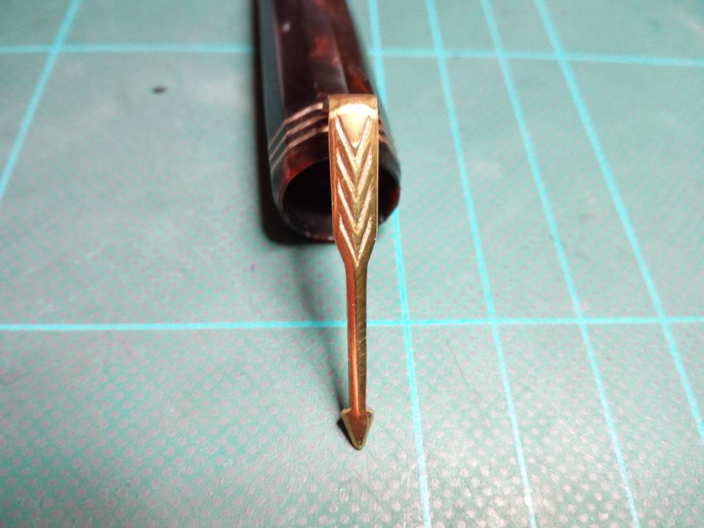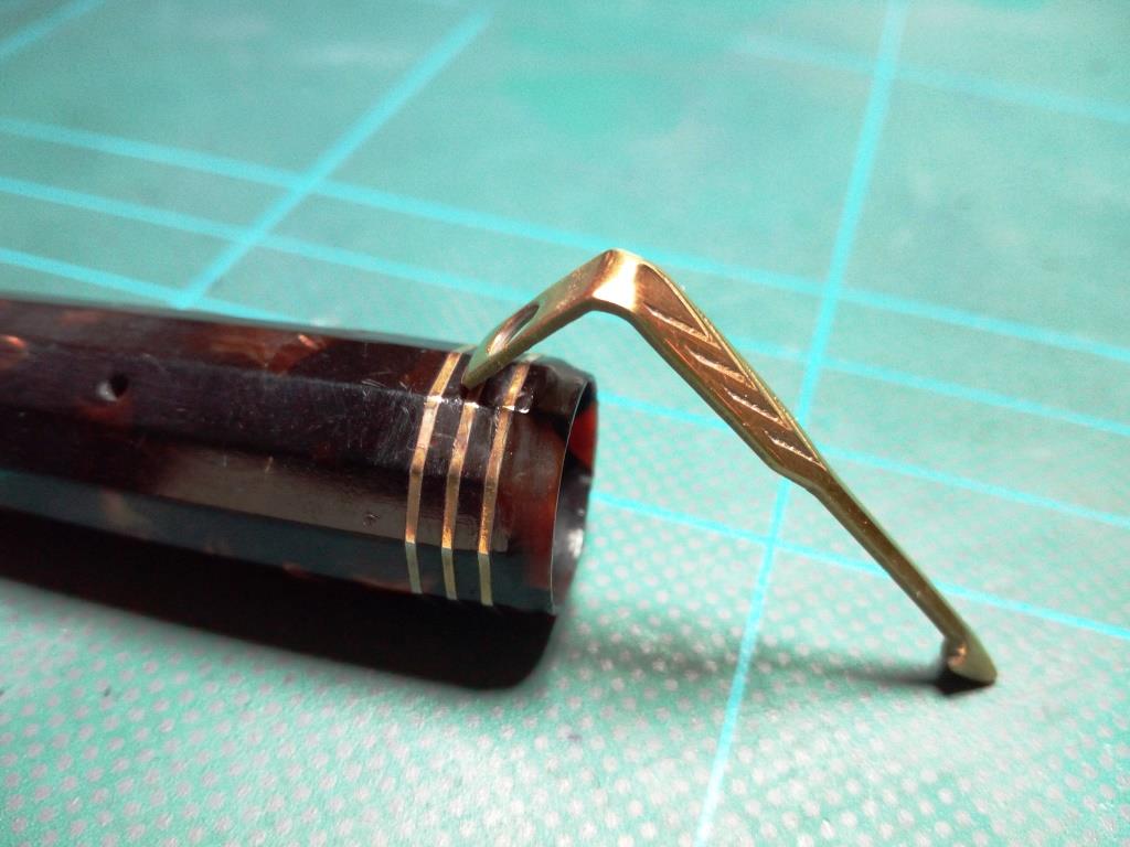 Quì mostro un esempio di ricostruzione di tale anellino partendo da un tubo di ottone. Personalmente non riesco a riprodurre l'effetto toroidale ma il risultato finale secondo me si avvicina molto all'originale. La penna affidatami aveva peraltro le finiture bianche e, d'accordo con il proprietario, le ho dorate così da poter poi montare un pennino extra lucens in oro, molto più comune di uno in permanio.