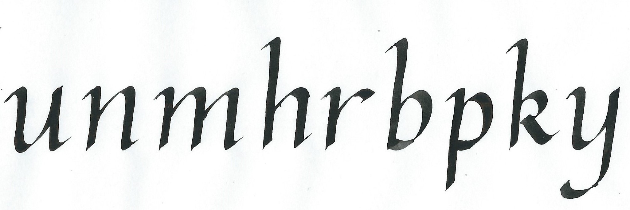 Prima di andare avanti ho pensato di condividere con voi le mie prime lettere, dopo circa una settimana di esercizi quotidiani, per correggere il tiro e avere un parere tecnico o consigli su come esercitarmi. Non ho fatto caso alla spaziatura. Ad ogni esercizio le lettere hanno una certa costanza, ma ogni volta ci sono imperfezioni (inchiostro che spande, grazie poco graziose, tratti ascendenti troppo corti o troppo lunghi, tratti tremolanti, goniometro interno che impazzisce). Per evitare un circolo vizioso ossessivo ho deciso di pubblicare l’ultimo tentativo al naturale.