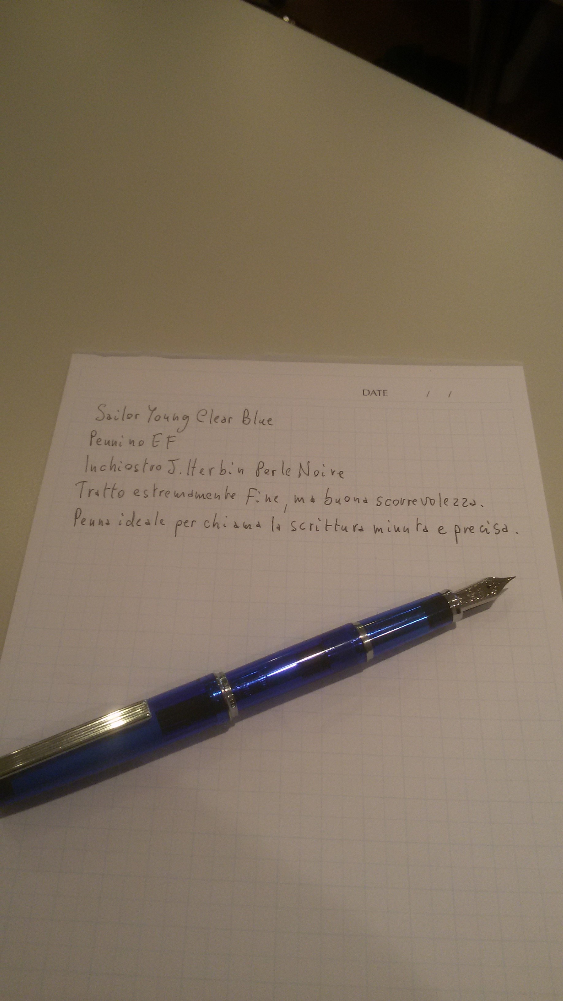 Il pennino montato su questa Young Clear Blue e che ho scelto è un EF, in acciaio. Lo trovo assolutamente all'altezza della fama della casa. Sottile come un capello, ma scorrevole, la penna scrive in modo perfetto, senza esitazioni e false partenze, anche dopo soste di due o tre giorni a pennino in su.