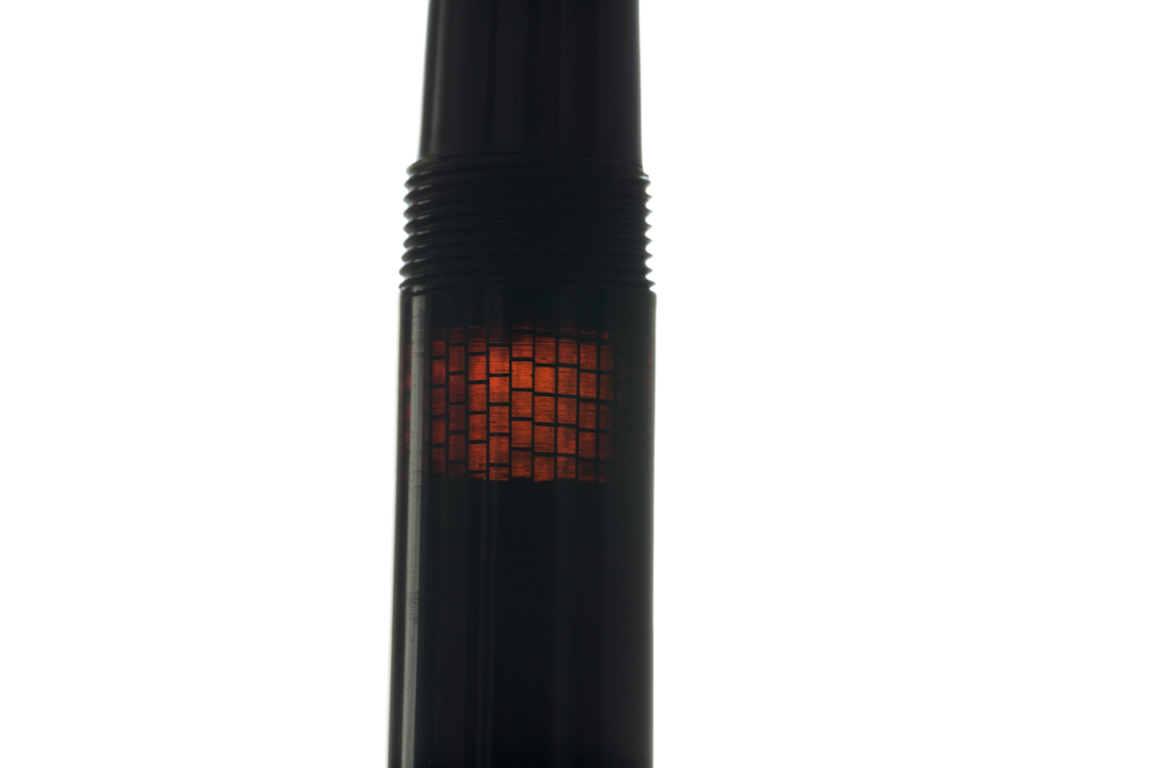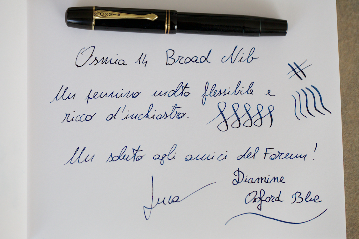 oggi vi presento la Osmia 14. Sono sempre stato attratto dalle forme delle varie Montblanc 134, 136, mi sono imbattuto in questa penna che le ricorda molto e non me la sono lasciata sfuggire. È una penna con corpo in celluloide e con la finestrella di ispezione dell' inchiostro con un simpatico e caratteristico reticolo. Il cappuccio è anch' esso in celluloide, la parte finale in ebanite come il fondello. La carica avviene tramite un morbido pistone che ancora monta la guarnizione in sughero. Per caricare inchiostro bisogna svitare il fondello e qui appare una piccola manopola. Il pennino è un numero sei molto flessibile, non ci sono indicazioni se sia d' oro...