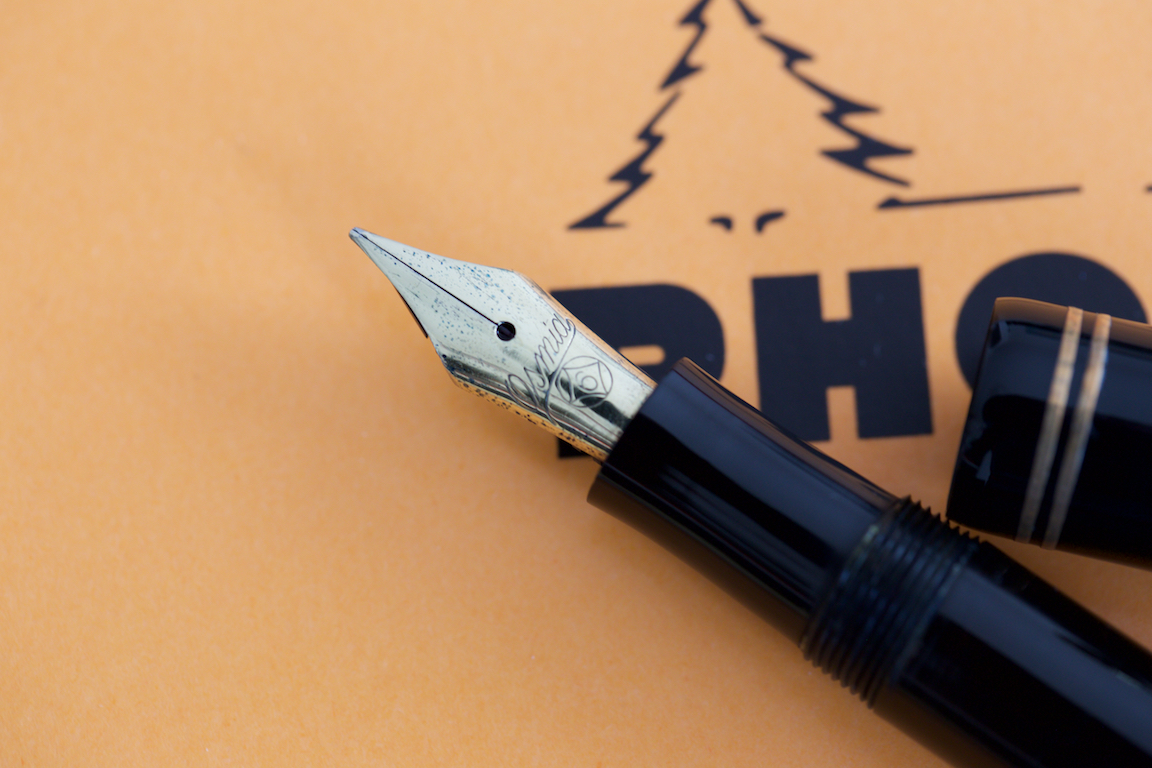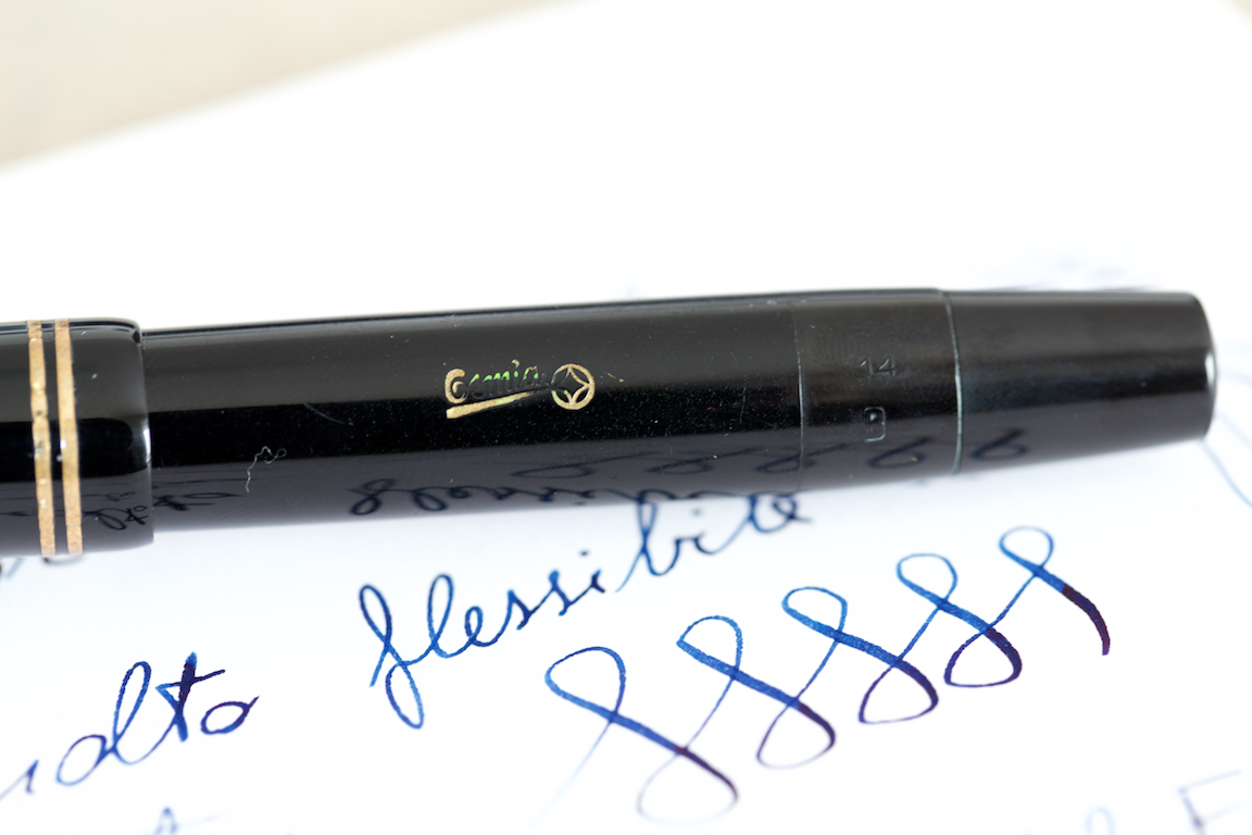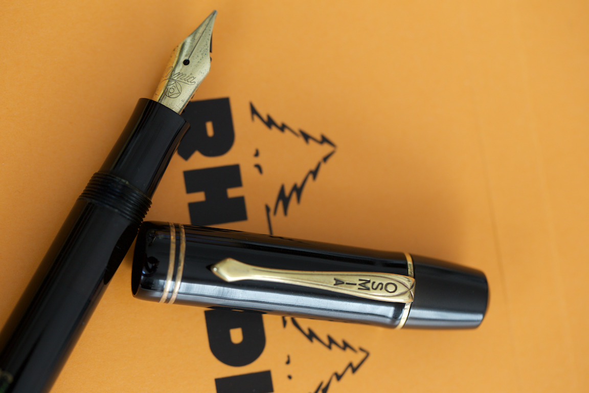 Penna molto interessante, ma non ho purtroppo informazioni sul modello. Non compare nel catalogo del 1937 e le informazioni sulle Osmia non sono molto diffuse. Il pennino si direbbe di acciaio o palladio, il che mi fa supporre sia più verso la fine degli anni '30 o il periodo bellico.