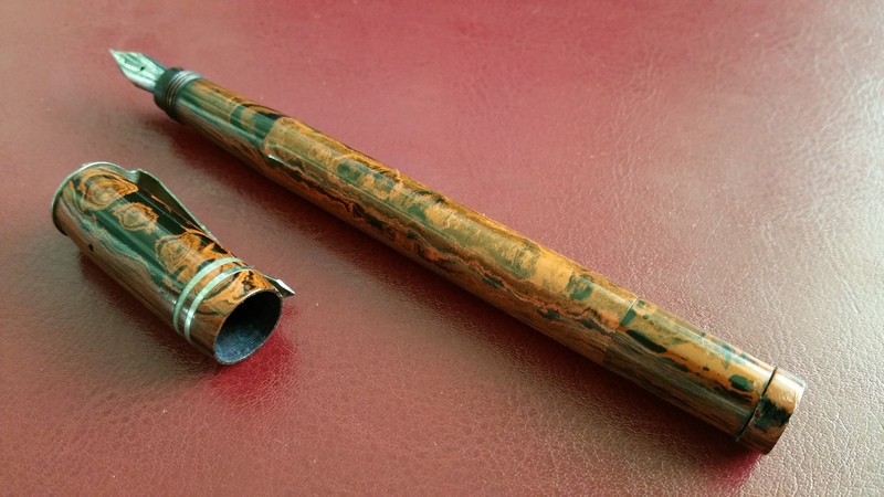 stamattina ad un mercatino mi sono imbattuto in una penna per me singolare: fusto e cappuccio in ebonite che ricordavano alcune Waterman