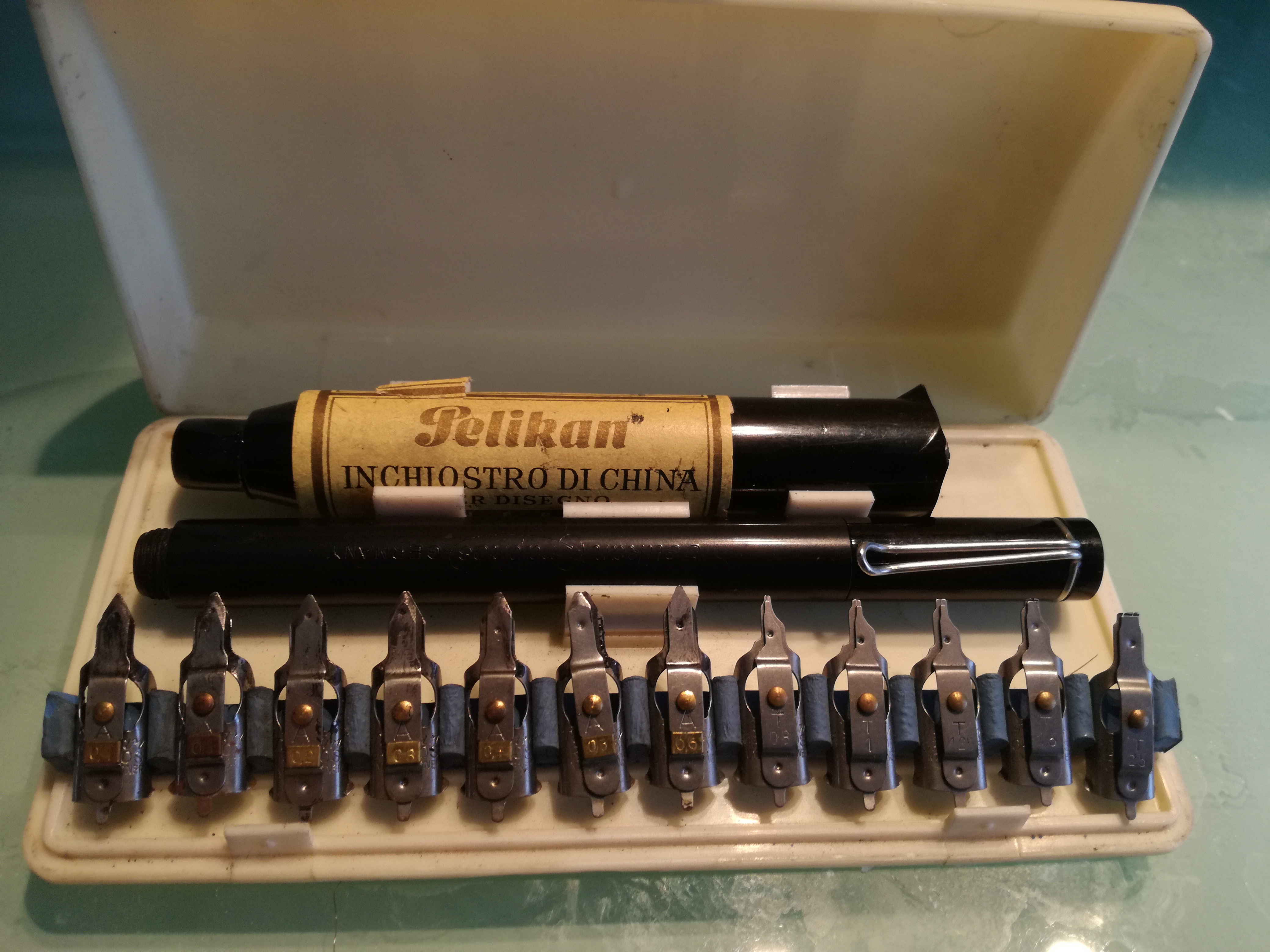Io ho ancora quella di mio papà, ed è identica. Se non erro i pennini differivano non solo per la dimensione del tratto ma anche per l'utilizzo: linee o mano libera.