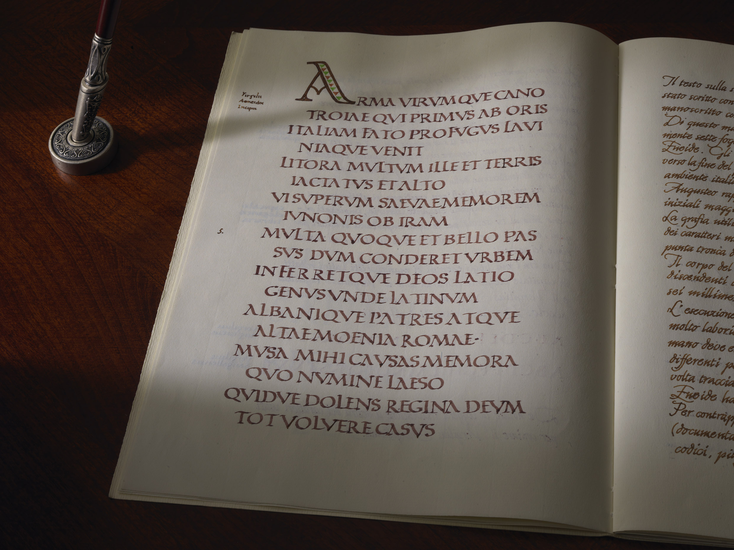 L’esecuzione di ogni lettera richiede un continuo cambio della inclinazione di scrittura (e della posizione della mano). La lettera “A” e la “R”, per fare solo due esempi, richiedono di cambiare la postura della mano e del foglio quattro volte. Questo può darci un’idea della perizia e del tempo necessari per trascrivere l’intero poema virgiliano, e dell’importanza del committente di siffatto lavoro…