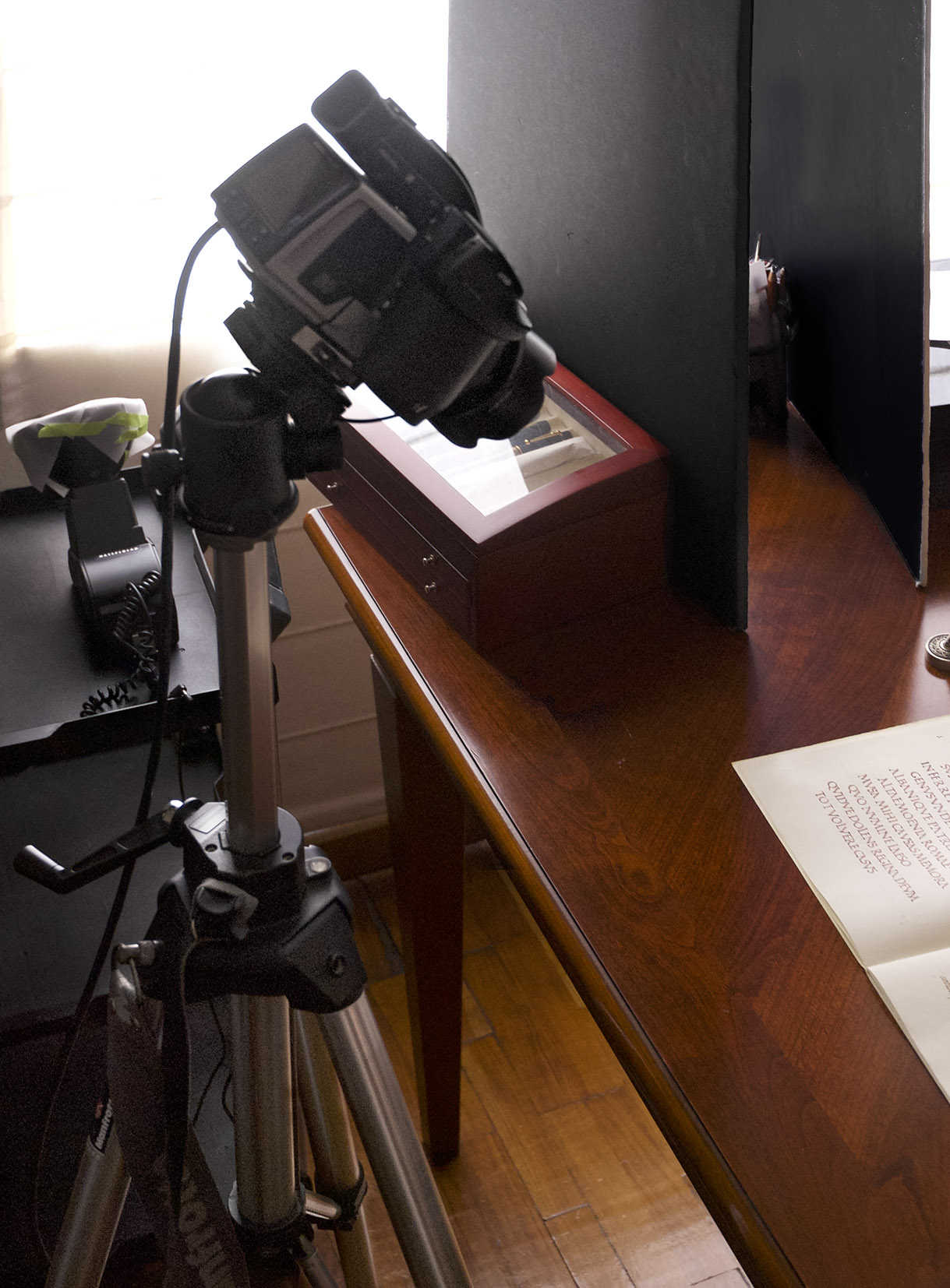 Nella foto del set di ripresa, qui sopra si possono vedere i due cartoni disposti “a cuneo”, attraverso i quali passerà, dall’esterno verso il soggetto, la luce del flash per simulare l’effetto di una finestra stretta. Sulla sinistra, é il flash con il suo schermo di plastica bianca traslucida, collegato alla fotocamera attraverso il cavetto-sincro.