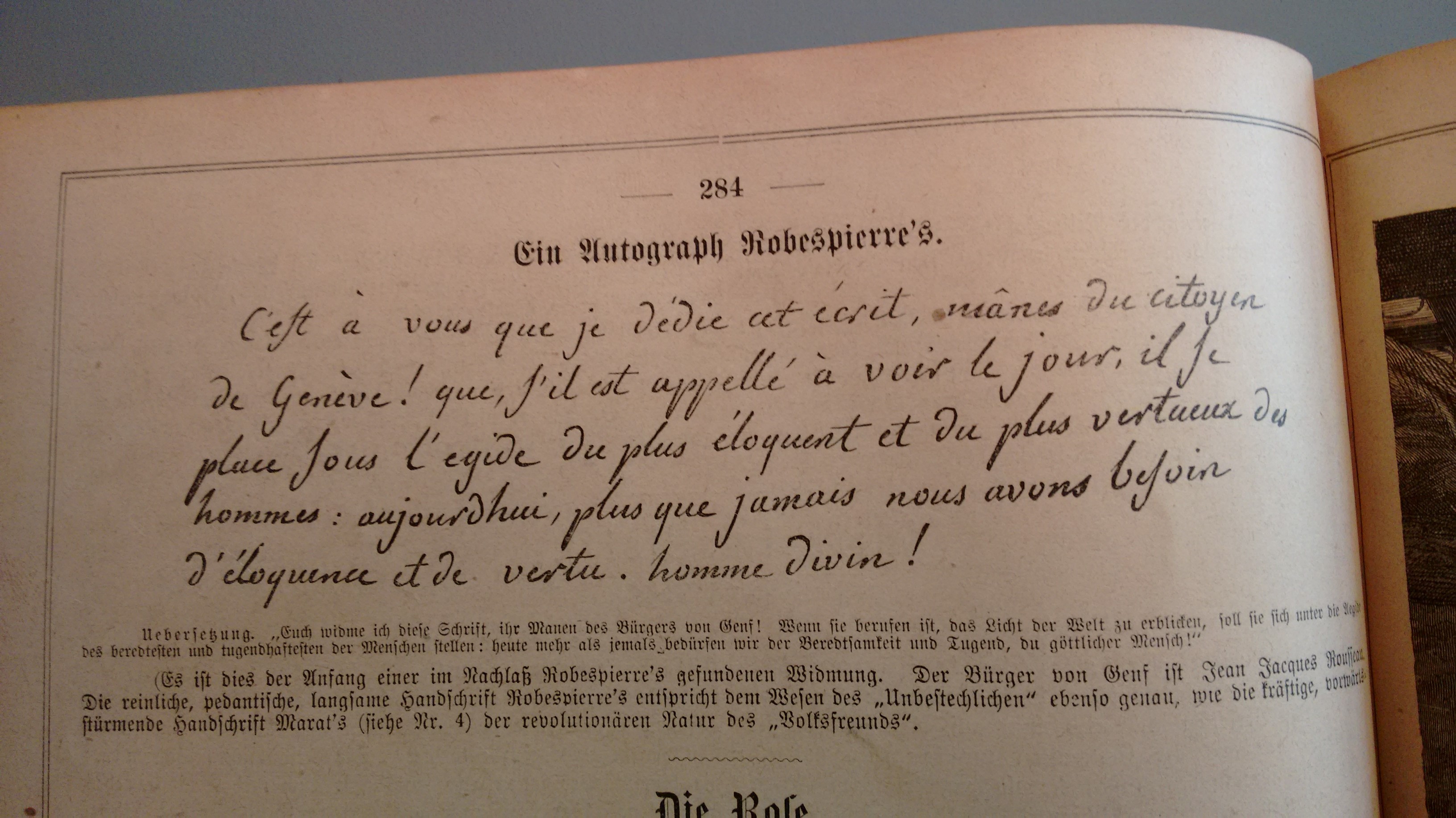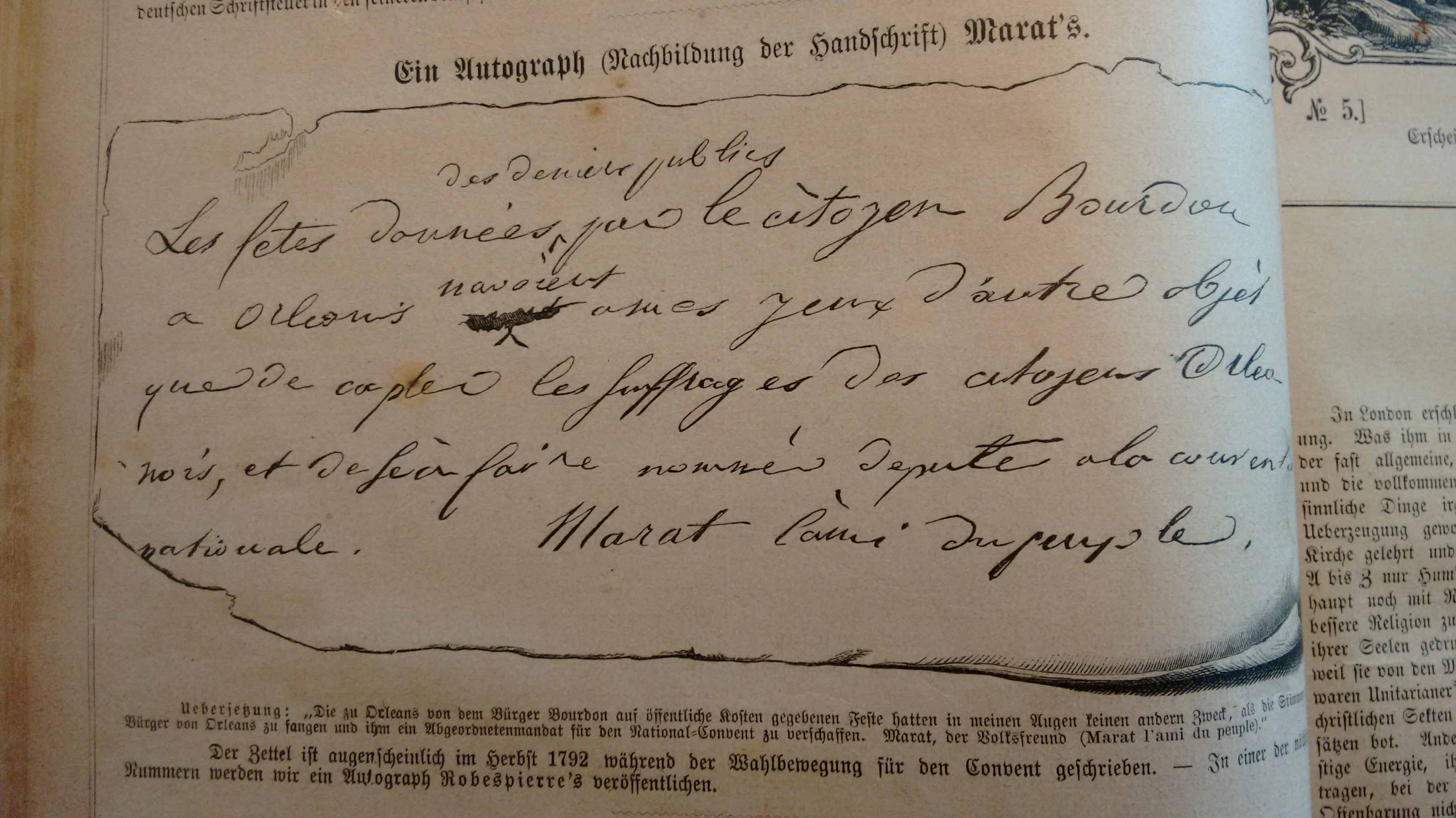 Da una rivista socialista di fine Ottocento (die Neue Welt), traggo copia di due autografi, uno attribuito a Robespierre e uno a Marat, come esempio di grafia francese settecentesca.