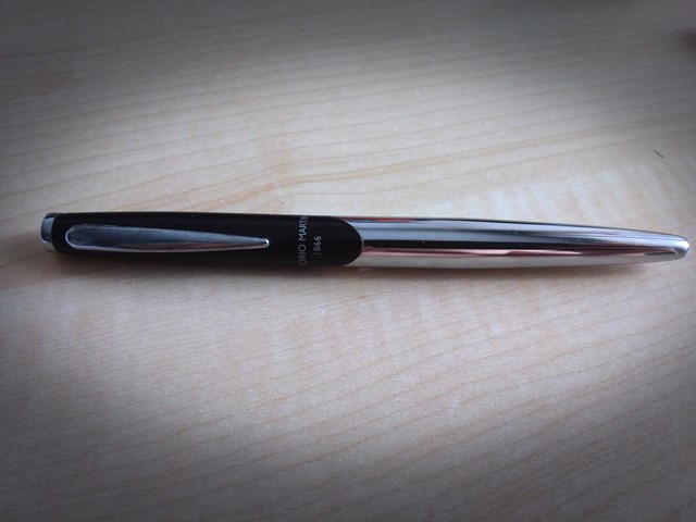 Come potete vedere, è marchiata "Vittorio Martini 1866" (marca a me fino a quel momento sconosciuta). Ho immediatamente apprezzato sia la forma affusolata del fusto, che rende veramente piacevole l'impugnatura e fa risultare la penna comoda sulla mano anche per lunghe sessioni di scrittura, sia il pennino, su cui è inciso un 9 (non ho idea di quale sia la misura corrispondente, ma scriveva come un M). Insomma, è una penna a cui mi sono affezionato. Non so quale sia il suo valore, ma la struttura interamente in metallo me l'ha sempre fatta percepire come una penna abbastanza elegante, che non ho perso occasione di sfruttare anche in occasioni "importanti".