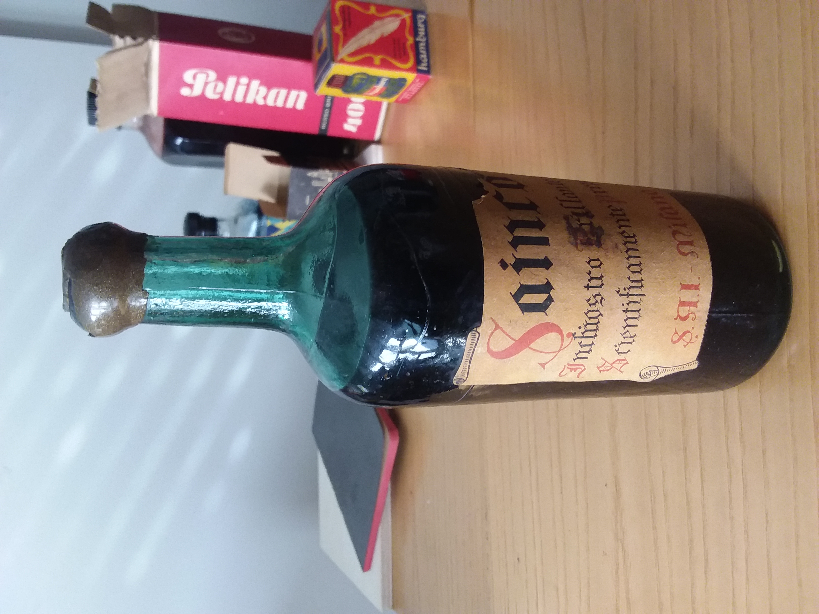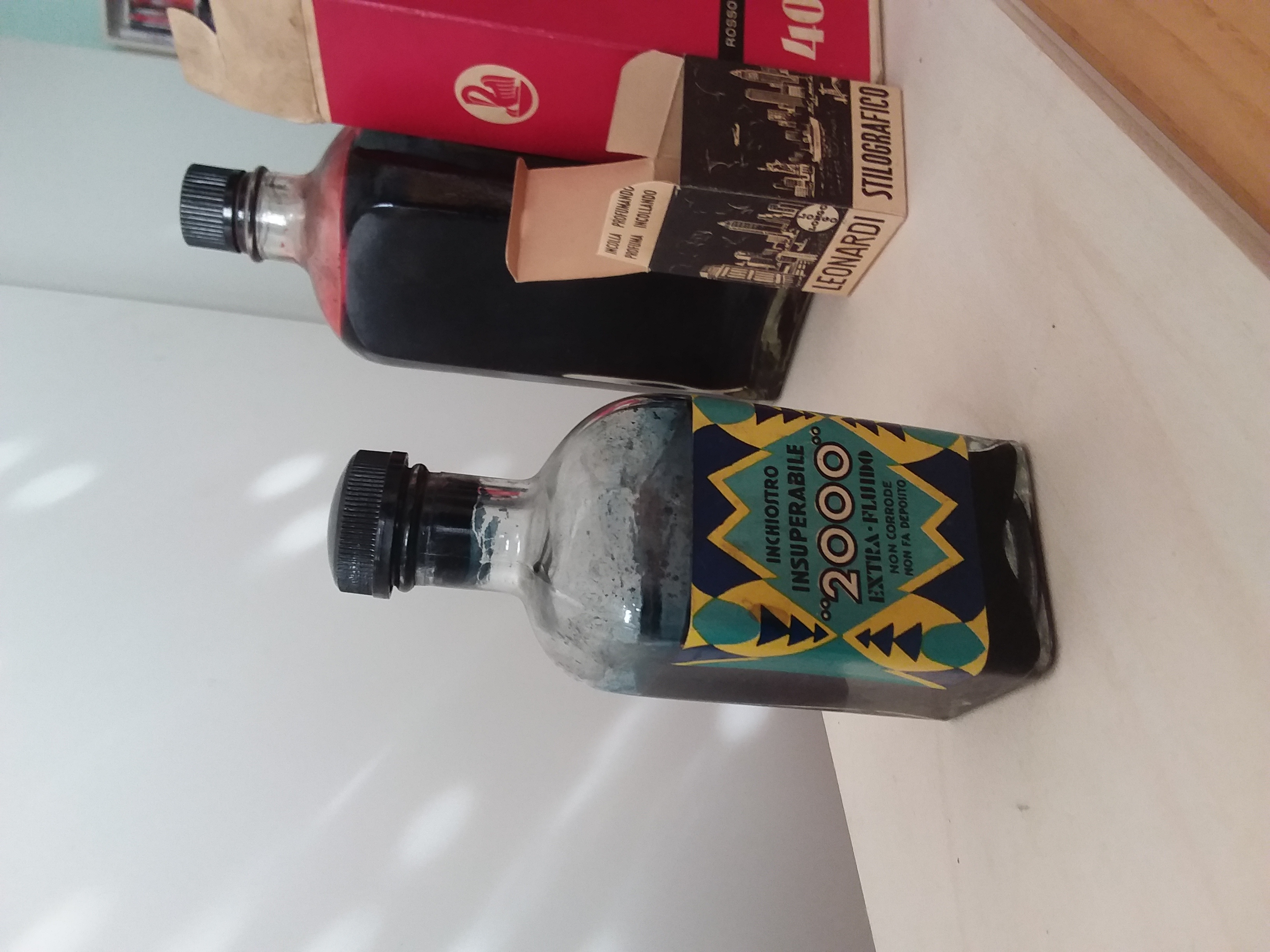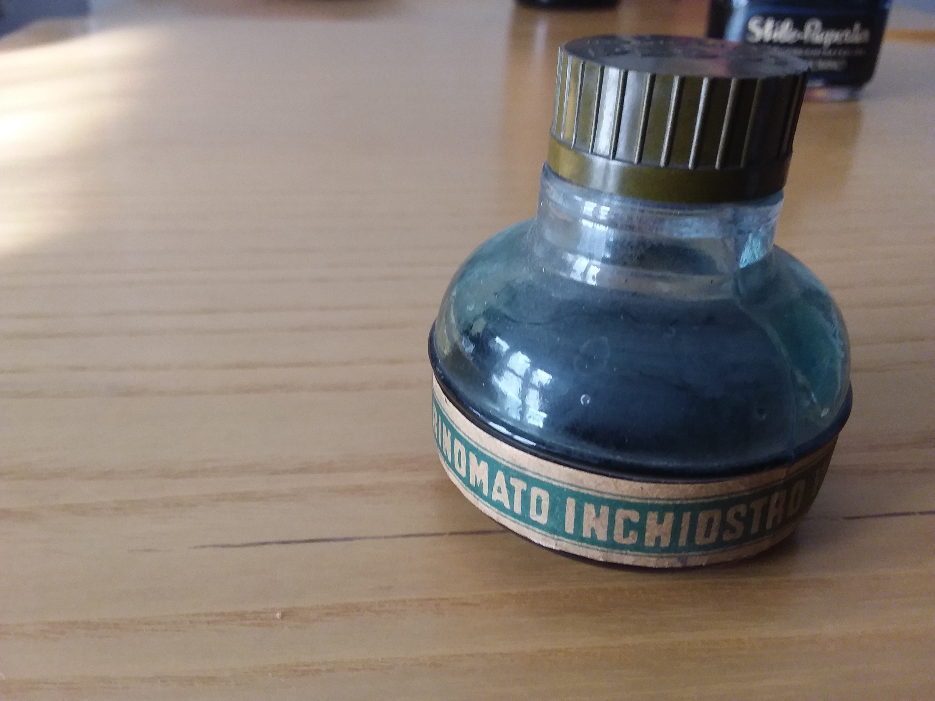Questo è in una bottiglietta molto carina, peccato che la prova di scrittura con il pennino mostri un verde ormai molto impallidito ("rinomato inchiostro verde Pessi" recita l'etichetta)