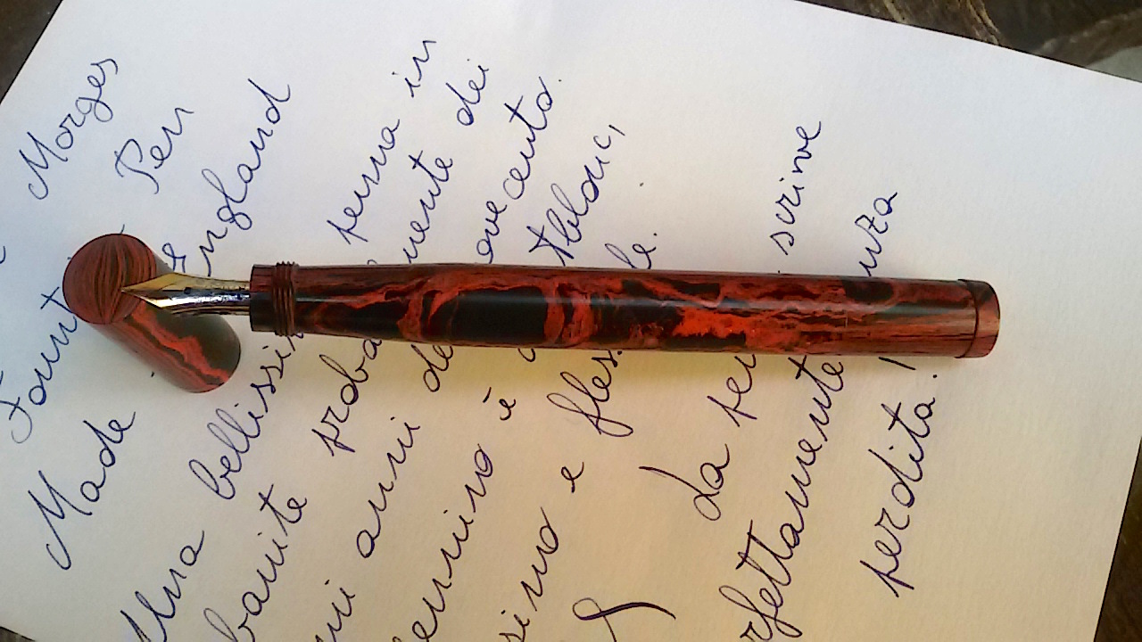Buongiorno, oggi vi presento questa a mio parere bella penna in ebanite. È una safety filler in ebanite rossa fiammata, riporta il nome del produttore Richard Morges e Made in England. Il pennino retrattile è stata una sorpresa in quanto è un Montblanc 14c probabilmente di una 144 anni cinquanta. L' alimentatore è sempre in ebanite ed è prodotto con gli stessi colori della penna, cosa che ho visto anche su molte Waterman. In rete non ho trovato molte indicazioni riguardo questo produttore, daterei la penna ai primi anni venti del secolo scorso.