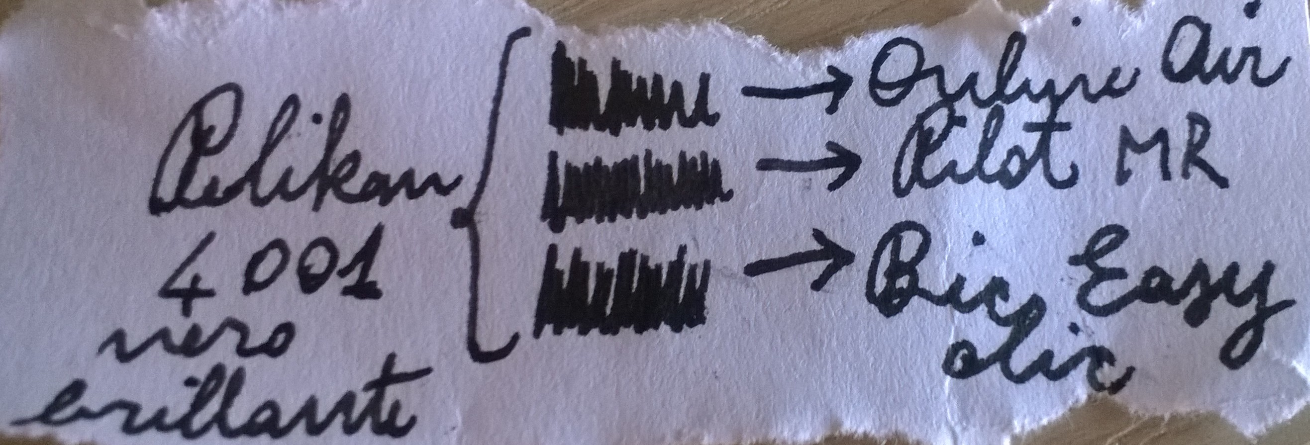 Confrontando i 3 tratti, si nota che lo stesso inchiostro - Pelikan 4001 nero brillante - appare nero nei casi di Online e Bic; risulta grigio scuro (comunque più chiaro rispetto agli altri) se usato nella Pilot, per poi diventare nero nella parte finale del tratto.
