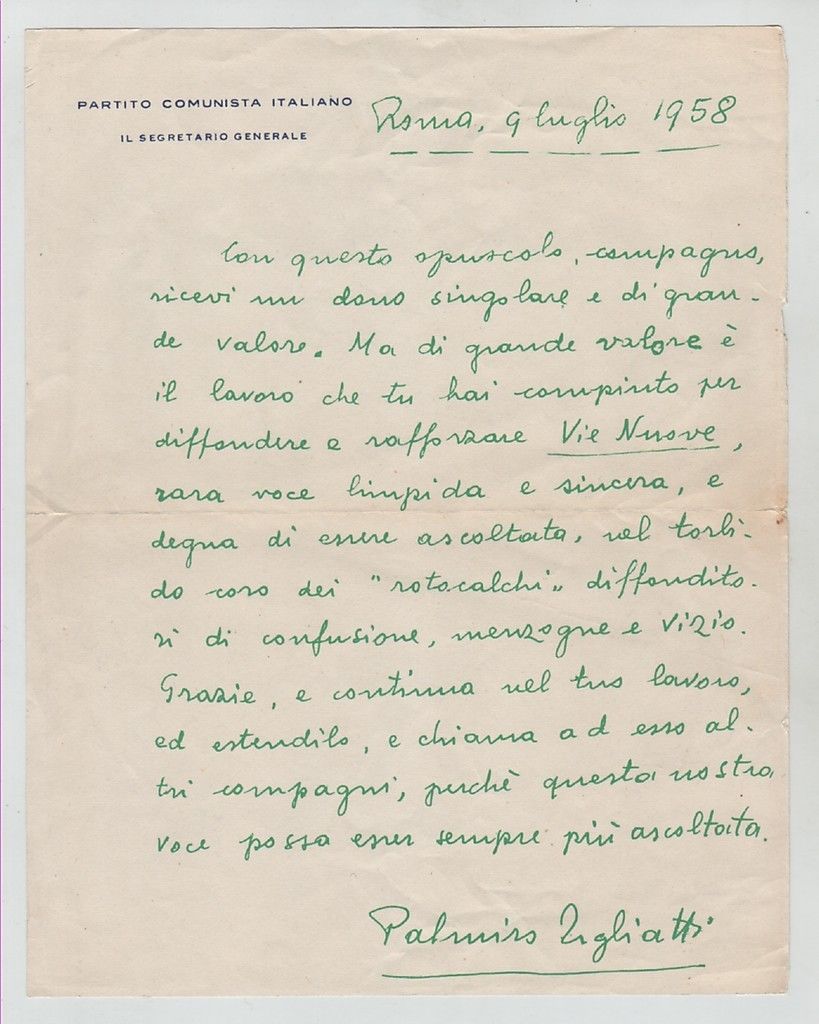 Allego un autografo che risale al luglio del 1958 di una personalità importante nella scena politica di quel torno di tempo.