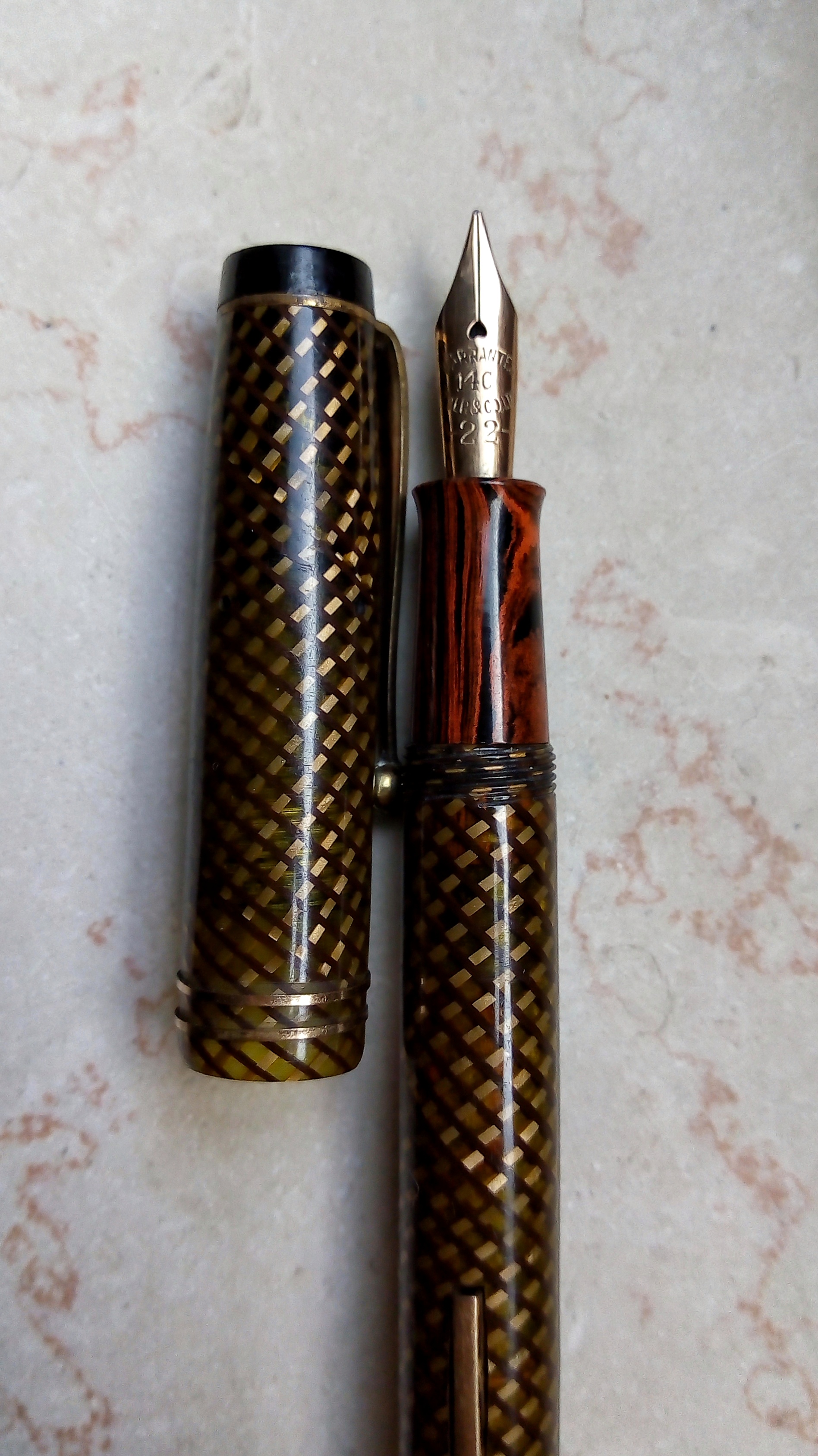 Negli anni Trenta erano diverse le marche che proponevano corpi e cappucci in celluloide e sezioni più testine cappuccio in ebanite: Mabie Todd, Parker, Mentmore, De La Rue, Summit... E penso anche Waterman's ed Eversharp, anche se non ne sono certo.