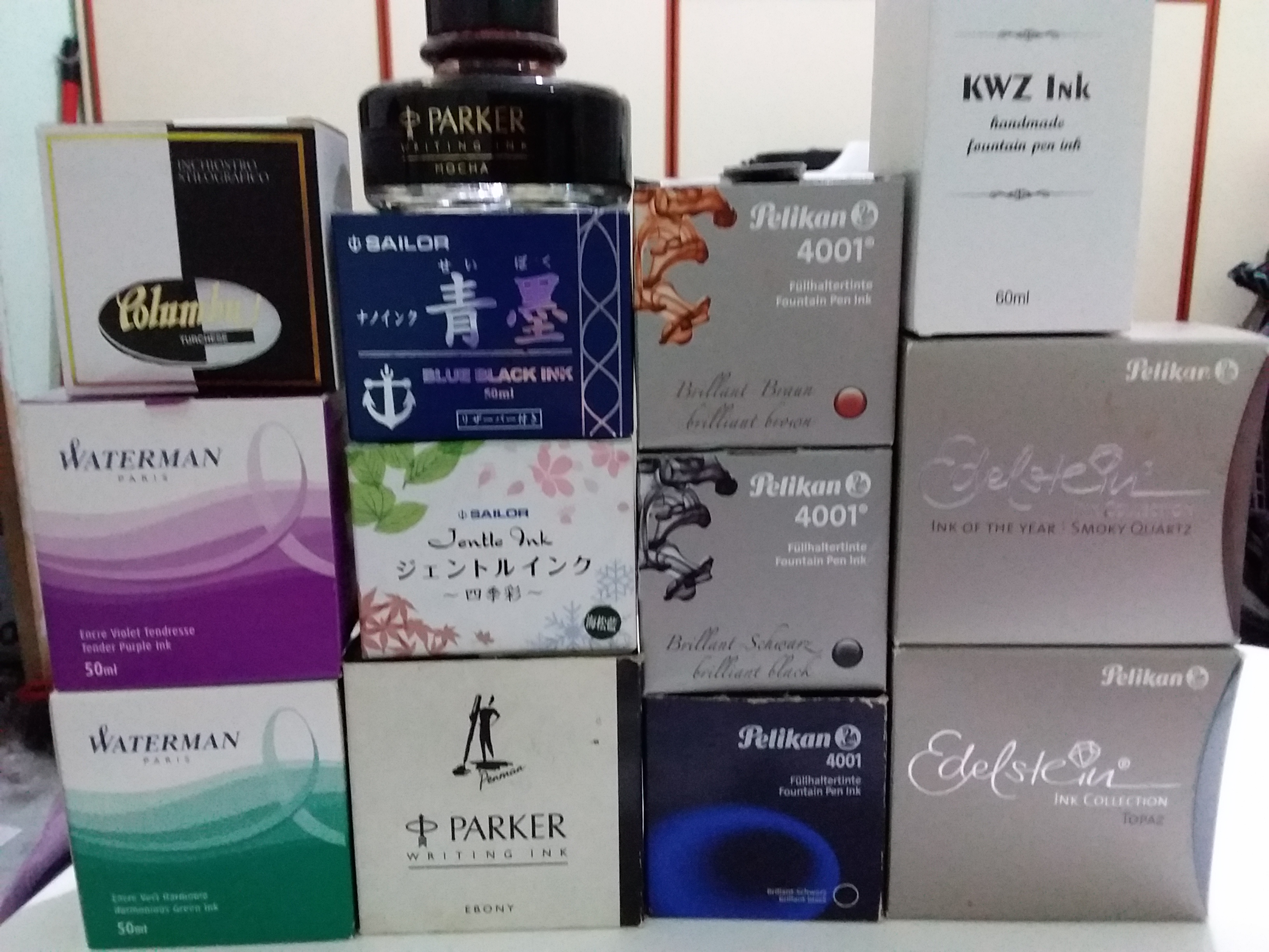 I Waterman sono il viola tenerezza e il verde armonia. I Parker sono Ebony e Mocha. I 4001 sono il nero brillante di due età diverse e il bruno brillante, gli Edelstein sono il Topaz e lo Smoky Quartz. I Sailor sono il Miruai gentle Jnk, il permanente Sai Boku, il Columbus è turchese e il KWZ è ul blu#2. E il verde Delta che poverino ho dimenticato di fotografare
