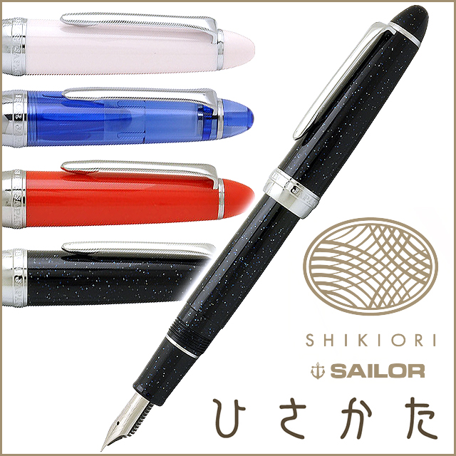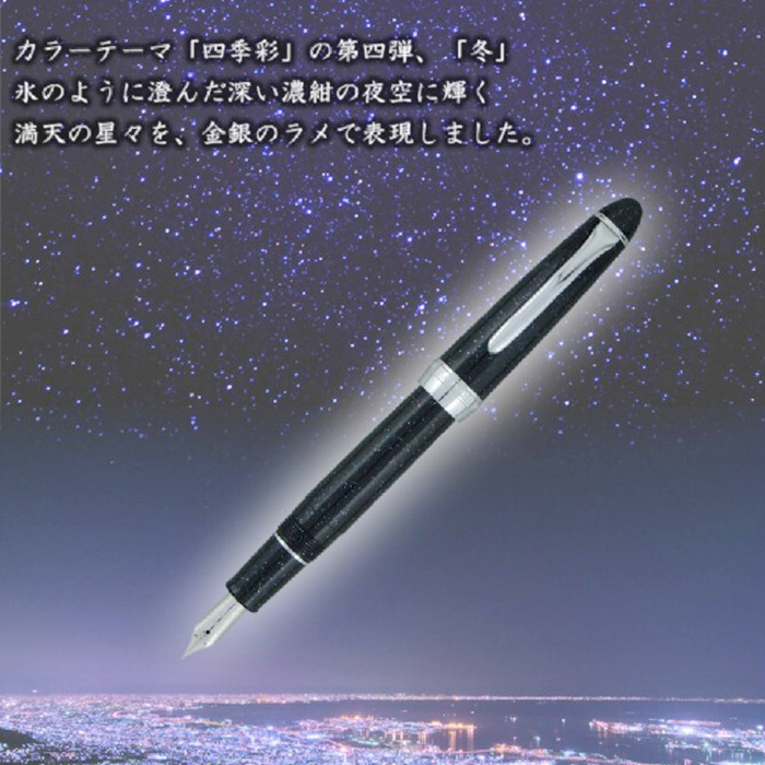 La Sailor Procolor 500 Shikisai “Stardust”, fa parte di una serie di quattro penne dedicate alle stagioni Shikiori ひさかた, tutte munite di pennino fine in acciaio. Le altre tre sono la Sakura, la Uchimizu e la Akanezora, dedicate rispettivamente alla primavera, all'estate e all'autunno. L'aspetto generale mi aveva colpito già dal primo momento. La resina è di un profondo colore nero, tempestata di particelle che riflettono la luce producendo uno splendido effetto da cielo stellato in una limpidissima notte invernale, senza Luna. Ebbene, sono rimasto folgorato sulla via di Damasco! Il pennino, seppur rigido è precisissimo come un rasoio e scorrevole; produce un tratto fine come un capello, “like a nail” direbbero gli Angli.