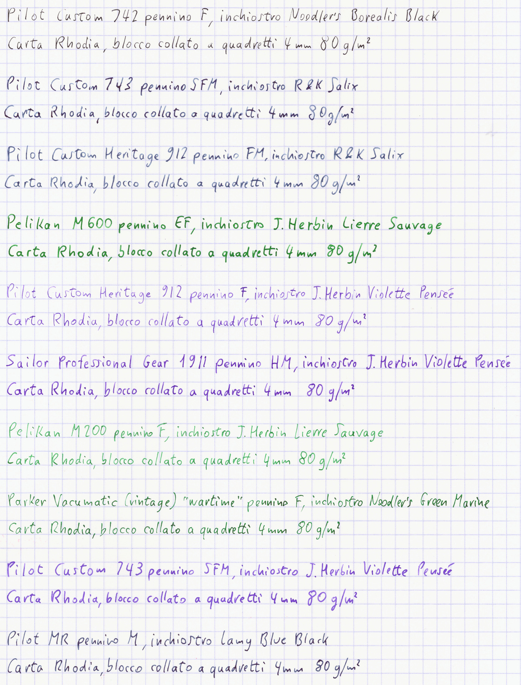 Il pennino più scorrevole è proprio l'SFM #15 della 743; tuttavia questa sua estrema scorrevolezza porta a volte, con inchiostri poco liquidi come questo Salix, a salti e false partenze su alcune carte, compresa questa Rhodia.