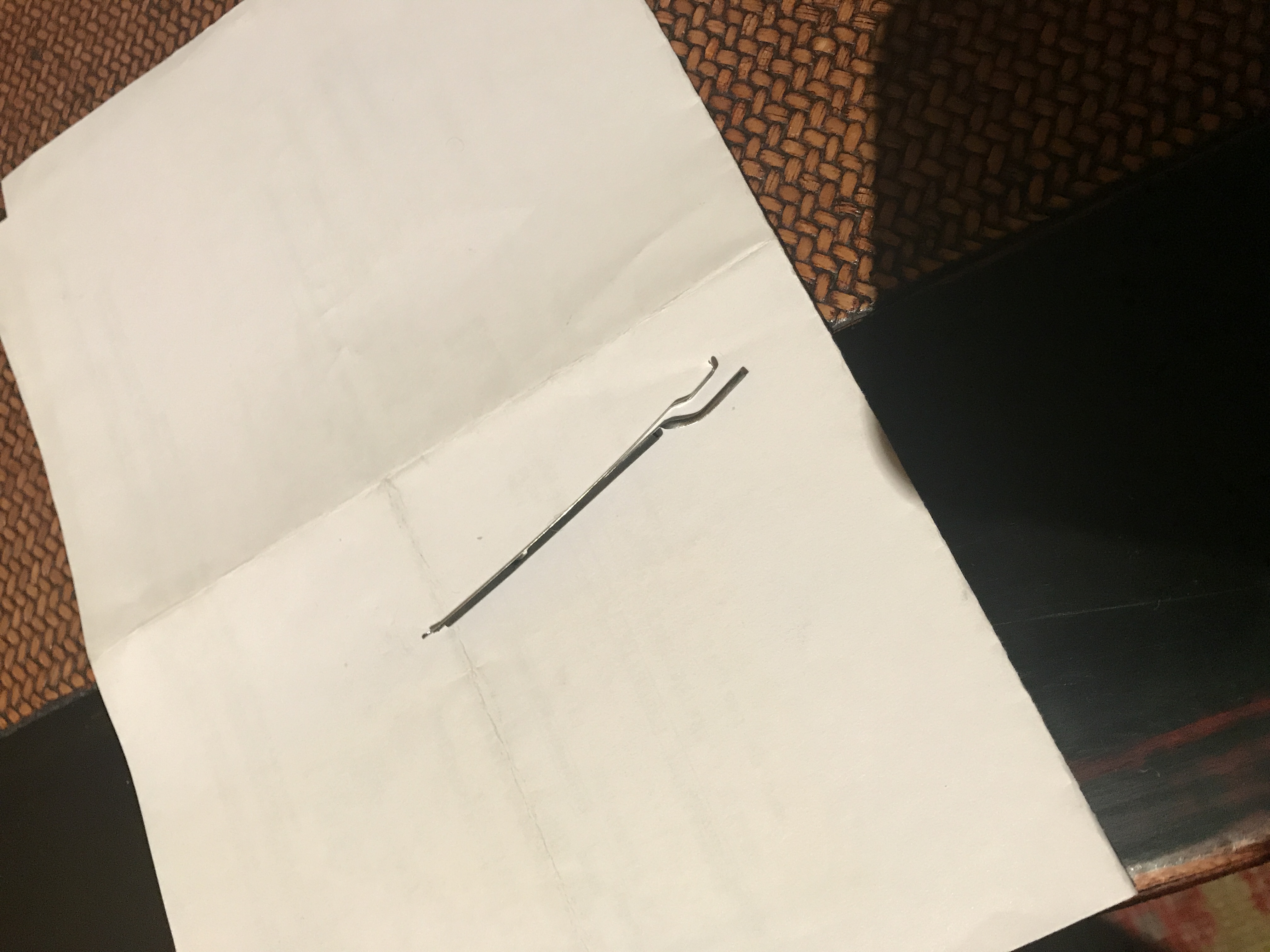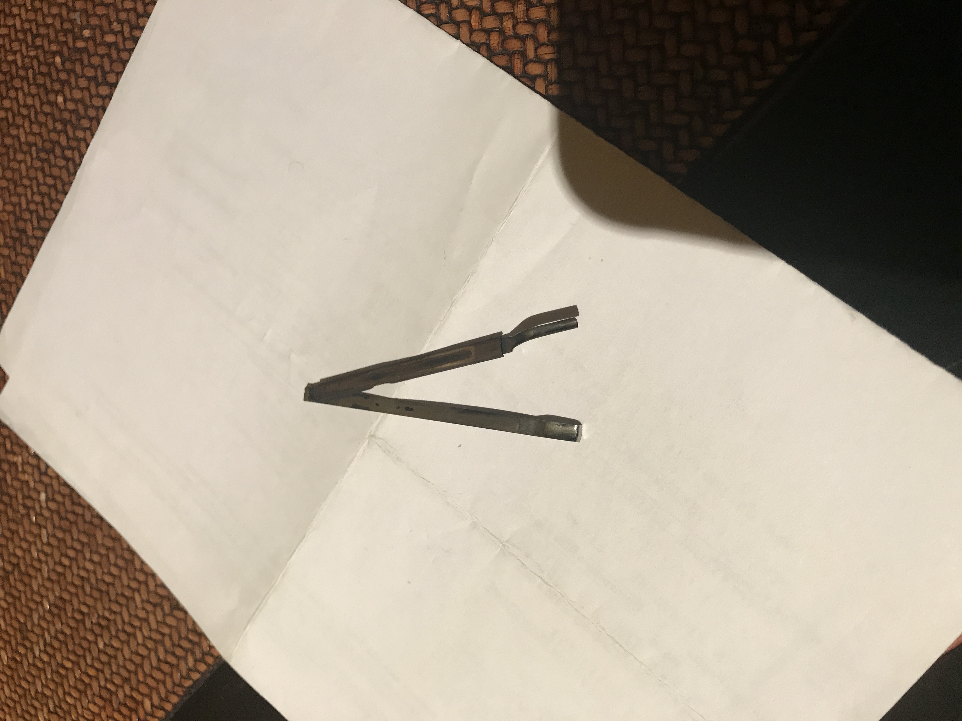 Dopo aver smontato con immensa soddisfazione la mia Parker Duofold seguendo il Wiki di Simone, ho verificato che il sacchetto è deteriorato e cristallizzato . Ho provveduto a toglierlo ed a ripulire l’attacco al gruppo. Sfilando la barra ho notato che è fatta come un fermaglio : la parte più alta si inserisce nel pulsante mentre la più bassa sulla base del foro del fondello infatti a pulsante montato si nota la linguetta che sporge. Guardando bene ho notato che il fermaglio è composto da due pezzi e non uno unico. Vorrei capire se si collegano entrambe come vi mostro in foto o se la barra è rotta e riparata a cavolo. Grazie per i vostri commenti.