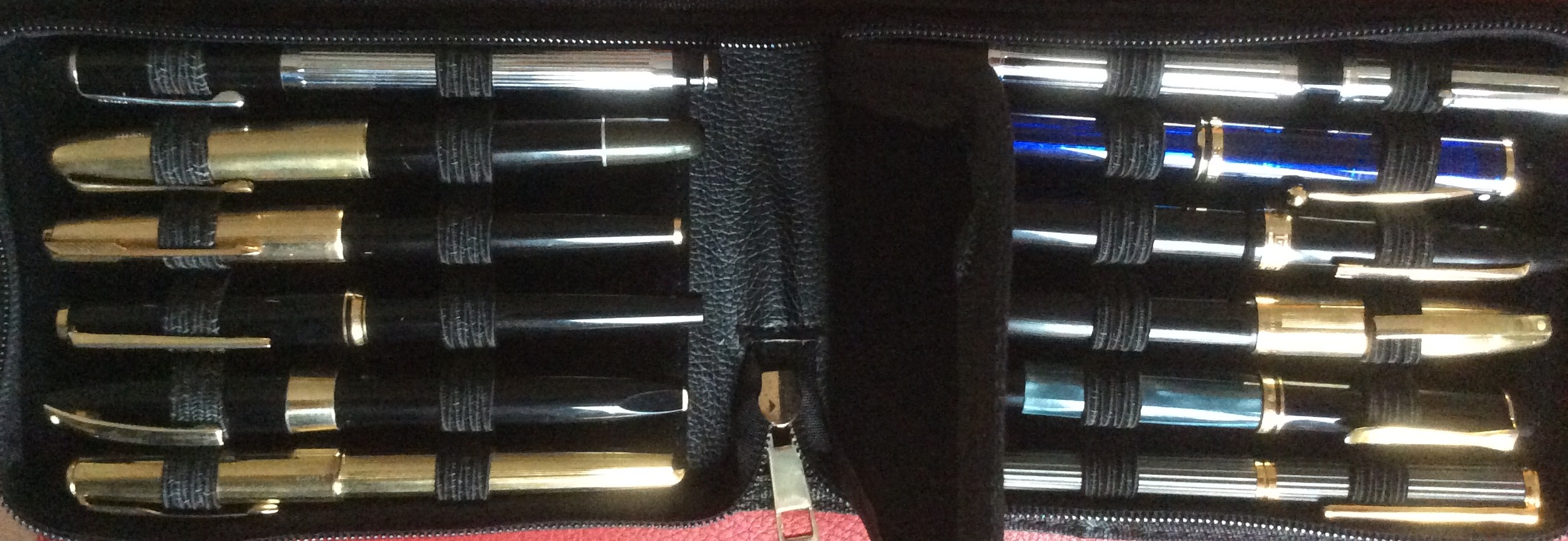 Attualmente le penne che utilizzo o caricate sono: Wahl eversharp Skyline, Aurora 88 prima serie, Minerva 60, Pelikan 120, Noodler's Boston Safety Pen, Kaweco Sport moderna, Sheaffer Imperial 330, Aurora 98, Aurora Marco Polo, Parker 51, tutte caricate con inchiostro Pelikan Blue Royal 4001; tranne una Hero 616 jumbo caricata con inchiostro MontBlanc Burgundy Red.