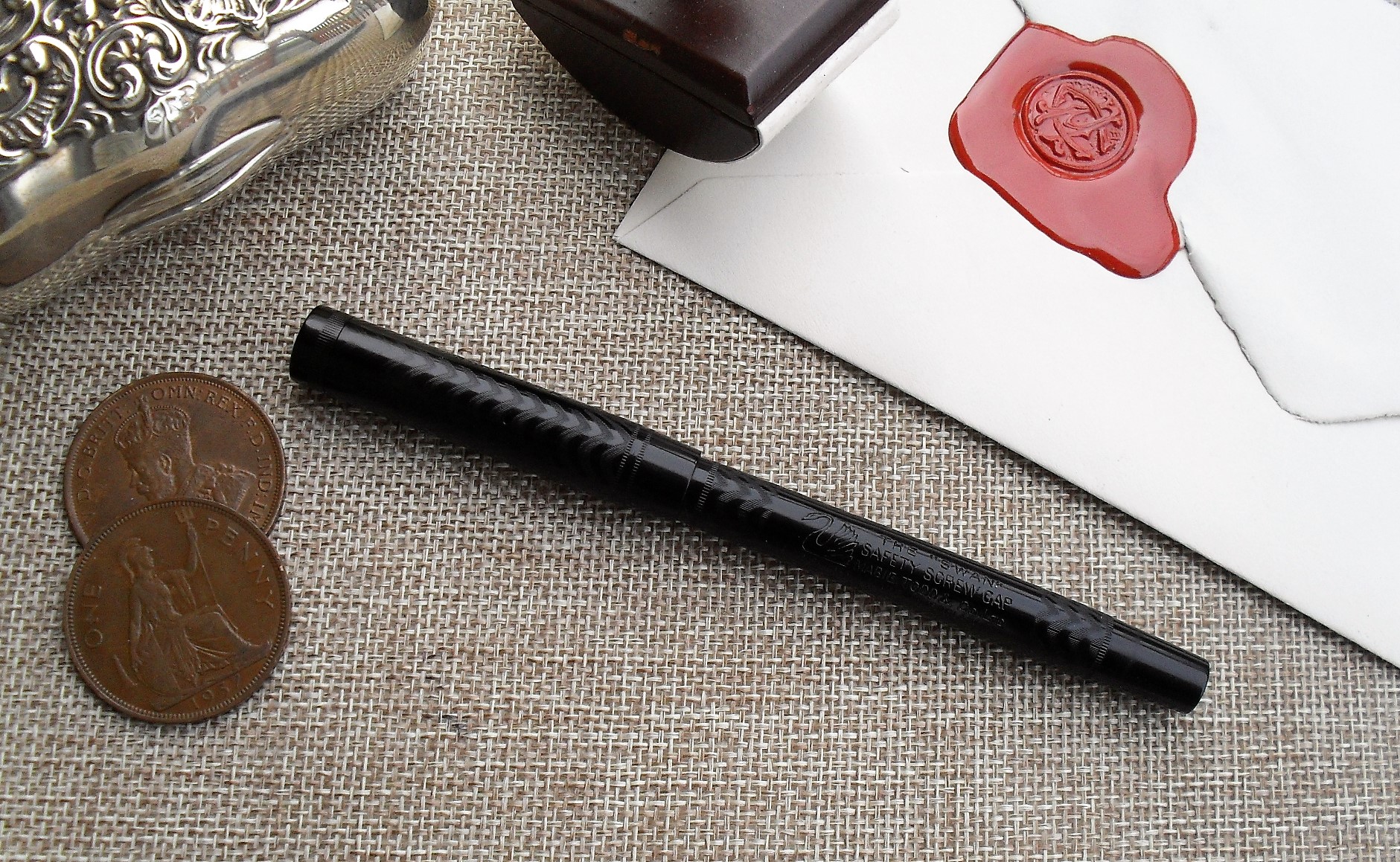 Siamo in piena “Belle Epoque” ed è proprio nel 1911 che Mabie Todd & Co. Ltd introduce, insieme al modello 300, la nuova stilografica Swan Safety Screw Cap. Si tratta di una penna in ebanite, con caricamento a contagocce (“eyedropper”) e pennino d’oro a 14 carati. Rimarrà in produzione, con tutta probabilità, almeno fino al 1920, quando il marchio britannico introdurrà la sua prima stilografica a levetta.