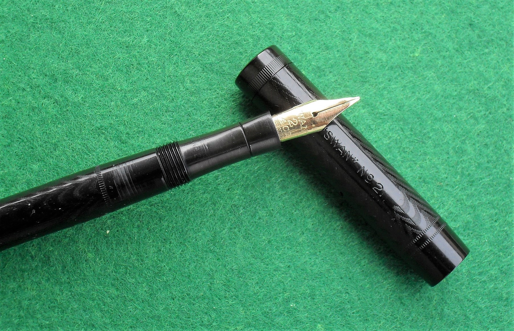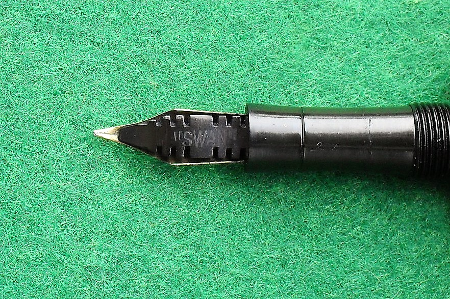 Il pennino è un classico Swan n. 2 flessibile con punta media, eccellente e molto piacevole da usare, sorretto benissimo nelle sue prestazioni da un alimentatore in ebanite che assicura un flusso mai magro, anche quando la flessibilità del pennino viene utilizzata senza risparmio. Del resto, Swan è rimasta famosa anche per i suoi pennini flessibili. E’ possibile che la “Swan n° 2” si rivolgesse ad un pubblico diverso da quello pensato per la coeva Swan 300, perché quest’ultima veniva normalmente dotata di pennini non flessibili, proposti in tre varianti alternative: Posting, Manifold e Stenograph.
