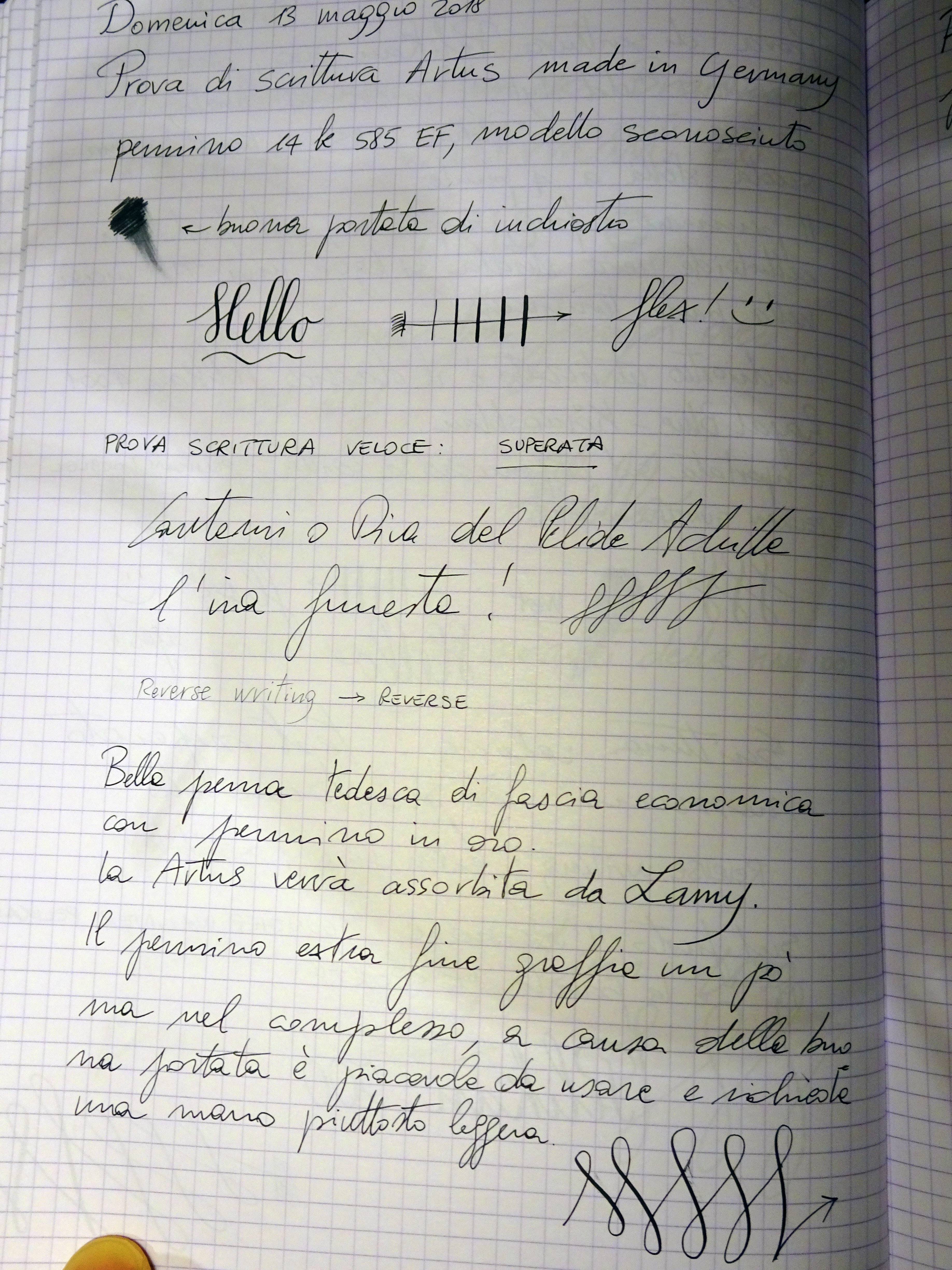 Il pennino riporta la scritta "Artus" in stampatello minuscolo e poi "14 k 585 II". Mostra una buona flessibilità che, da EF, lo porta ad arrivare ad una misura B o addirittura BB.