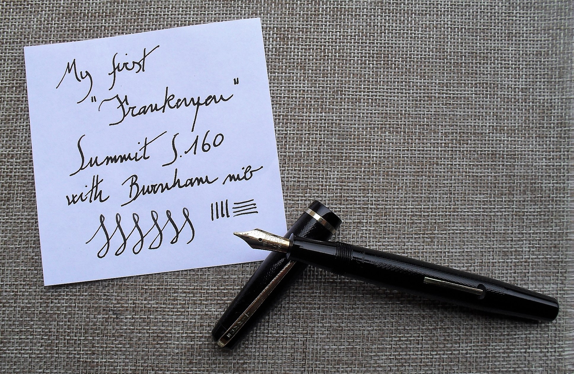 Ne approfitto per mostrarvi il risultato finale. Il pennino è un ottimo inglese flessibile (l'originale Summit è tagliato in corrispondenza del foro d'aereazione). Si tratta, insomma, di una "frankenpen" ! :D
