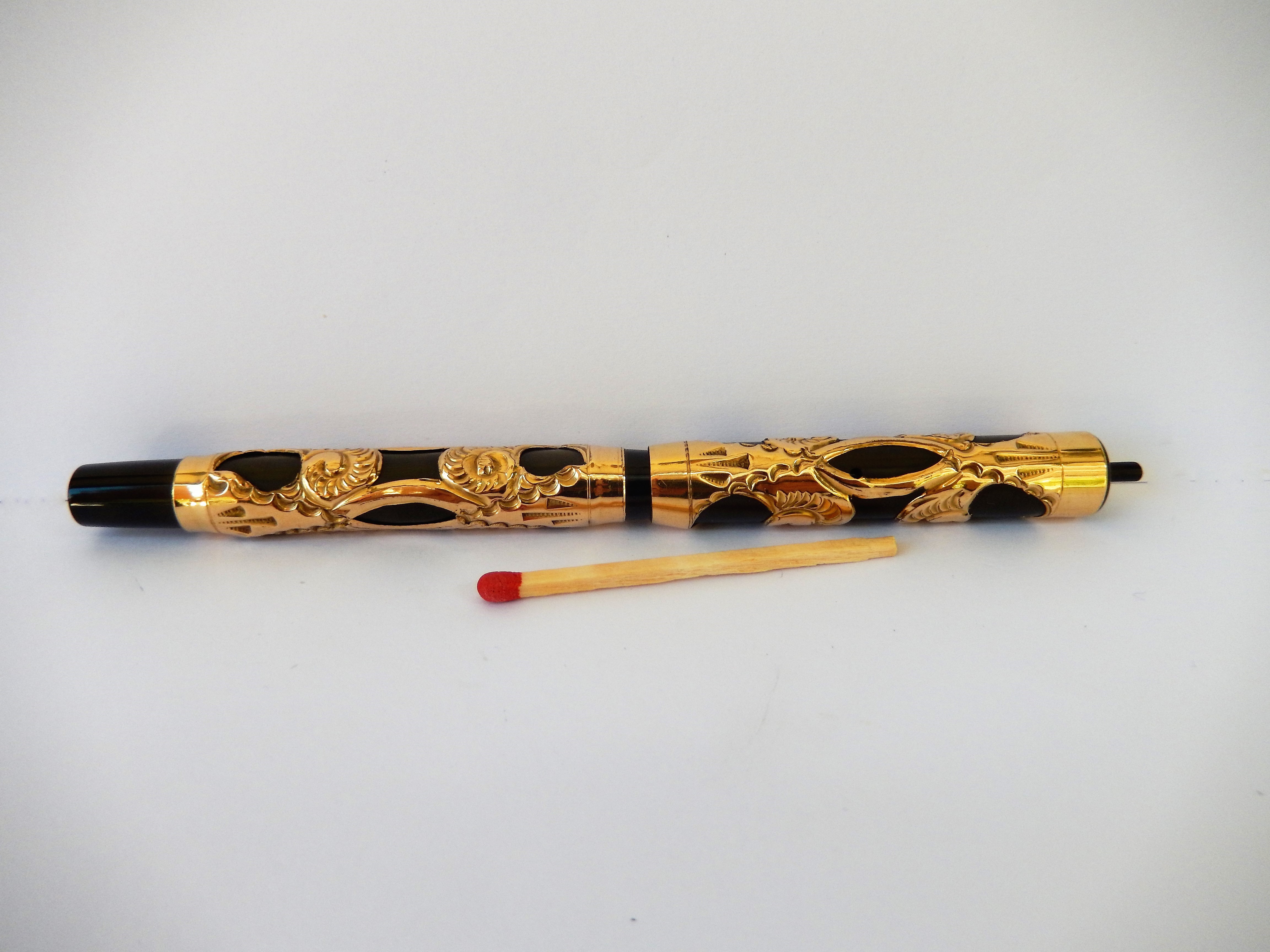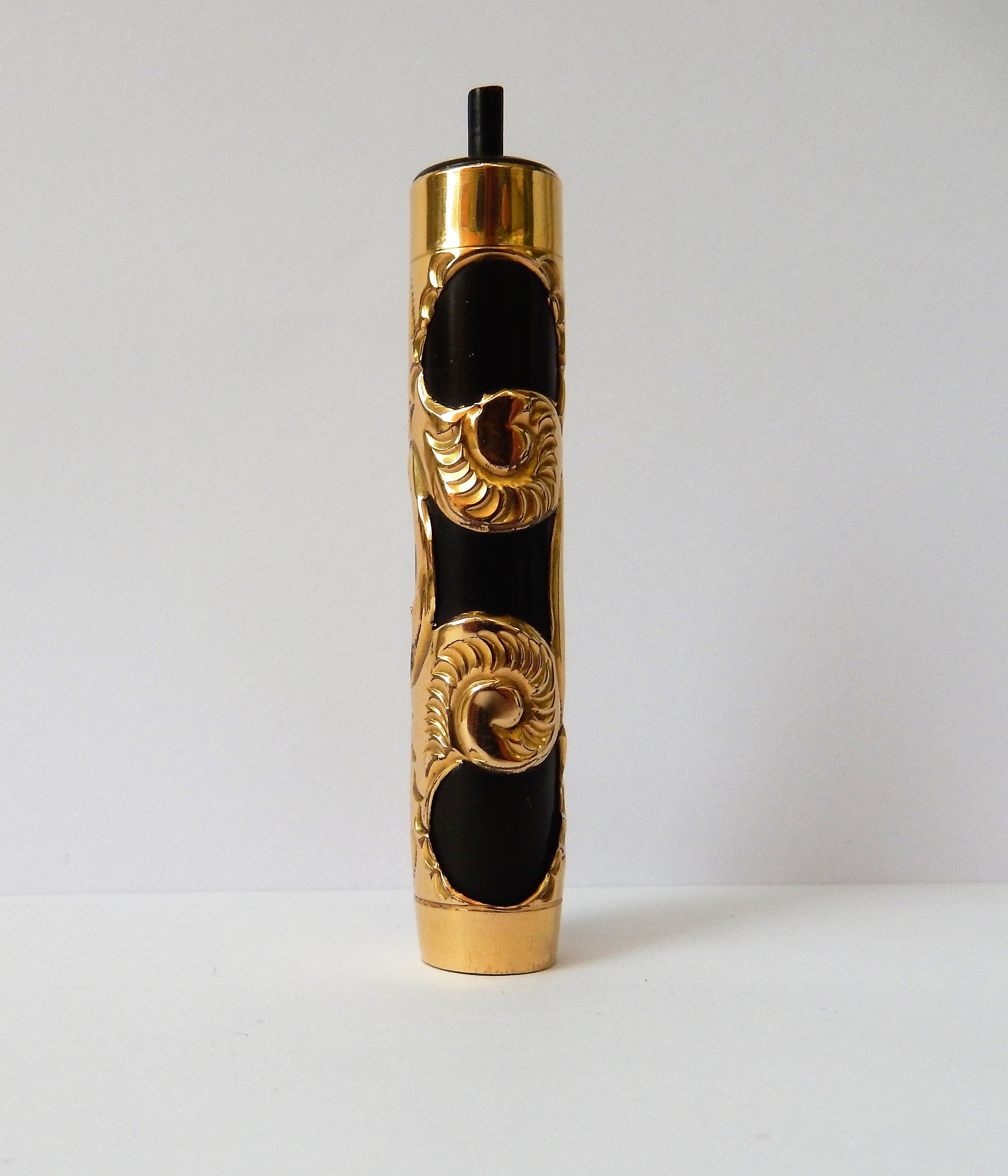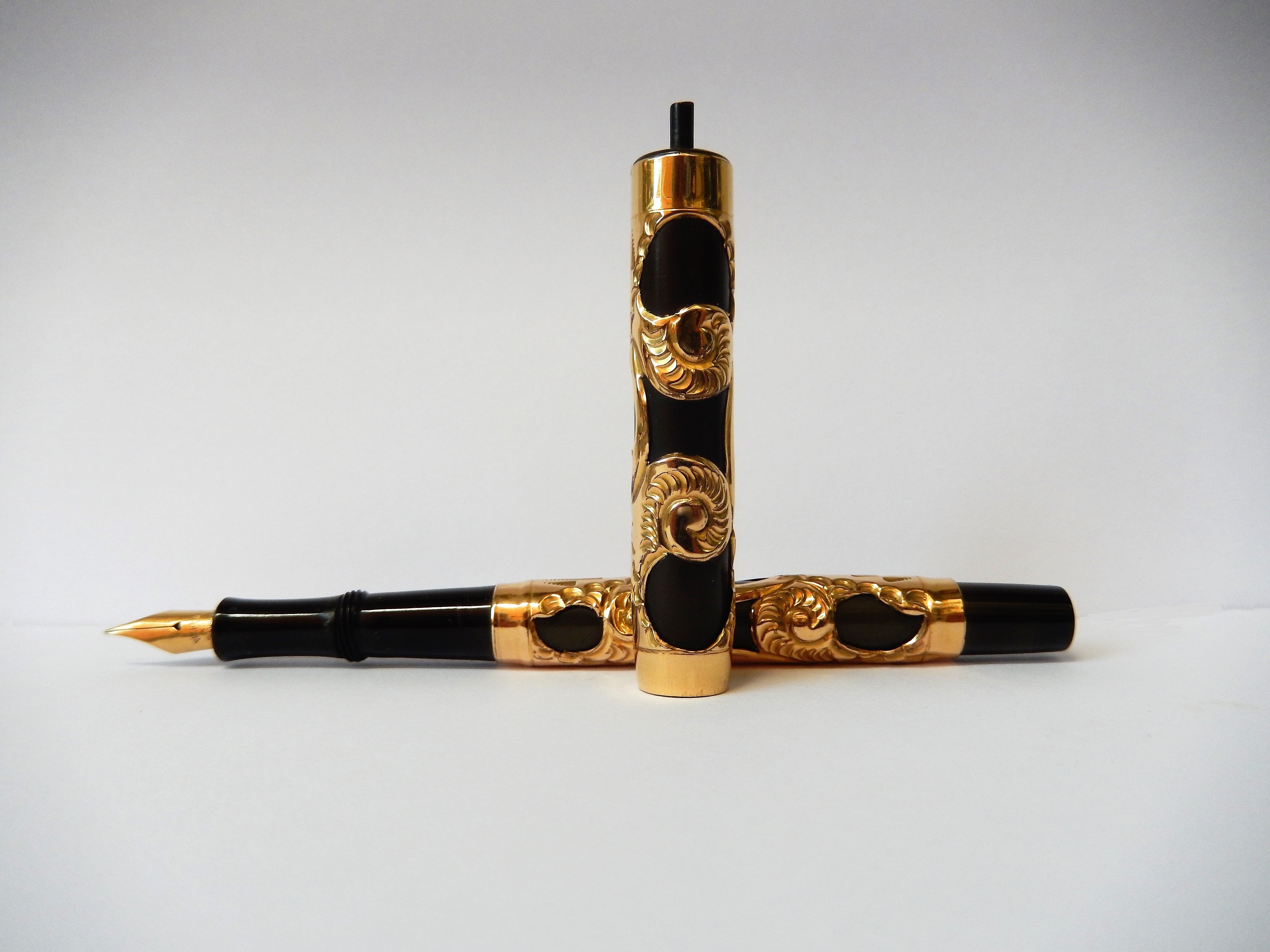 Sia il corpo che il cappuccio sono ricoperti da un rivestimento in rilievo dorato decorato da motivi tipo "sea snails", in un bel contrasto con il nero brillante dell'ebanite. Lo spazio riservato ad una eventuale personalizzazione è libero.