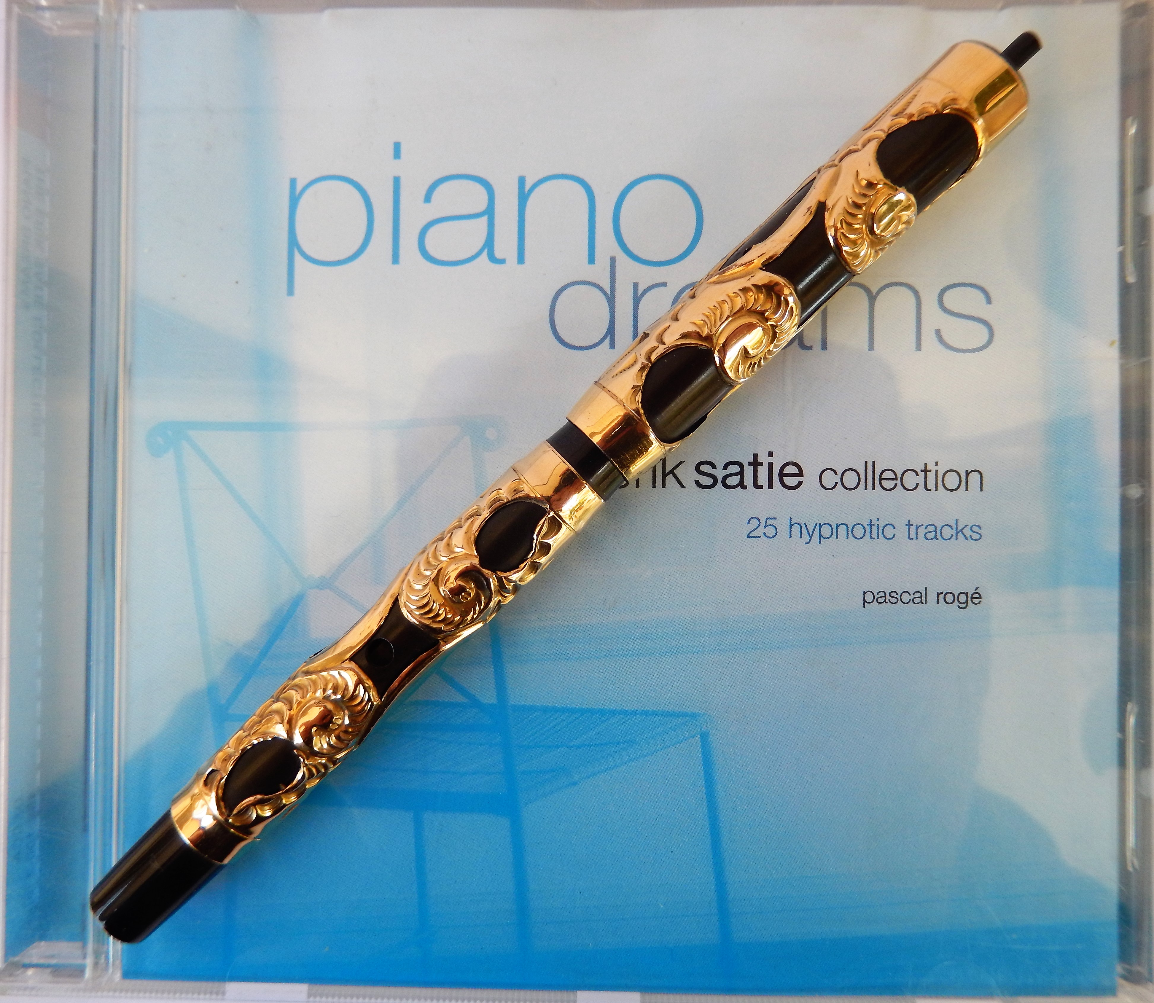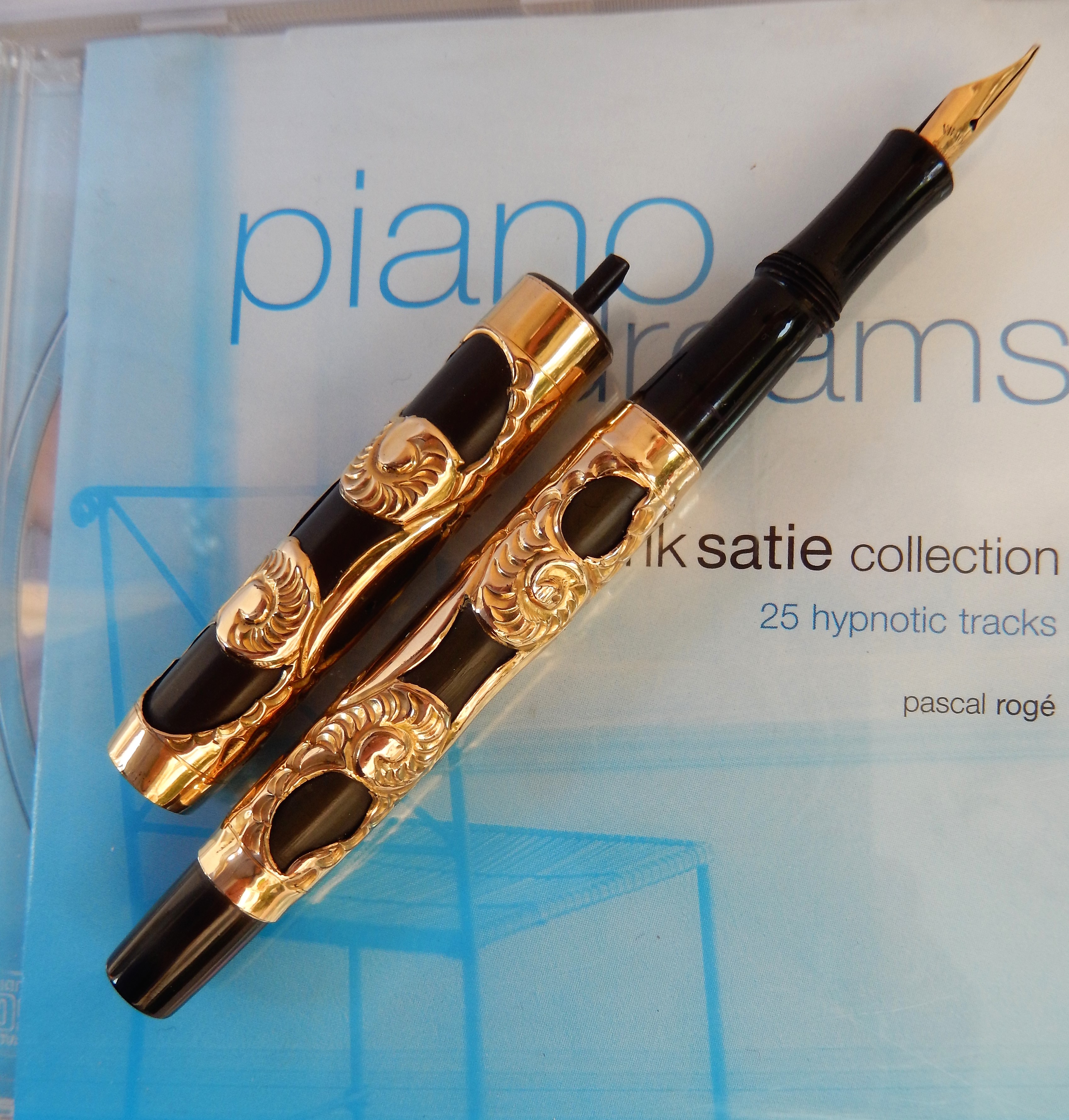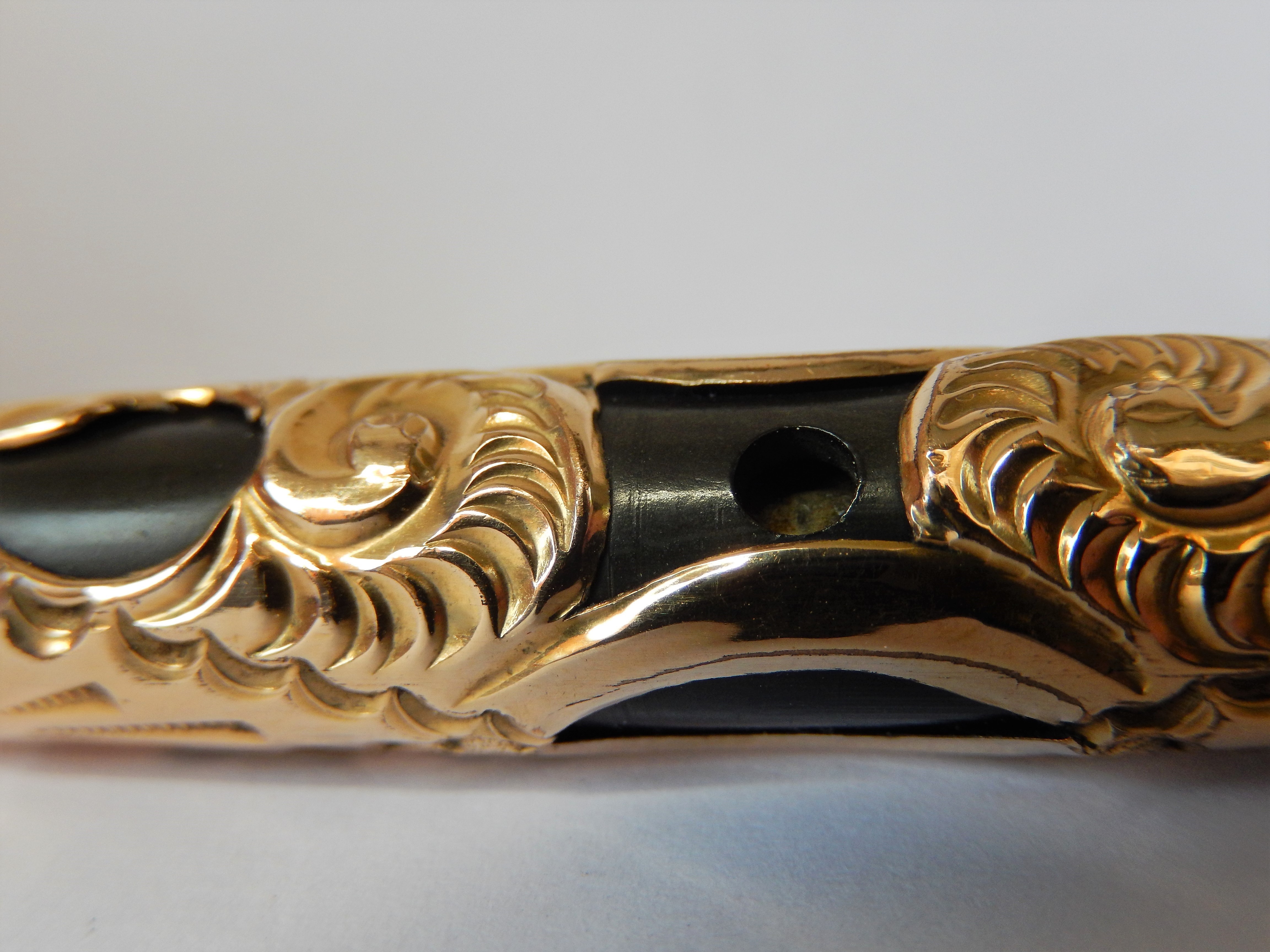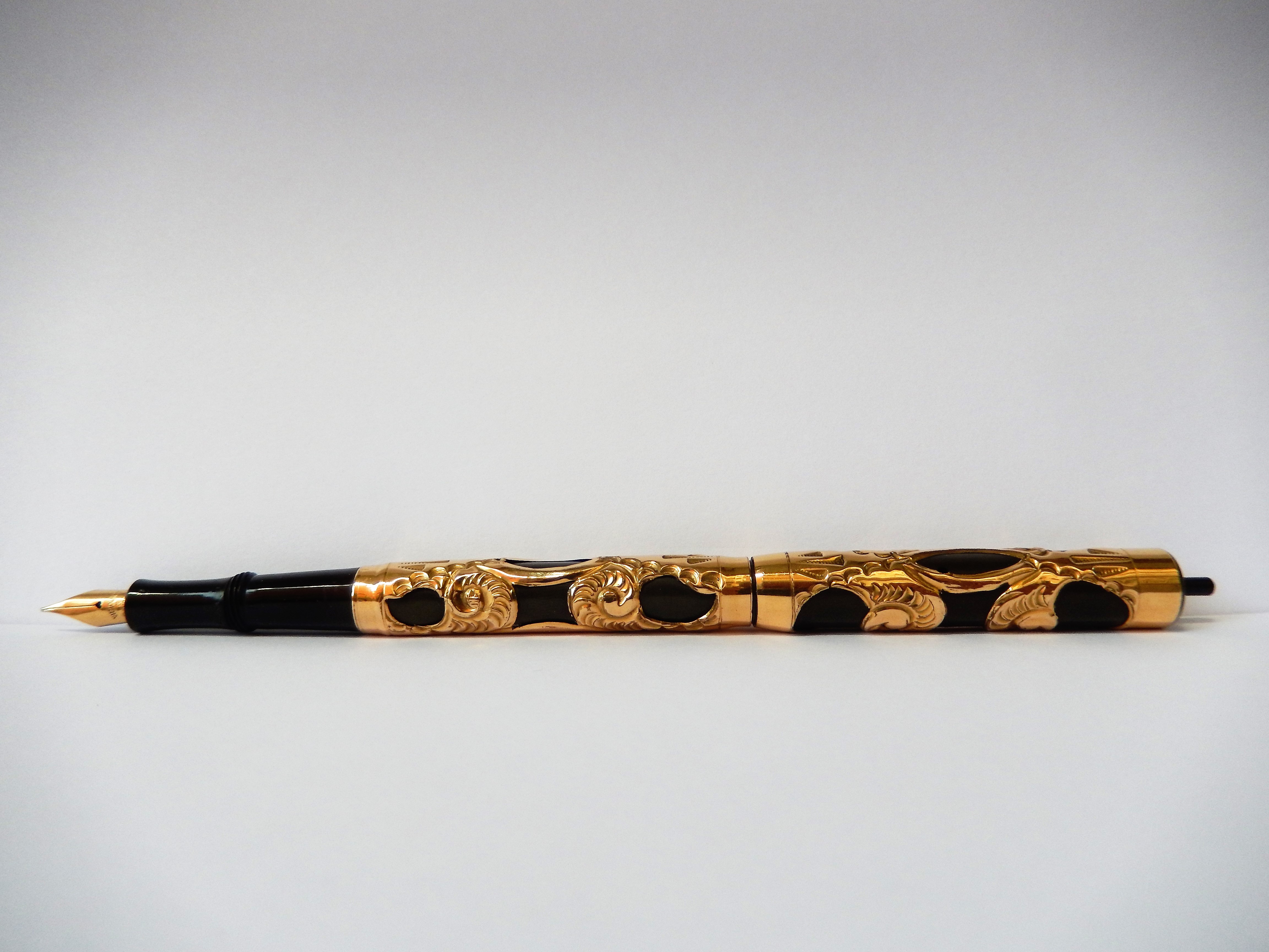 Sia il corpo che il cappuccio sono ricoperti da un rivestimento in rilievo dorato decorato da motivi tipo "sea snails", in un bel contrasto con il nero brillante dell'ebanite. Lo spazio riservato ad una eventuale personalizzazione è libero.