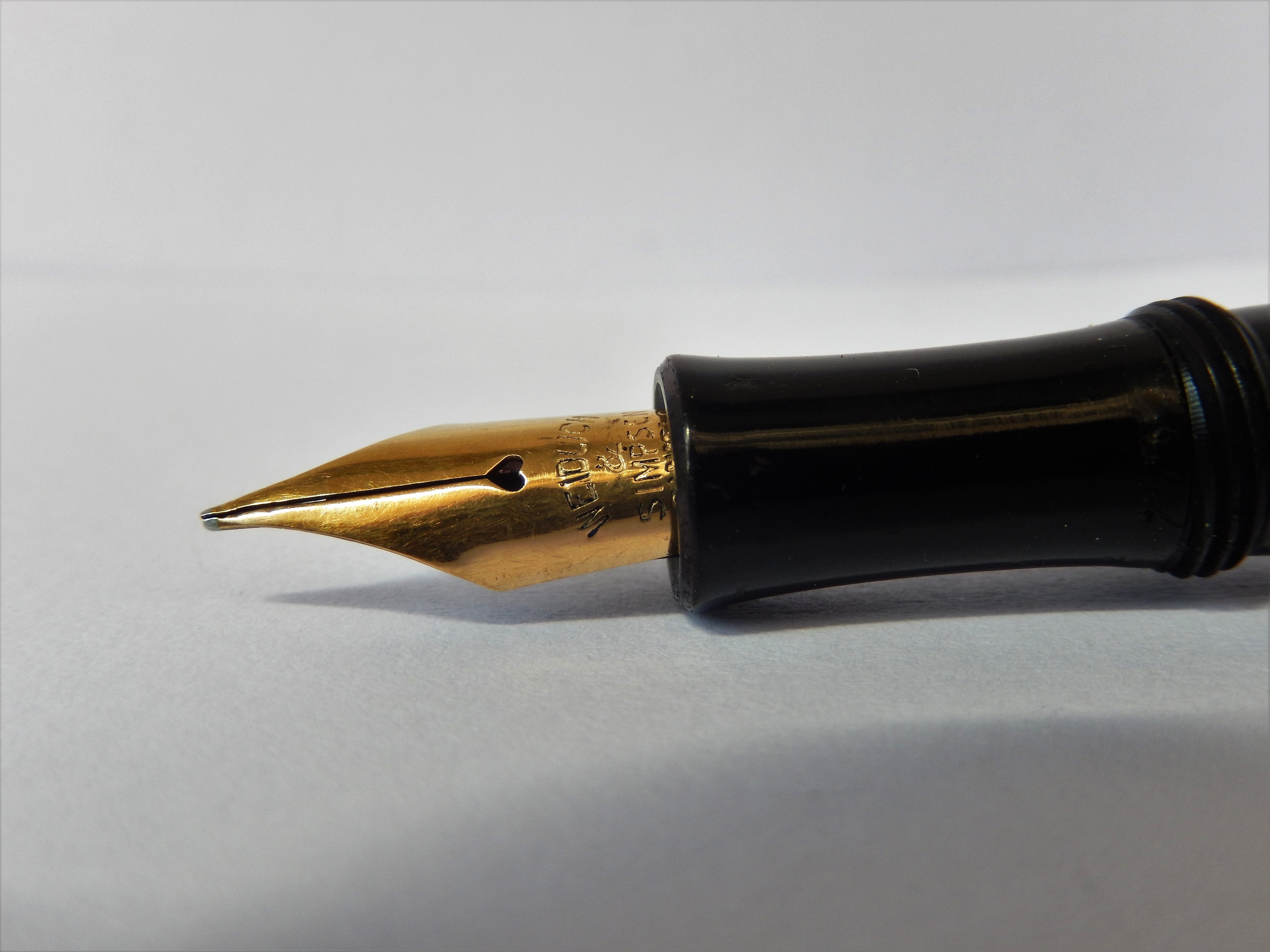 Coevo ed originale il pennino, un Weidlich & Simpson n. 2, ancora ricco di iridio e di media flessibilità, che insieme al bilanciamento della penna consente una scrittura morbida e piacevole. I pennini invece marcati solo " Weidlich" furono prodotti successivamente e riferibili alla fine degli anni venti, mentre daterei la penna ed il pennino in presentazione fra il 1905 ed il 1910.