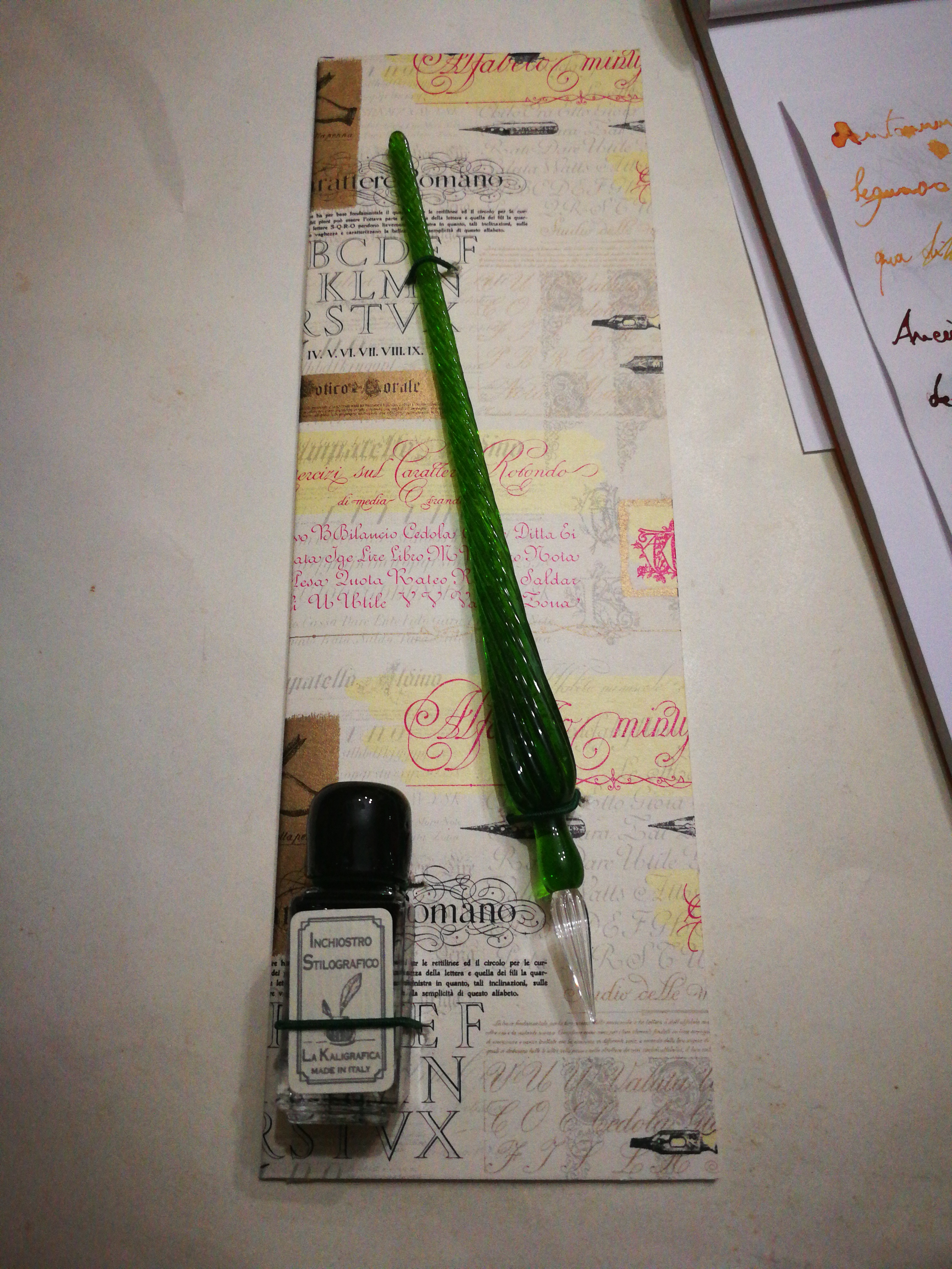 Allego foto della mia cannuccia di vetro: la Kaligrafica verde. Costo 10 €. Ideale anche per intinzione in boccette anche dalla bocca stretta.