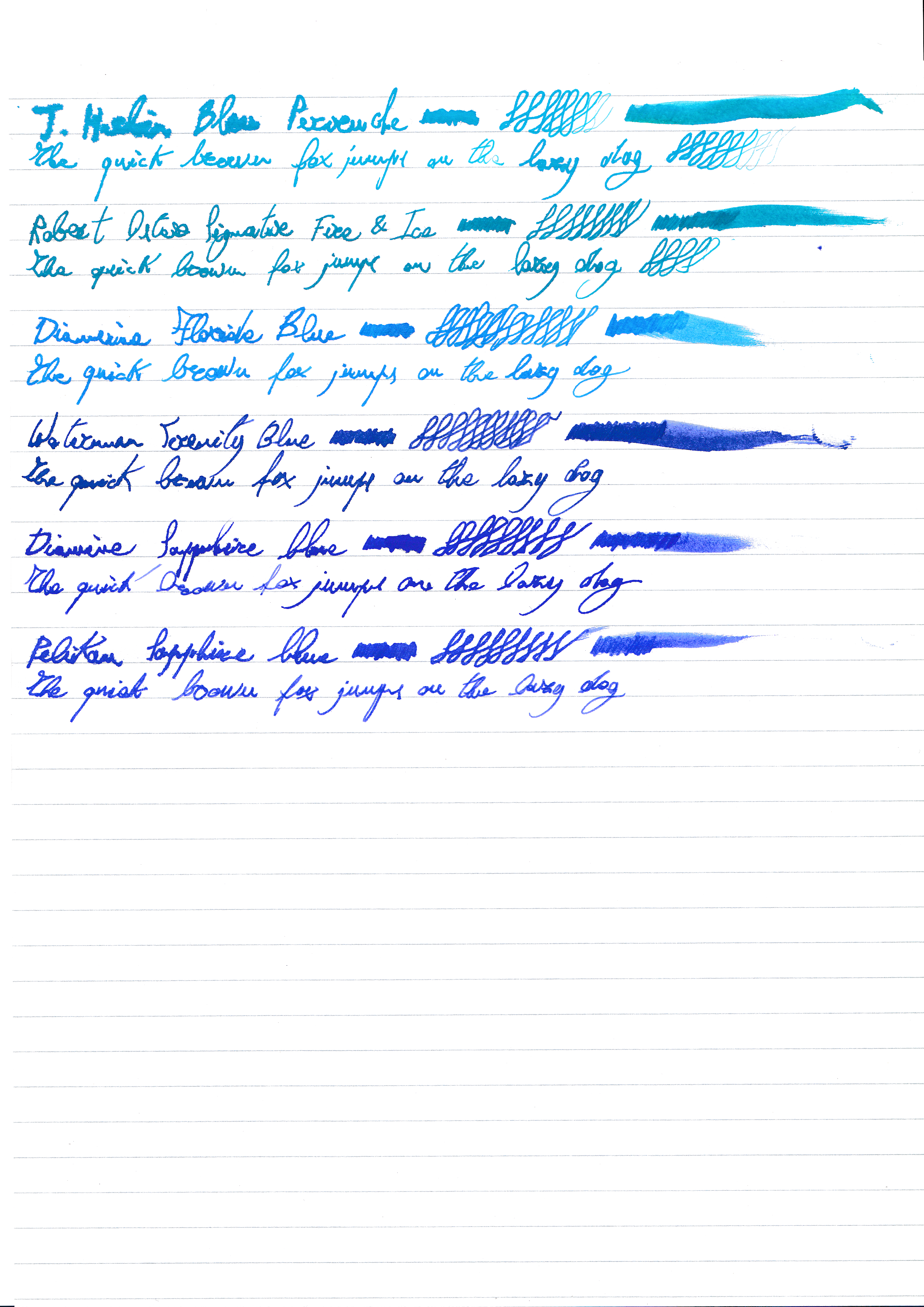 Avvertenza: la saturazione del colore con una glass pen è di gran lunga maggiore rispetto all'uso con stilografica. È l'ideale solo per un confronto di tinte fra loro, non per valutare tempi di asciugatura, variazione di tratto, fluidità dell'inchiostro.