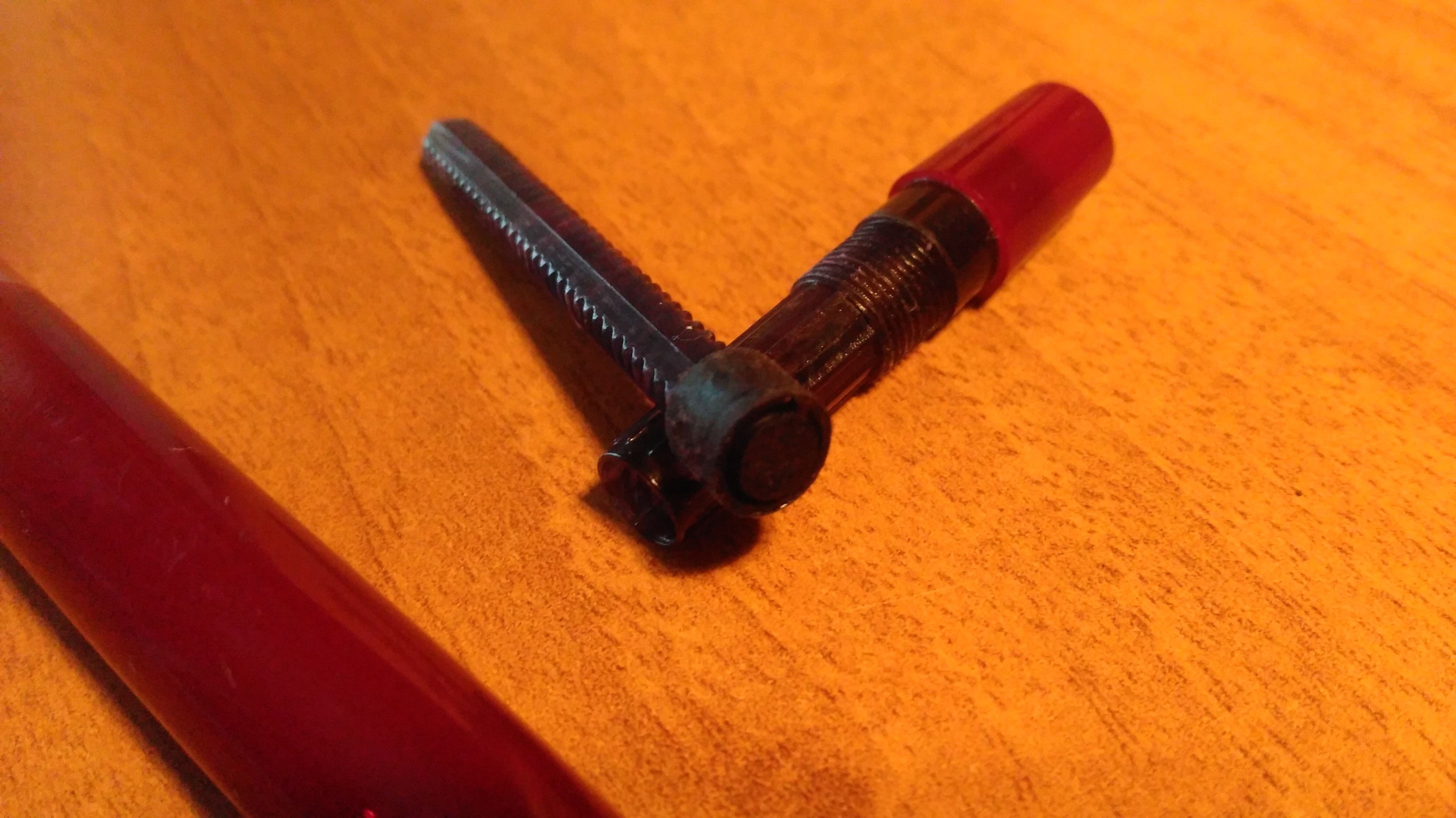 Trattasi di scolastica anonima anni 50 o inizio 60, credo. Era in condizioni pietose e l'ho utilizzata come "palestra". Ho sistemato crepe profonde sulla sezione, altre perdite sul fusto, disincrostato tutto, regolato il pennino, ecc ecc.... e poi ho pensato bene di rovinare la guarnizione. Sono un genio! :silent: