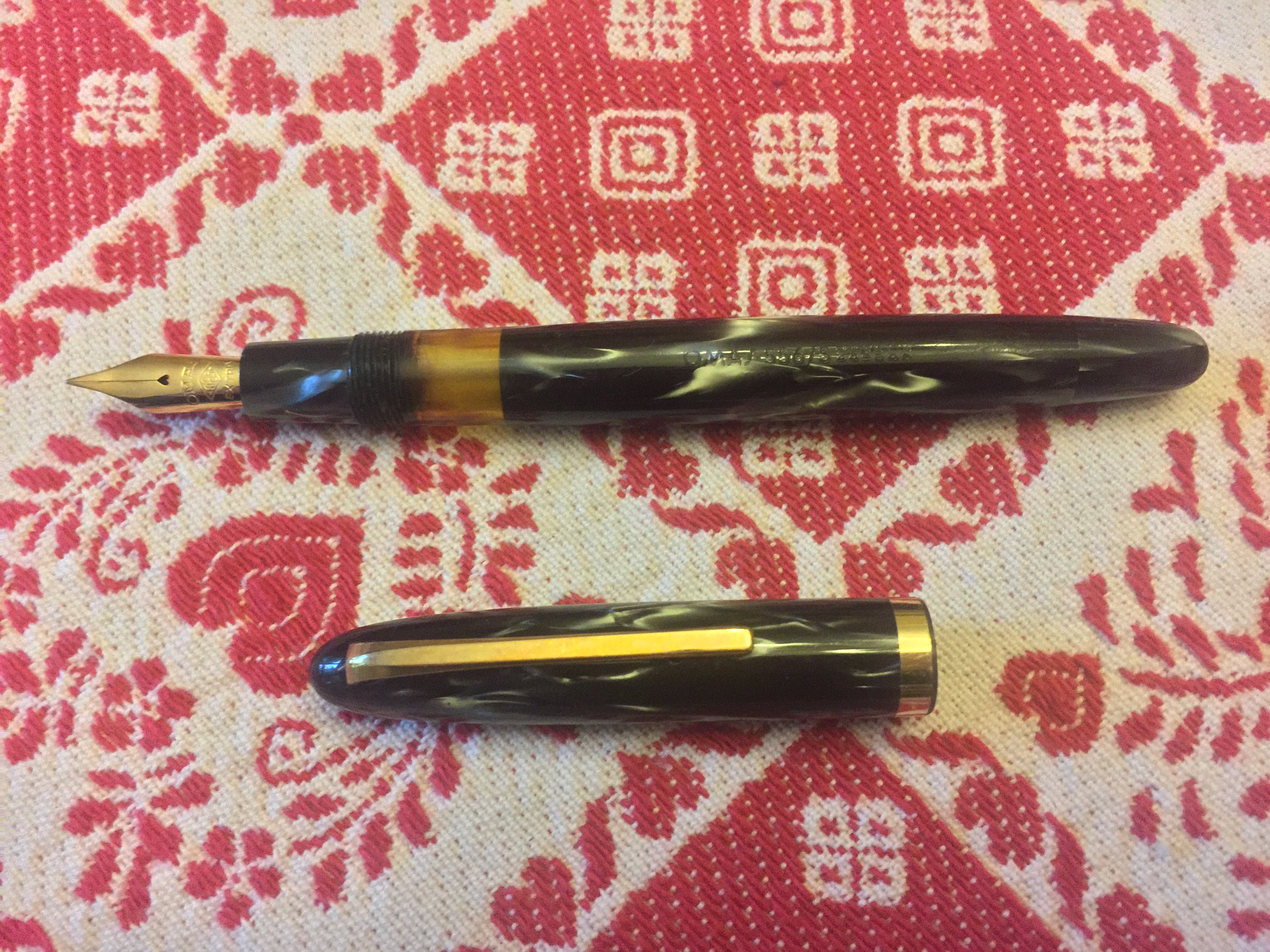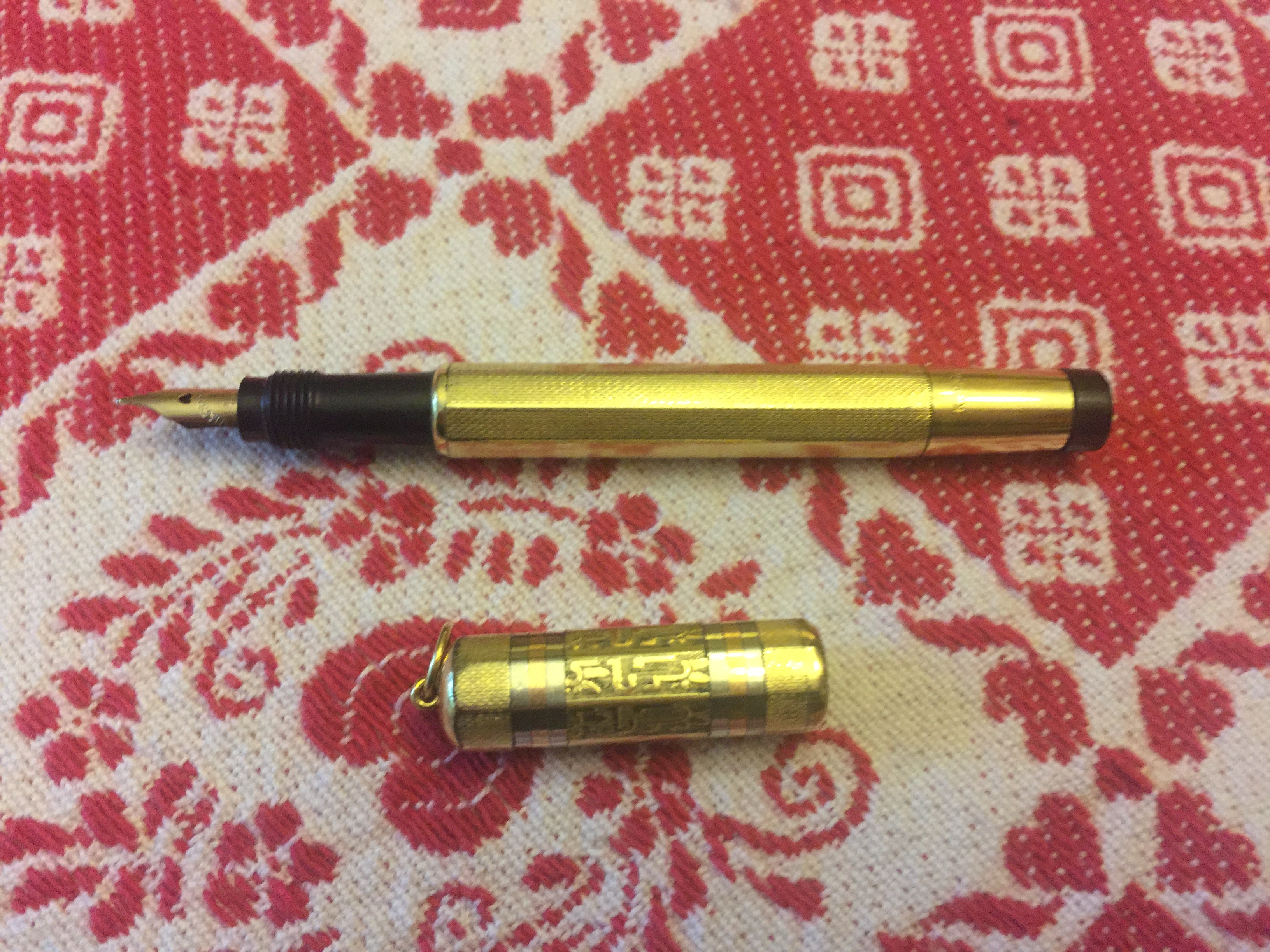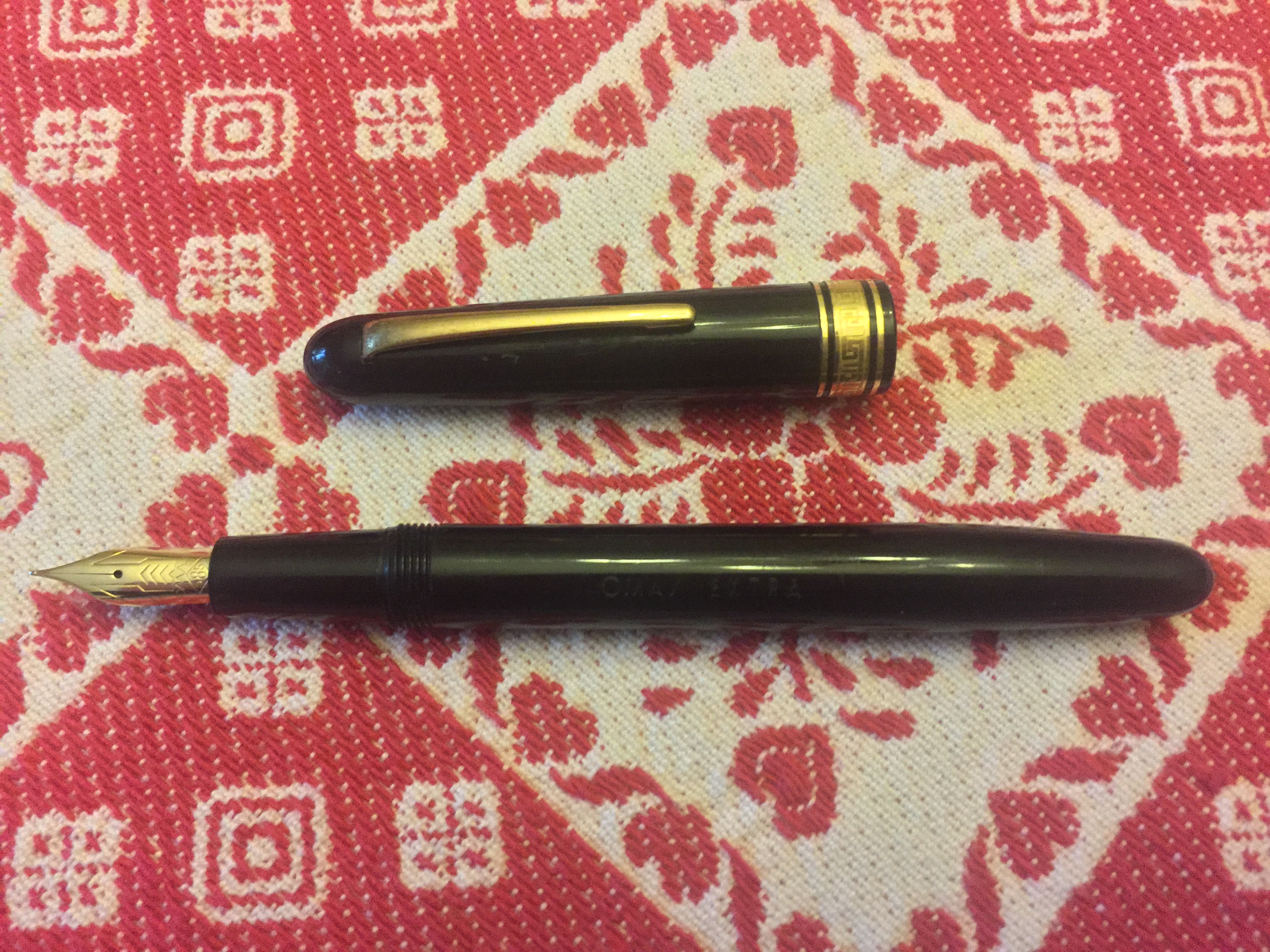 Ecco in carniere le prede dell'ultima fiera antiquaria/modernariato frequentata: tre boccette d'inchiostro vintage Pelikan 4001 blue, Superstilo Gnocchi blue e Pessi nero; rientrante misura lady anonima laminata Kosca, funzionante, in buone condizioni; Omas 556/S colore grey-mabled in ottime condizioni, forse usata pochissimo, funzionante, anni 60; Esterbrook J, pennino acciaio, carica a levetta con ancora il serbatoio inchiostro integro, ottime condizioni funzionante; Omas Extra (555/S), anni 80/90, non presenta il classico restringimento del materiale con cui è assemblata (resina vegetale), pennino oro 585, funzionante in buone condizioni; per finire una Pelikan Silvexa, brushed steel anni 70, pennino acciaio in ottime condizioni, carica cartuccia/converter, funzionante. Allego foto.