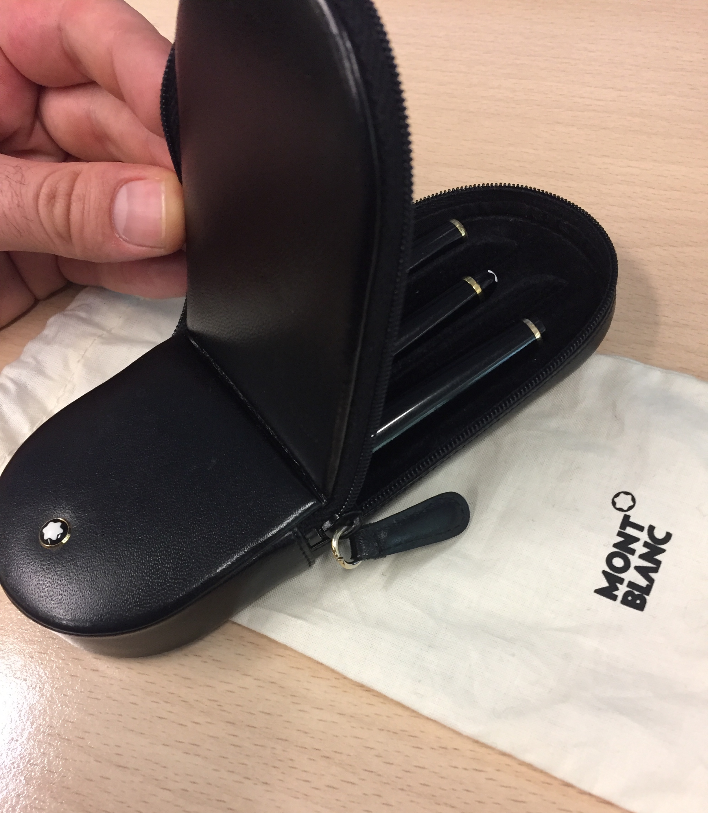 Salve ragazzi, ho comprato questo astuccio Montblanc per 3 penne semi rigido ad un ottimo prezzo. Dalla pelle, rifiniture e logo mi sembra originale, ma non sono riuscito a trovare alcun riferimento fotografico/informativo sull’oggetto. Potete aiutarmi? Grazie mille come al solito